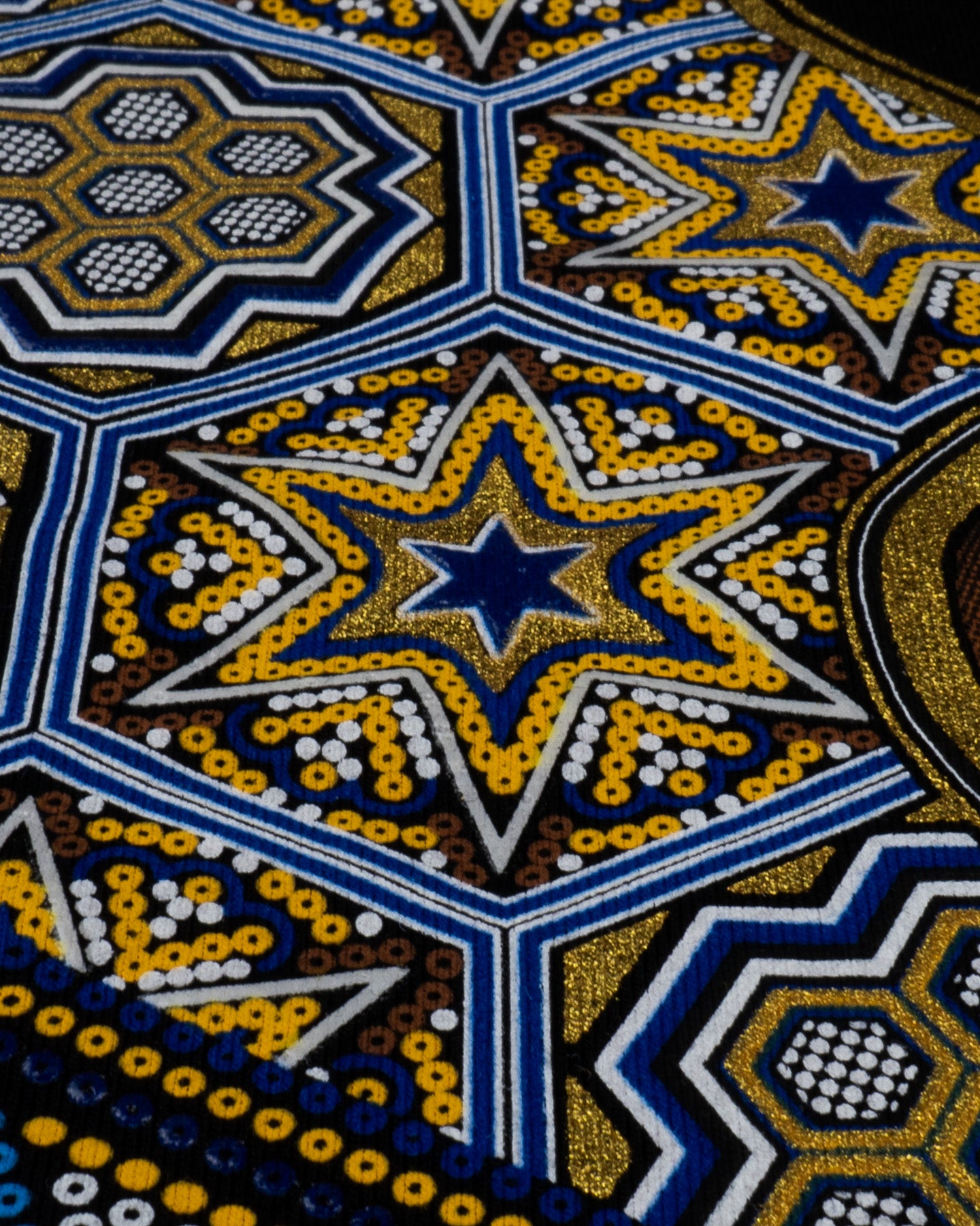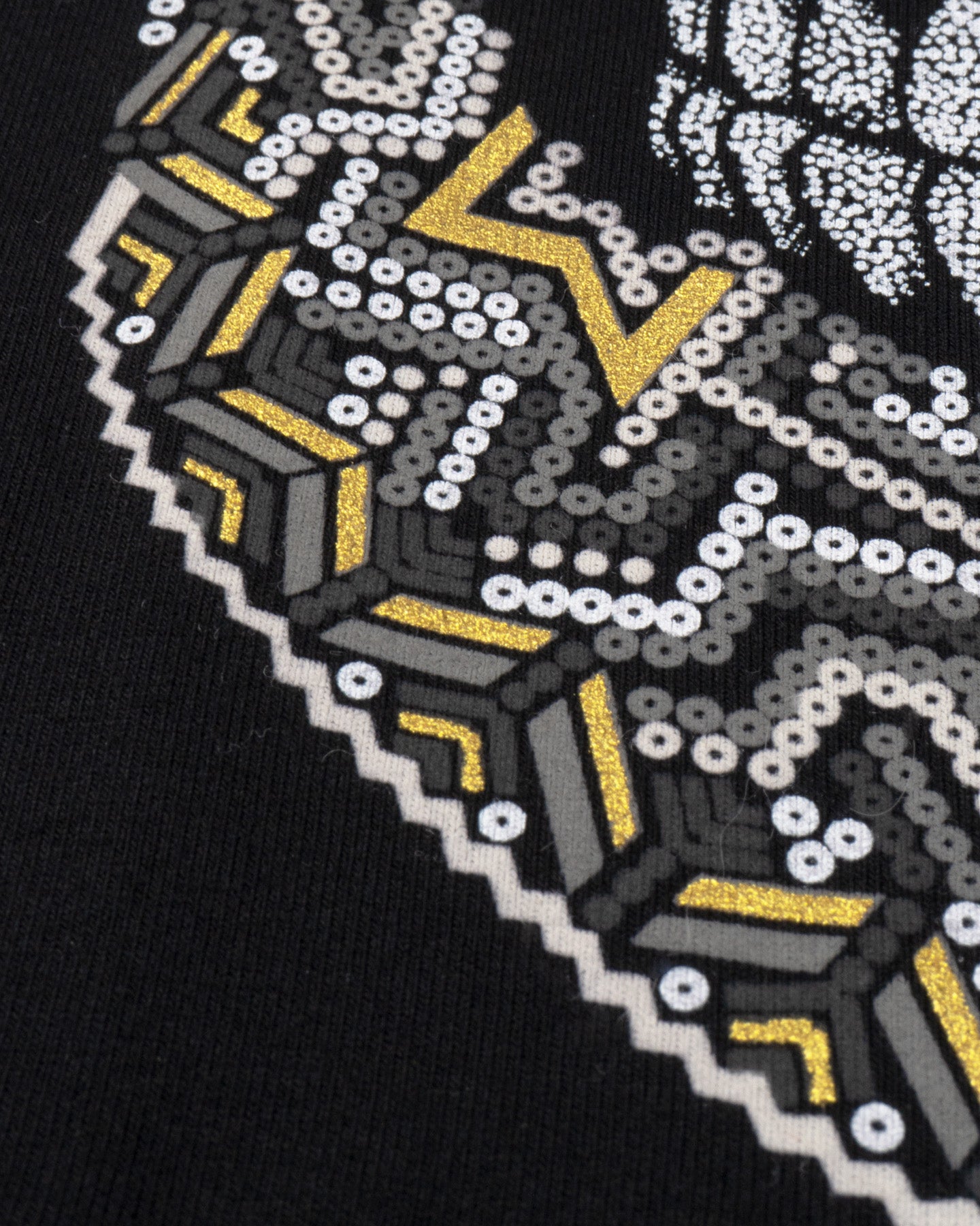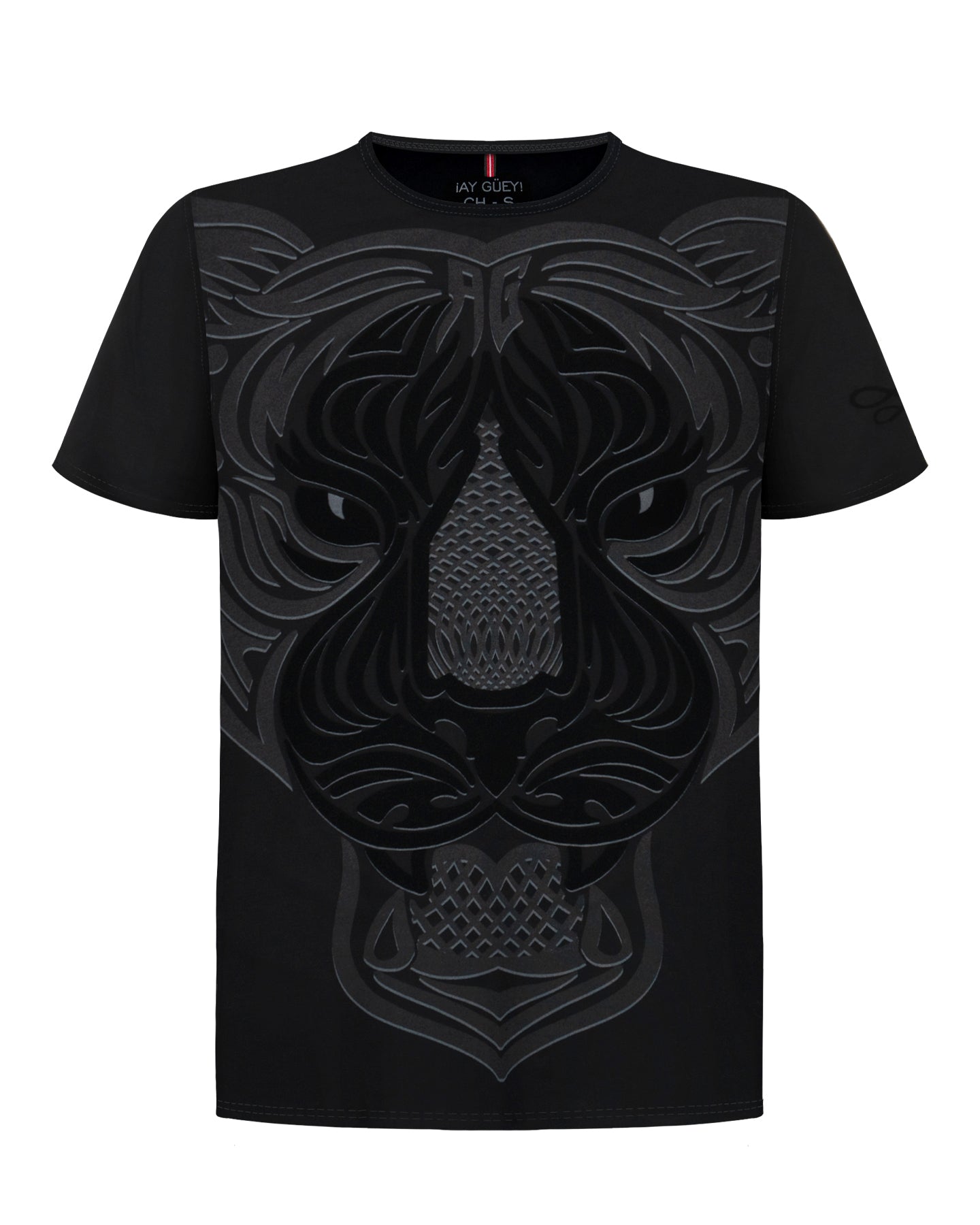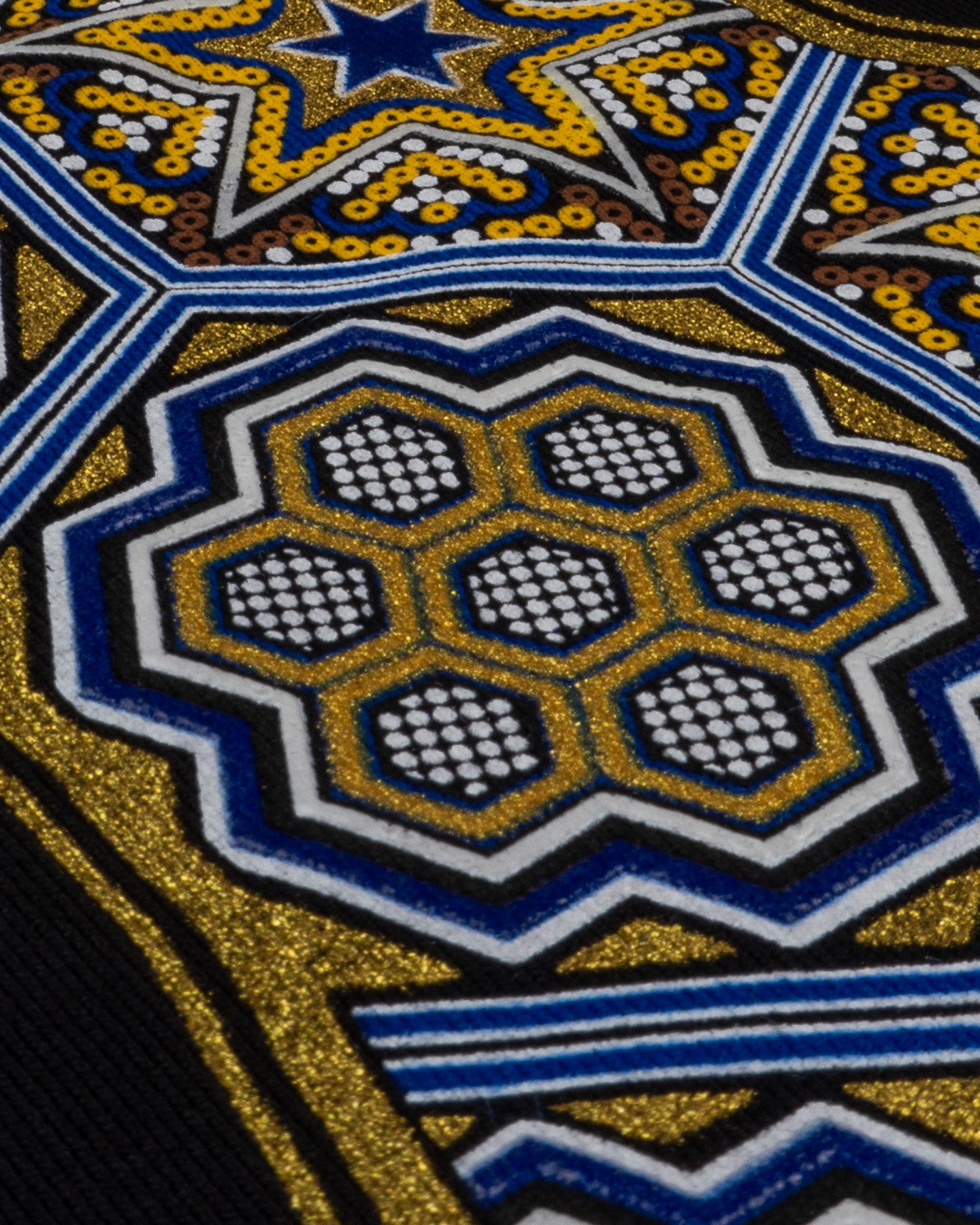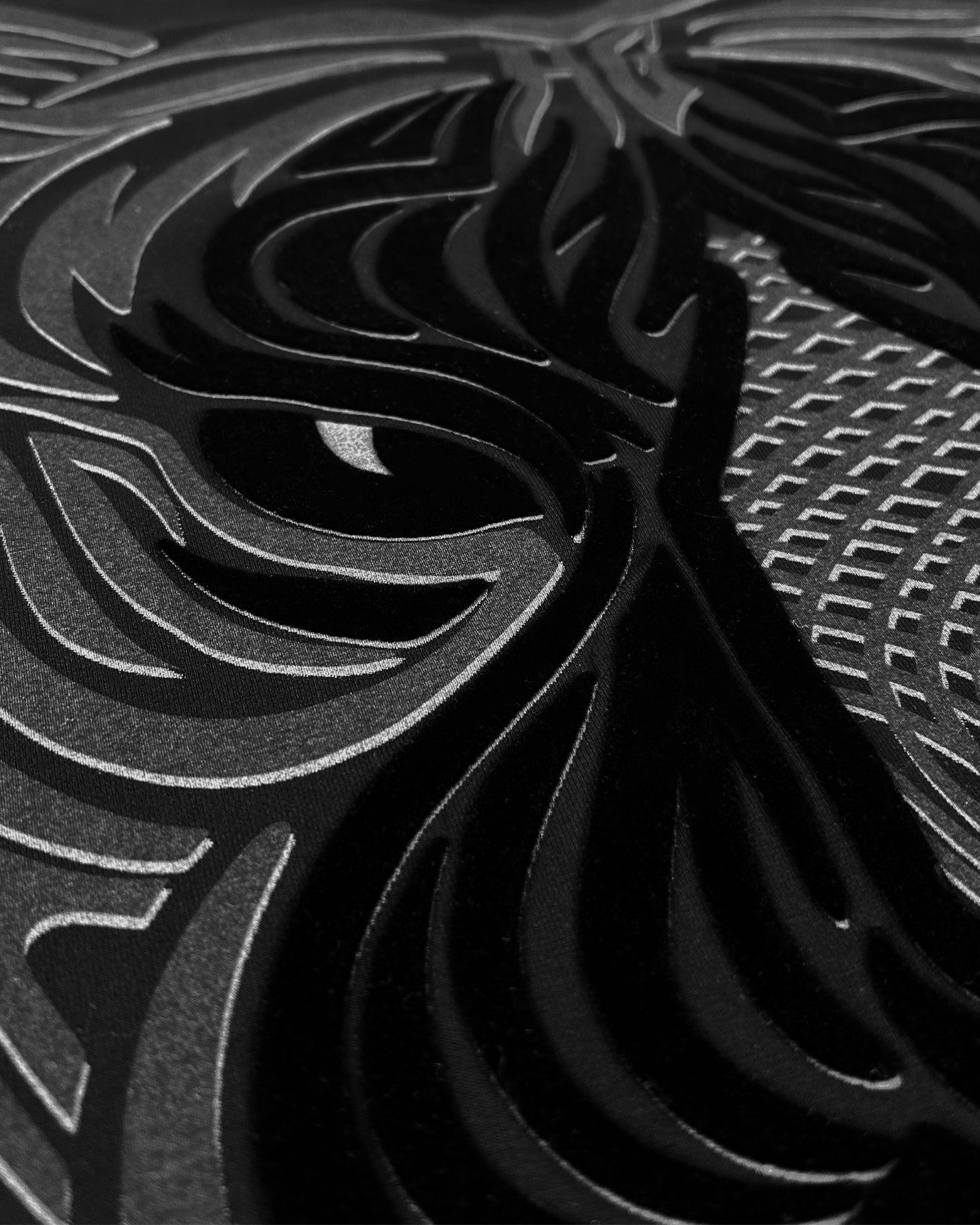 Estampado vibrante de un majestuoso jaguar (Balam) rodeado de motivos florales y botánicos en tonos shocking. Una explosión de glamour tropical y arte audaz.