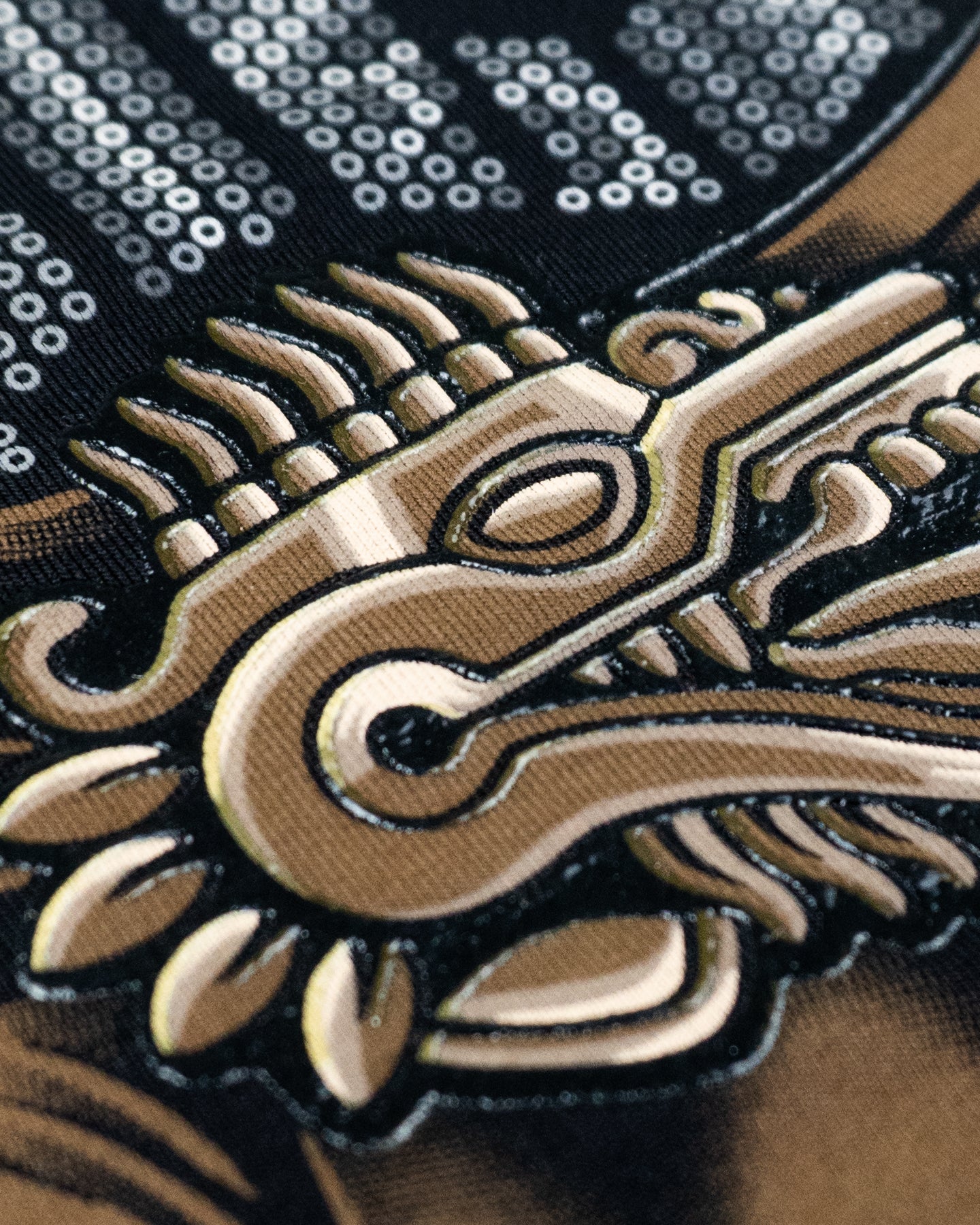 Estilo varsity en rojo intenso y mangas off-white. El reverso presenta la palabra "México" delicadamente bordada en hilo dorado, ofreciendo un look discreto pero elegante.