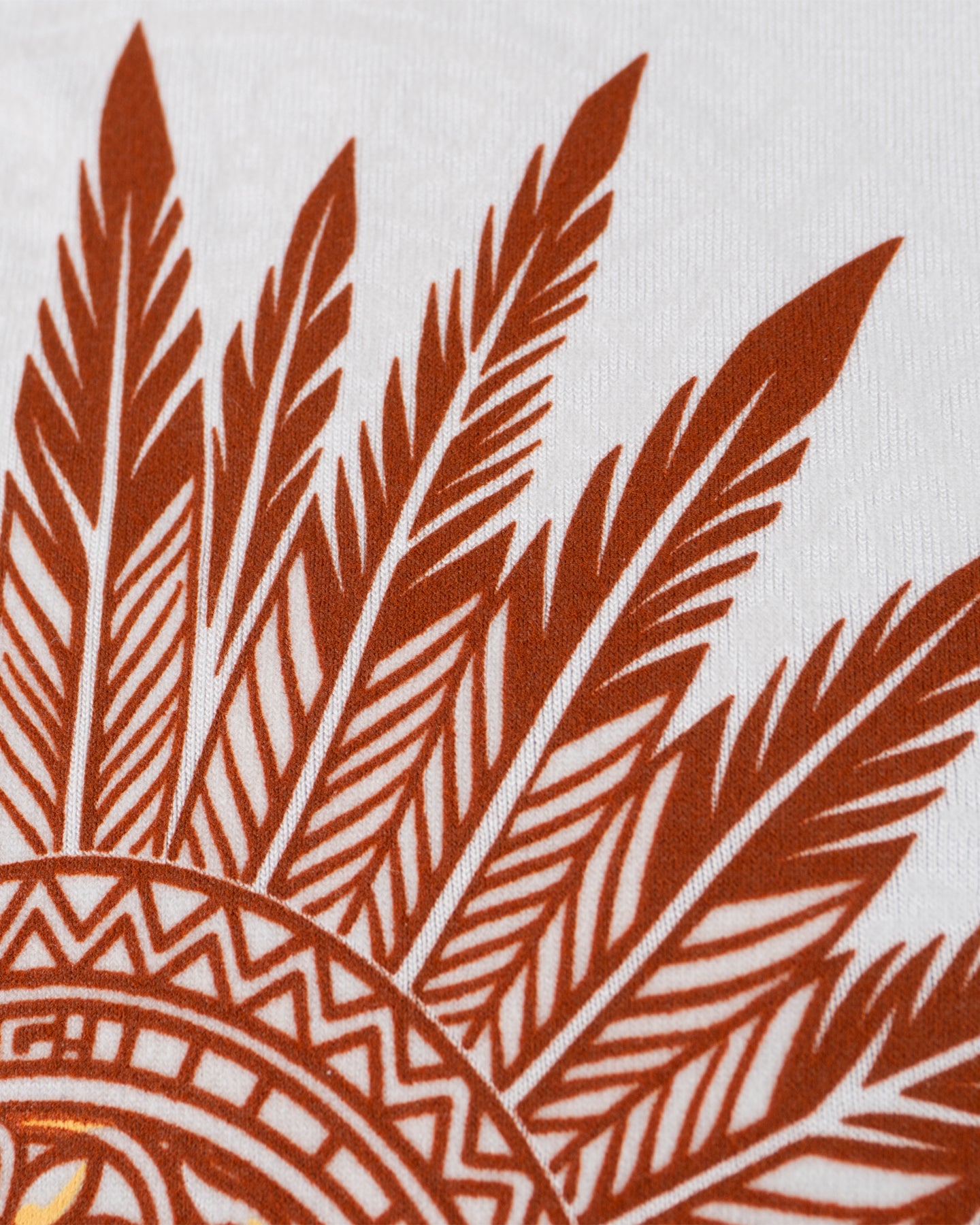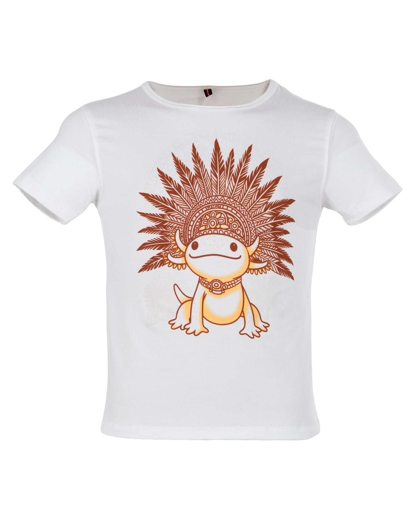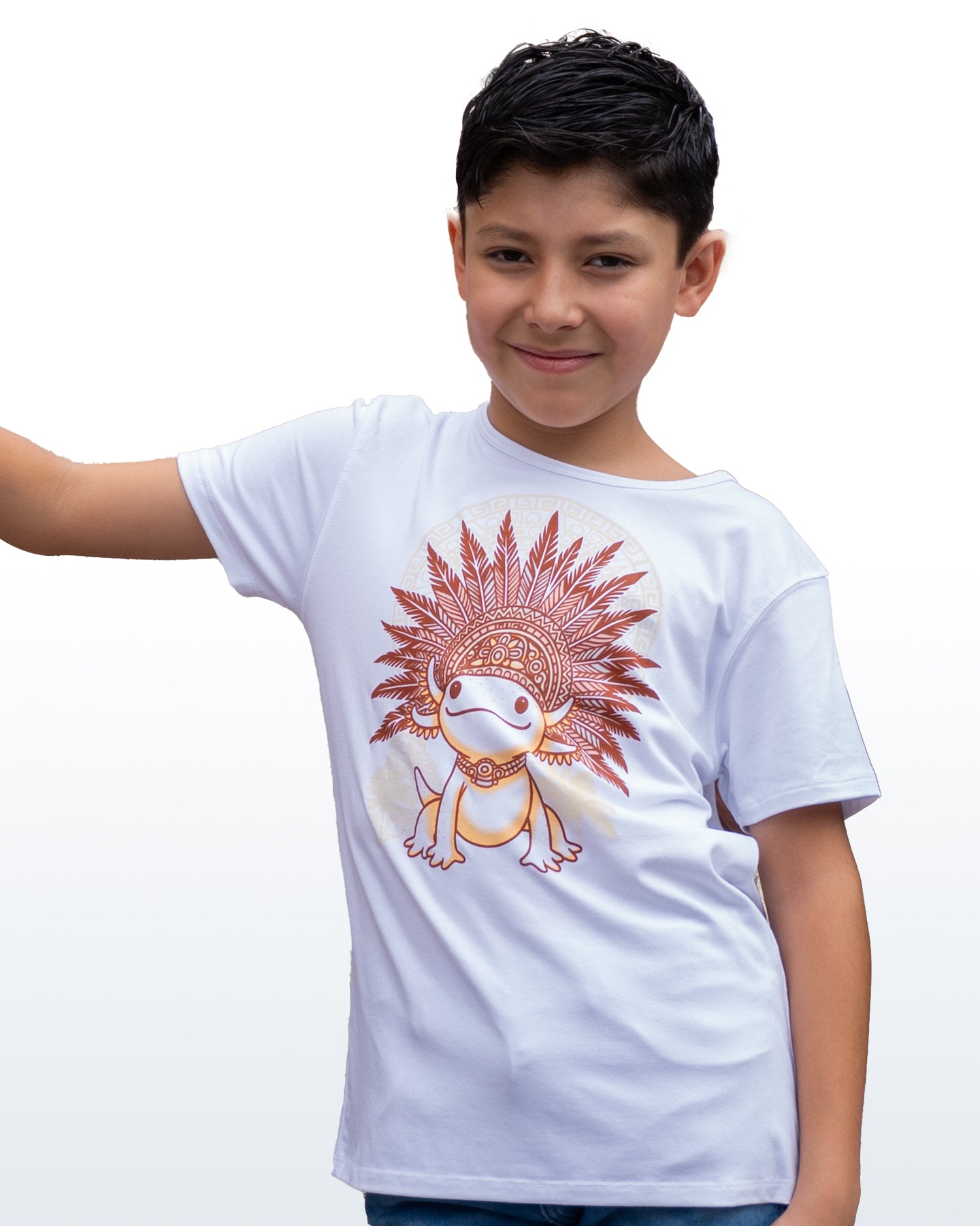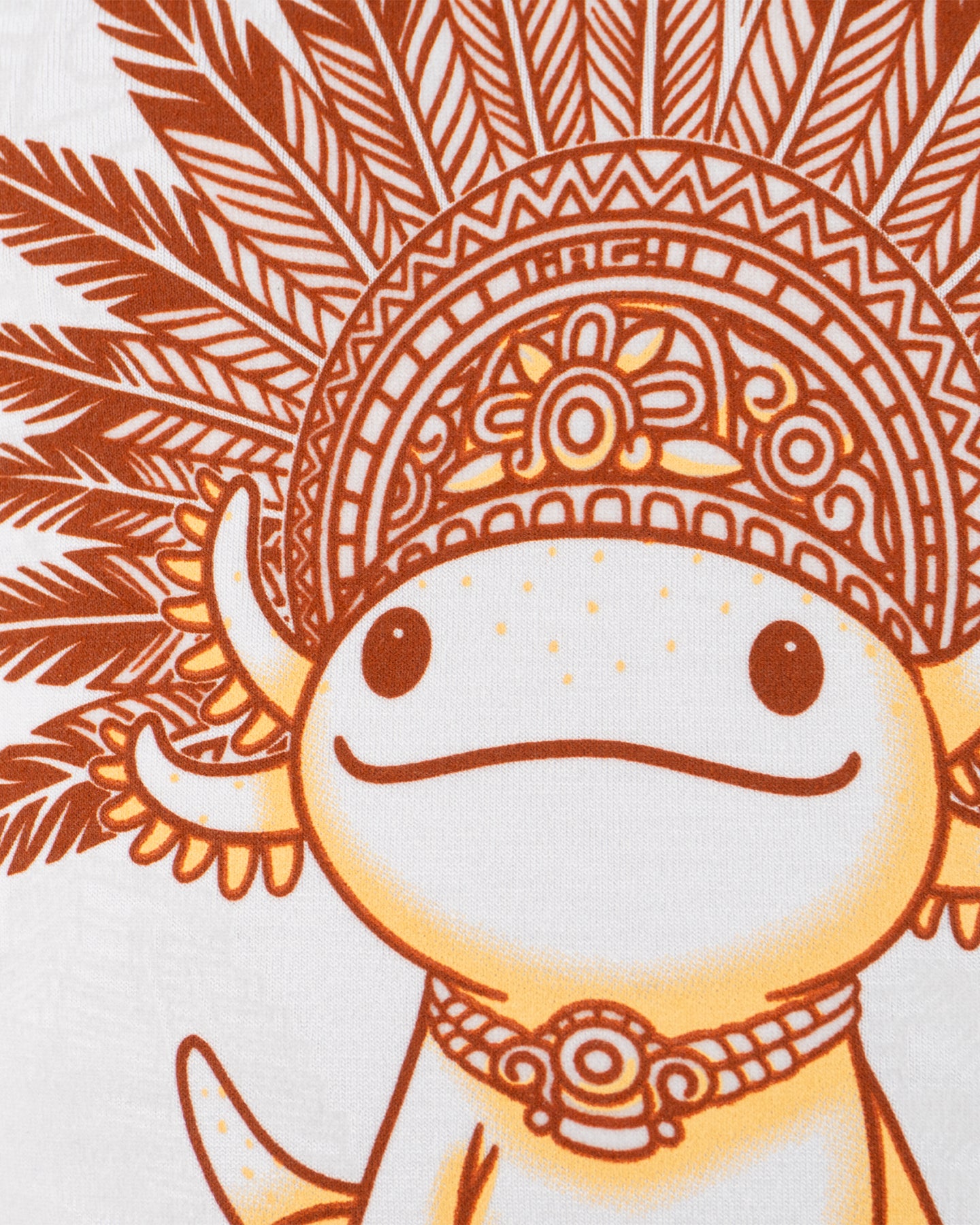 Esta playera nace de la fusión entre la fauna endémica mexicana y la herencia prehispánica. El ajolote, símbolo de regeneración y sabiduría ancestral, es representado aquí con un penacho ceremonial que evoca la grandeza de las culturas mexica y maya. Su gesto tierno y sereno recuerda que el poder no siempre viene del rugido, sino también de la calma.