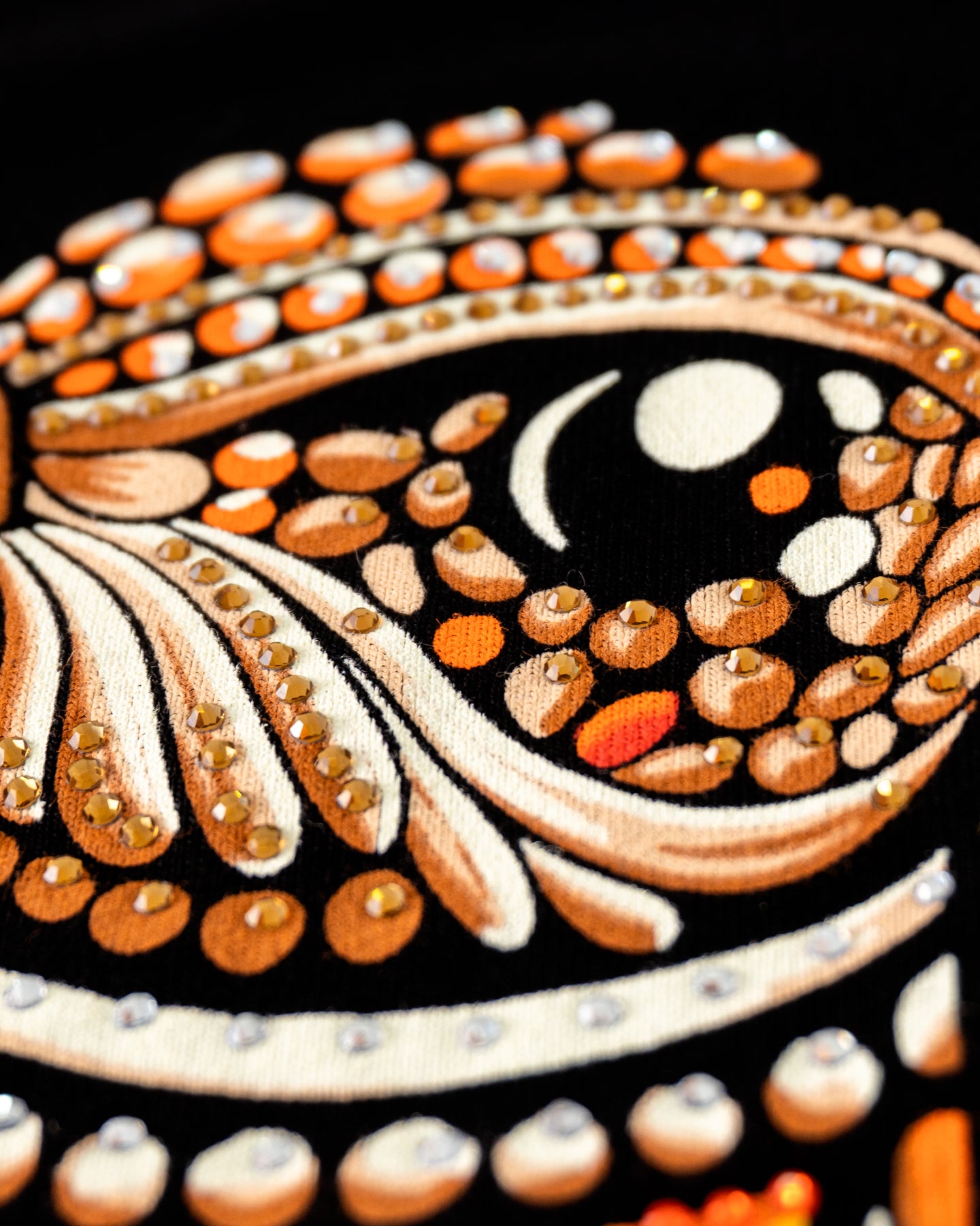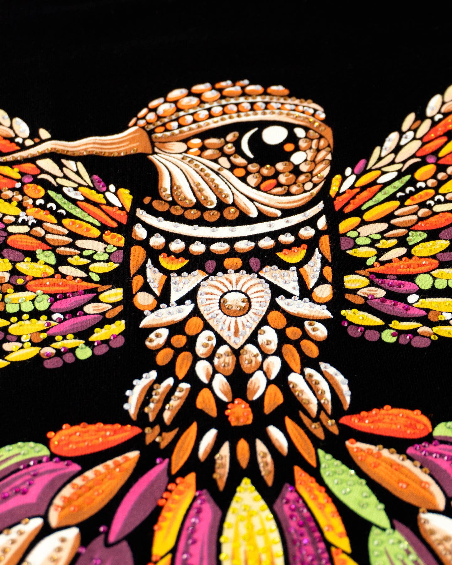 Este diseño original está inspirado en el colibrí mexicano, símbolo de esperanza, amor y energía. Sus alas, formadas por pétalos multicolores, evocan la abundancia de la naturaleza. En la parte trasera, un corazón floral refuerza el mensaje de amor y fuerza interior. Viste ropa mexicana que te conecta con tus raíces y celebra la vida con estilo. ¡Una pieza única de moda con identidad!