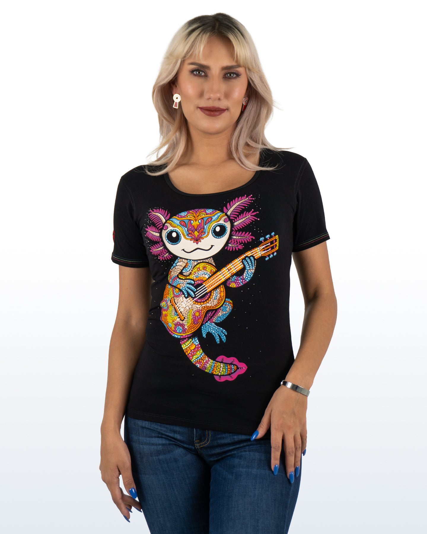 Luce la magia de México con tu playera Tololoche. Un diseño único inspirado en el ajolote y el arte del vitral, que celebra nuestra identidad mexicana a través de símbolos culturales y la esencia vibrante de nuestra música.