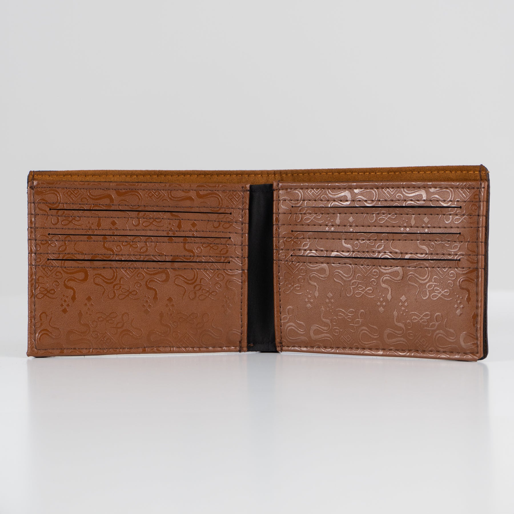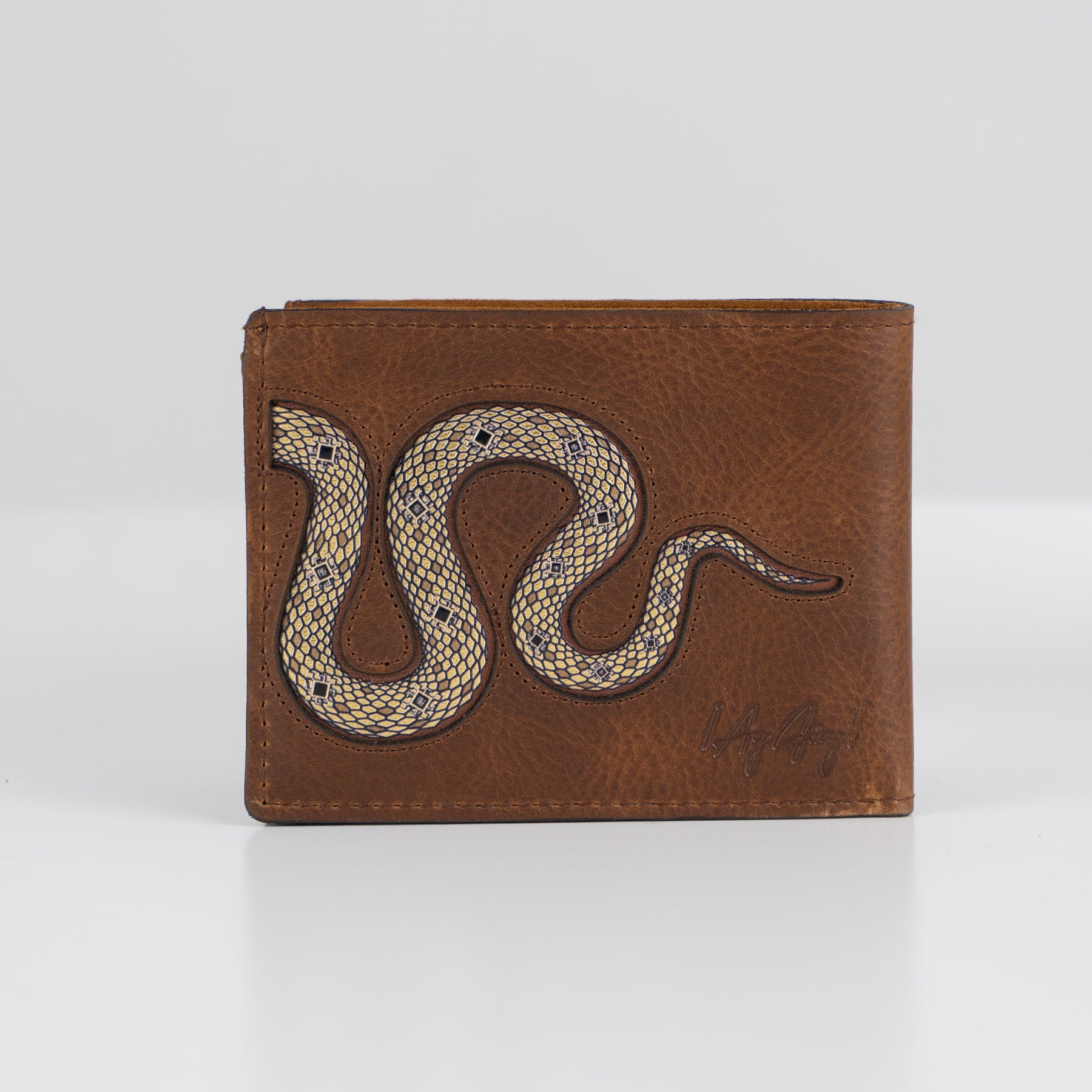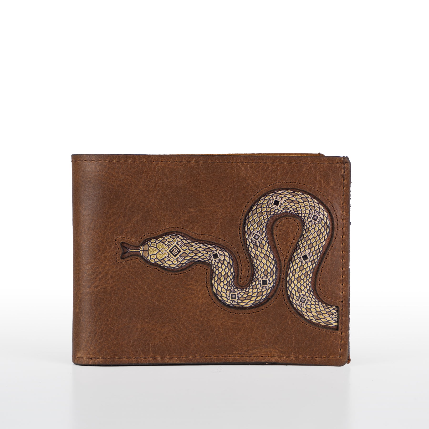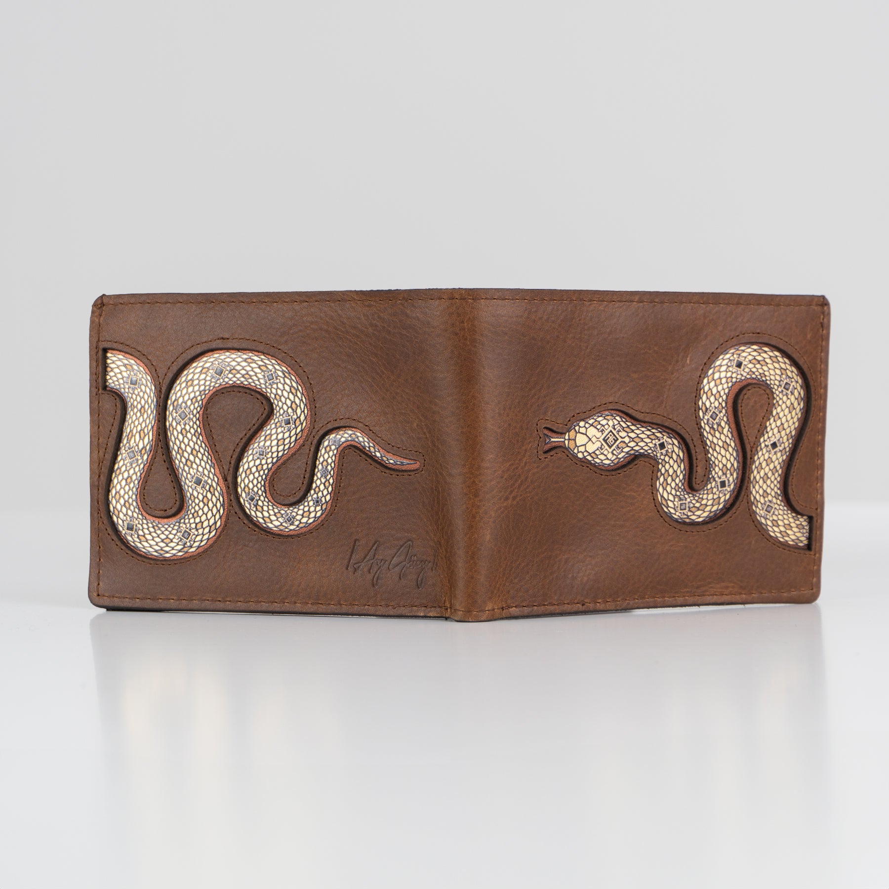 Cartera de piel en color café con gráfico de serpiente en tonos dorados.