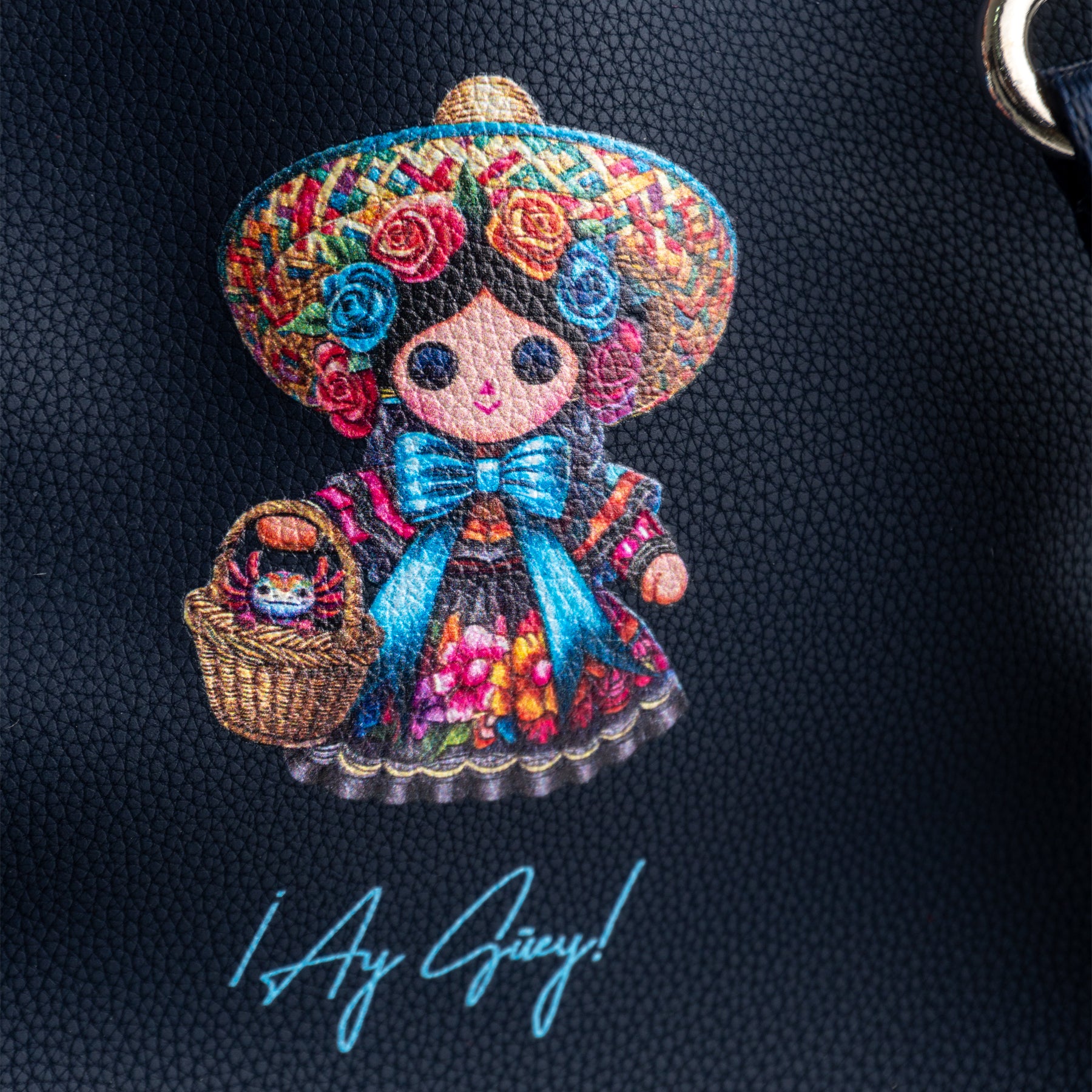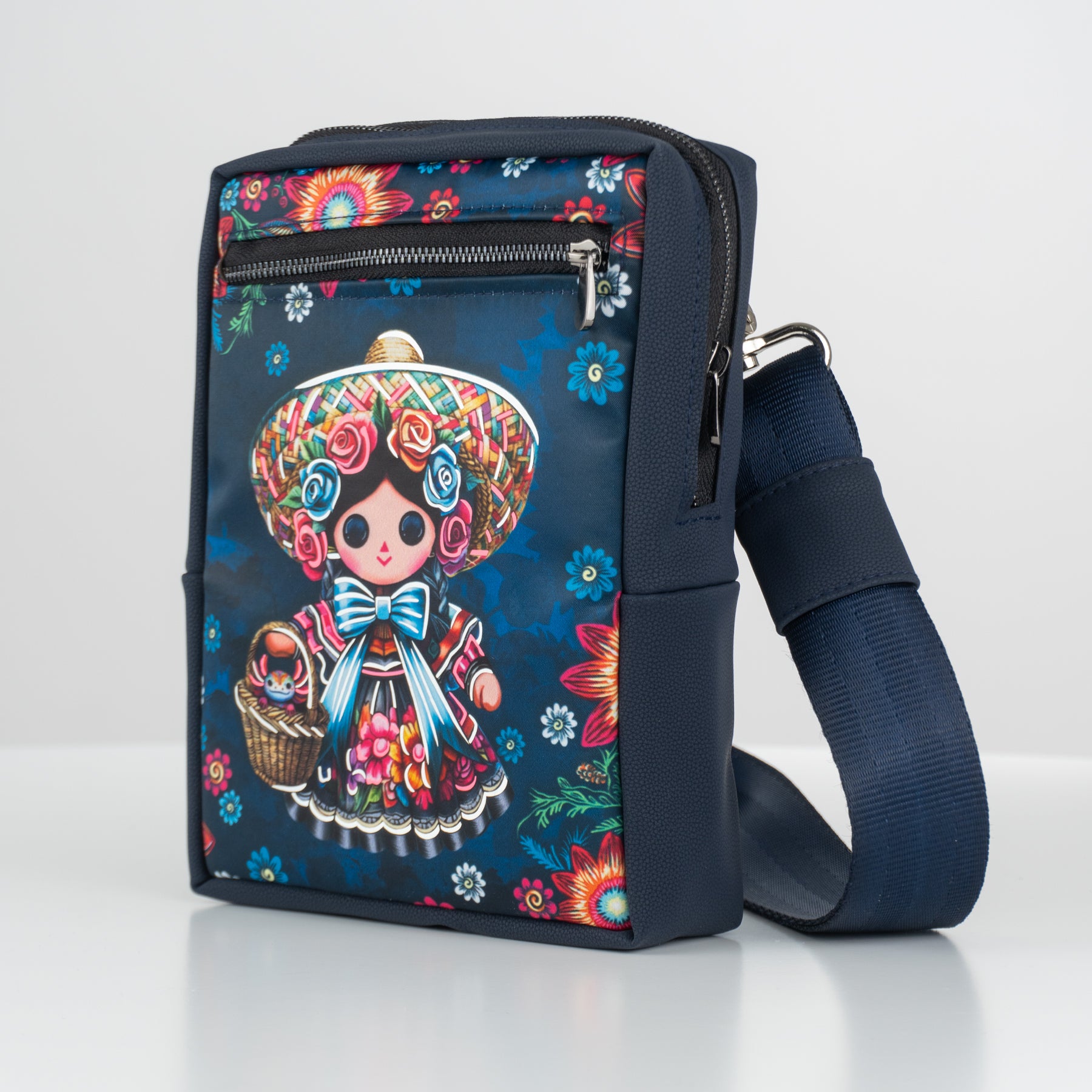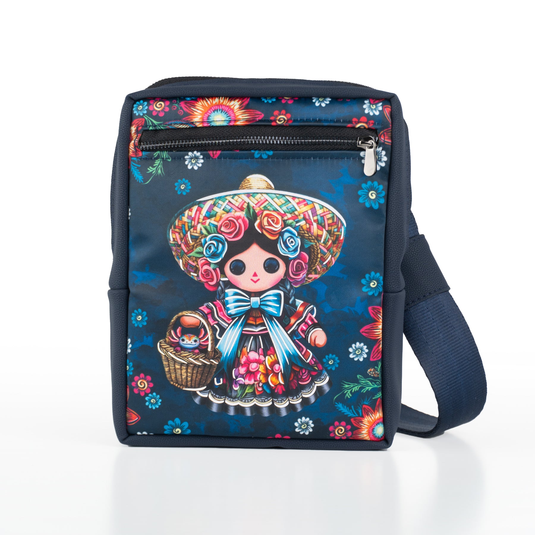 Mochila tipo bandolera, con correa de de tela, inspirada en Petrita, nuestra reinterpretación de la muñeca mazahua y en las artesanías elaboradas con hojas de maíz.
