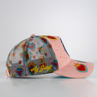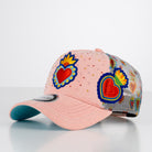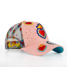 Paneles frontales y visera en suave gamuza sintética color rosa pálido, con aplicaciones de pedrería y corazones mexicanos bordados o de fieltro. Malla trasera con estampado floral multicolor. Detalles: Bordado lateral con la marca en colores vibrantes, parte inferior de la visera en color azul turquesa.