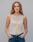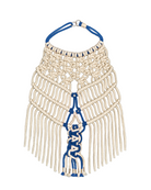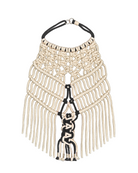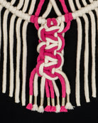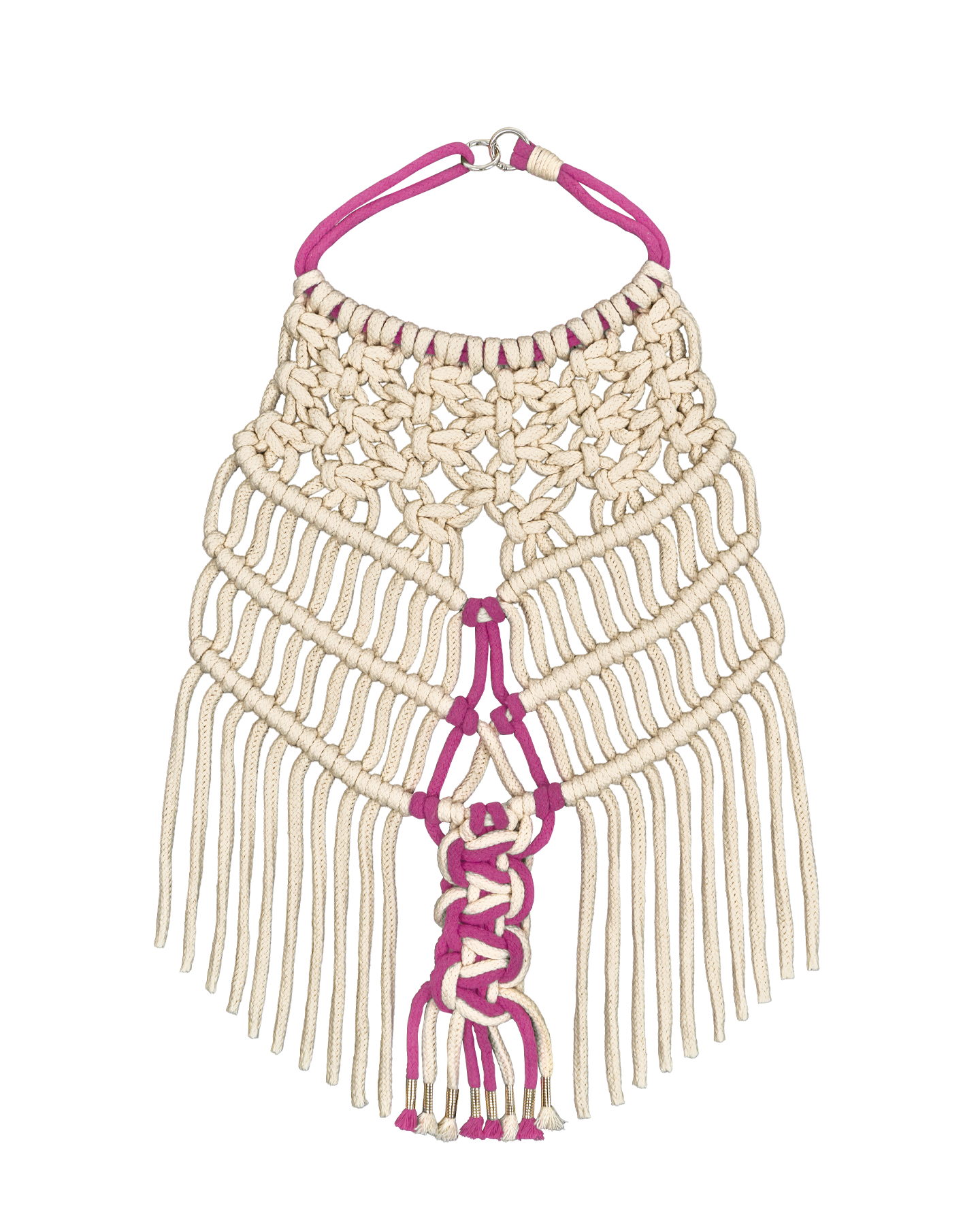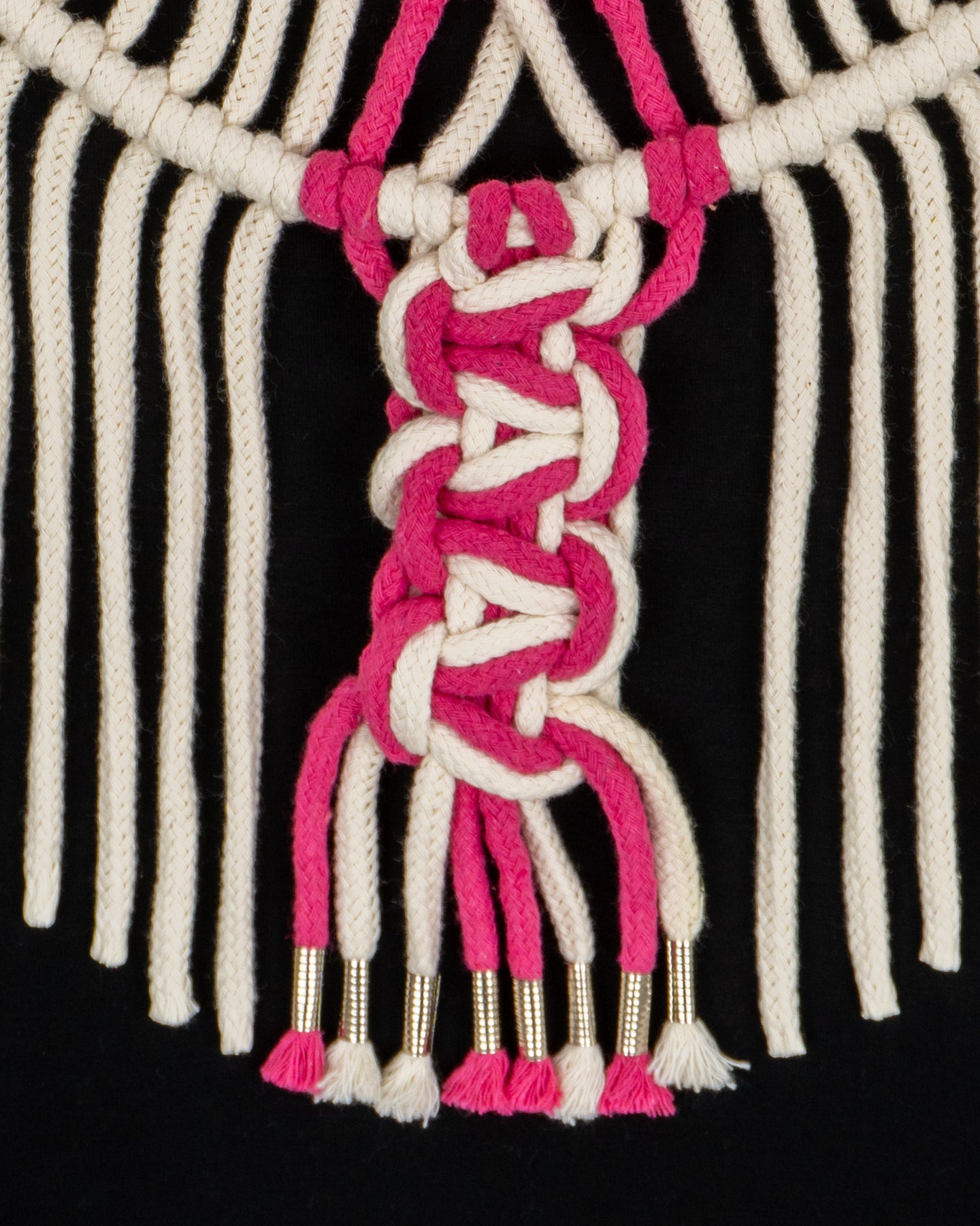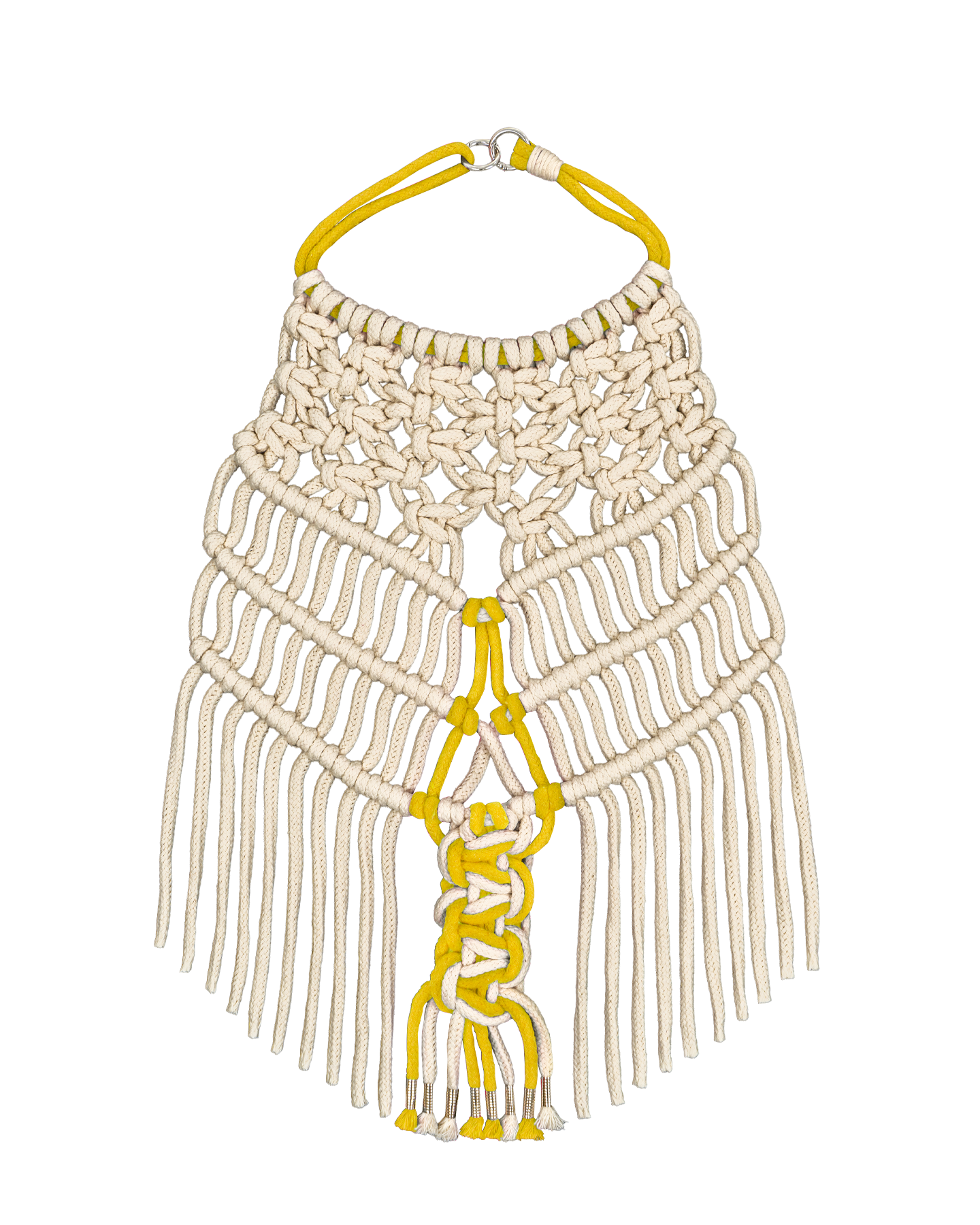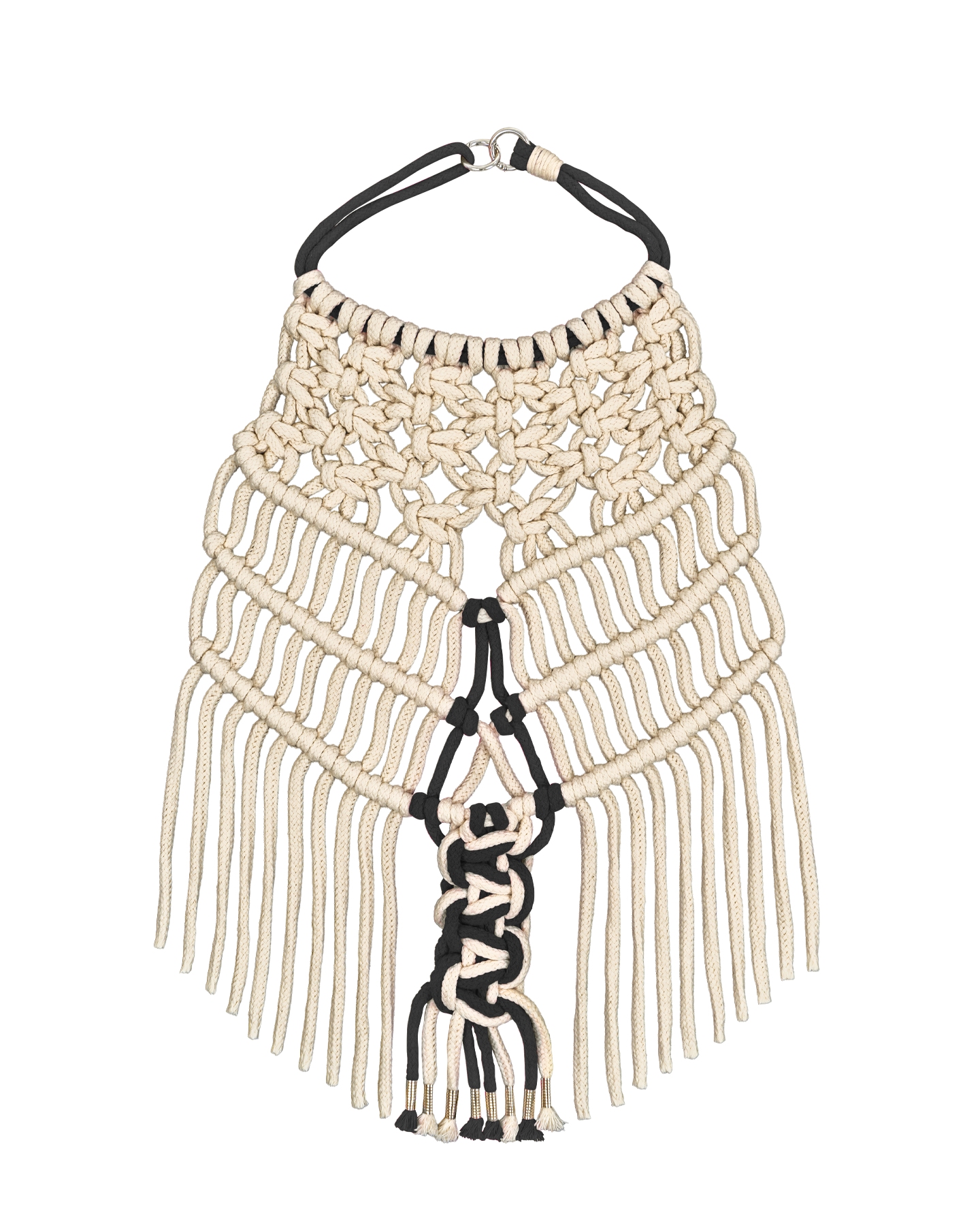 Con un contraste de tonos neutros (crudo) y toques definidos en color, el diseño exhibe una arquitectura de nudos y flecos que demuestran el dominio de la técnica Macrawave.