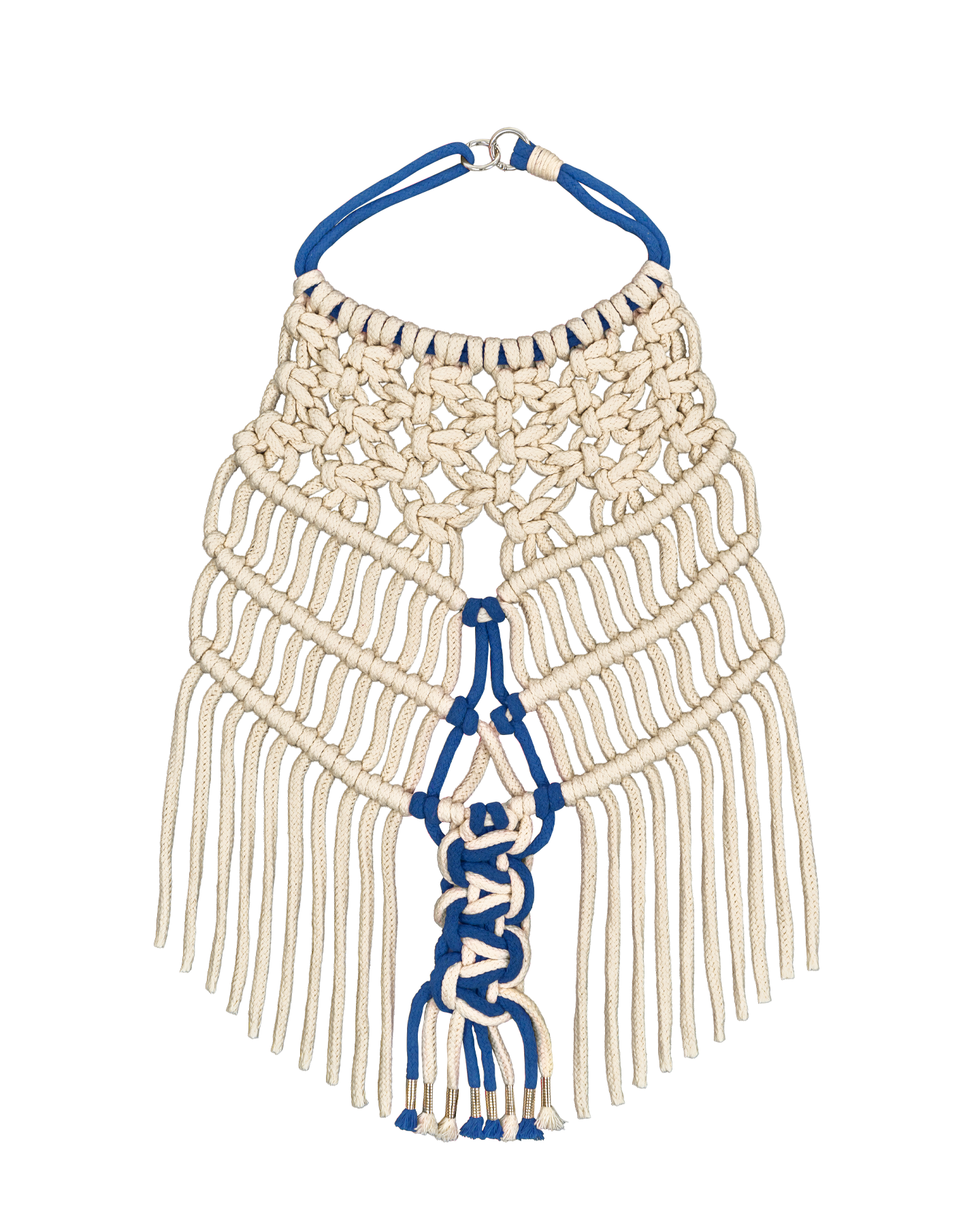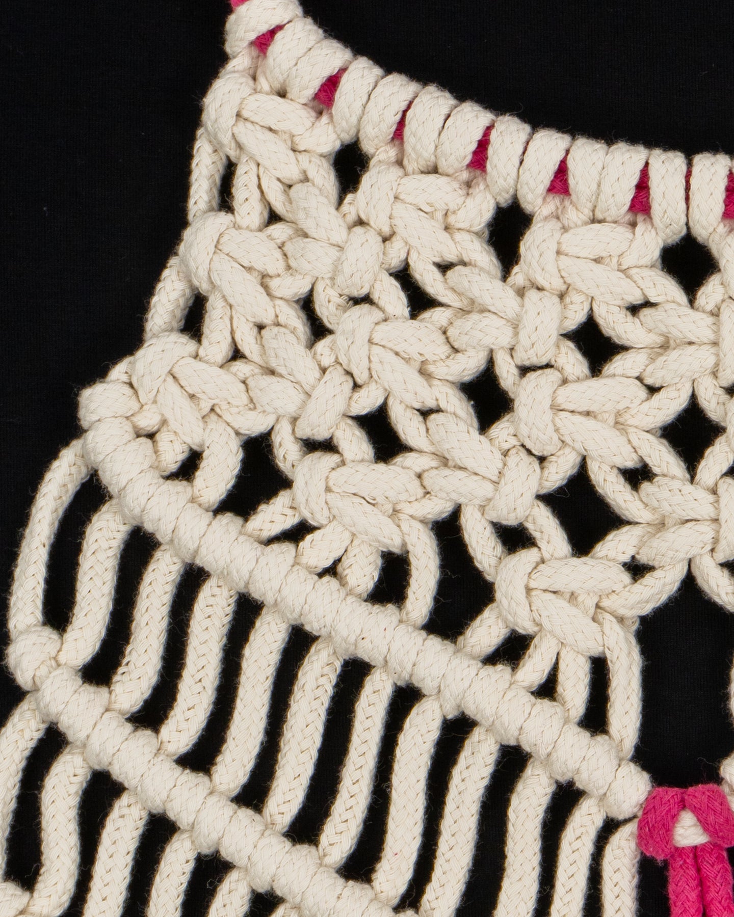 Esta Pechera es una pieza de impacto visual que transforma el accesorio en un elemento central de diseño. Diseñada por Musgo Studio, representa la aplicación experta del Anudado Textil Contemporáneo, donde la cuerda se convierte en una estructura compleja y sofisticada, fruto de la técnica, la intención y el respeto por el proceso manual.