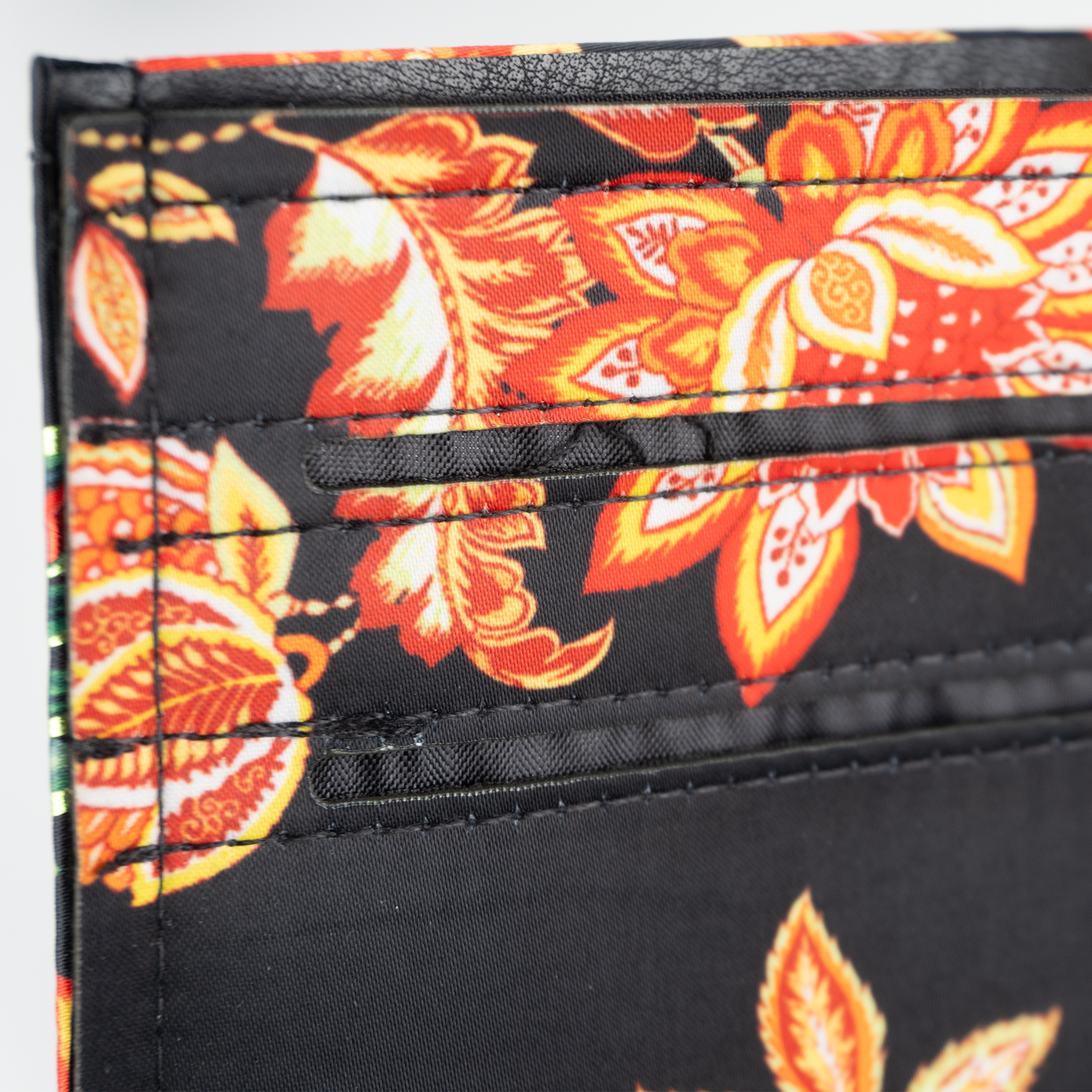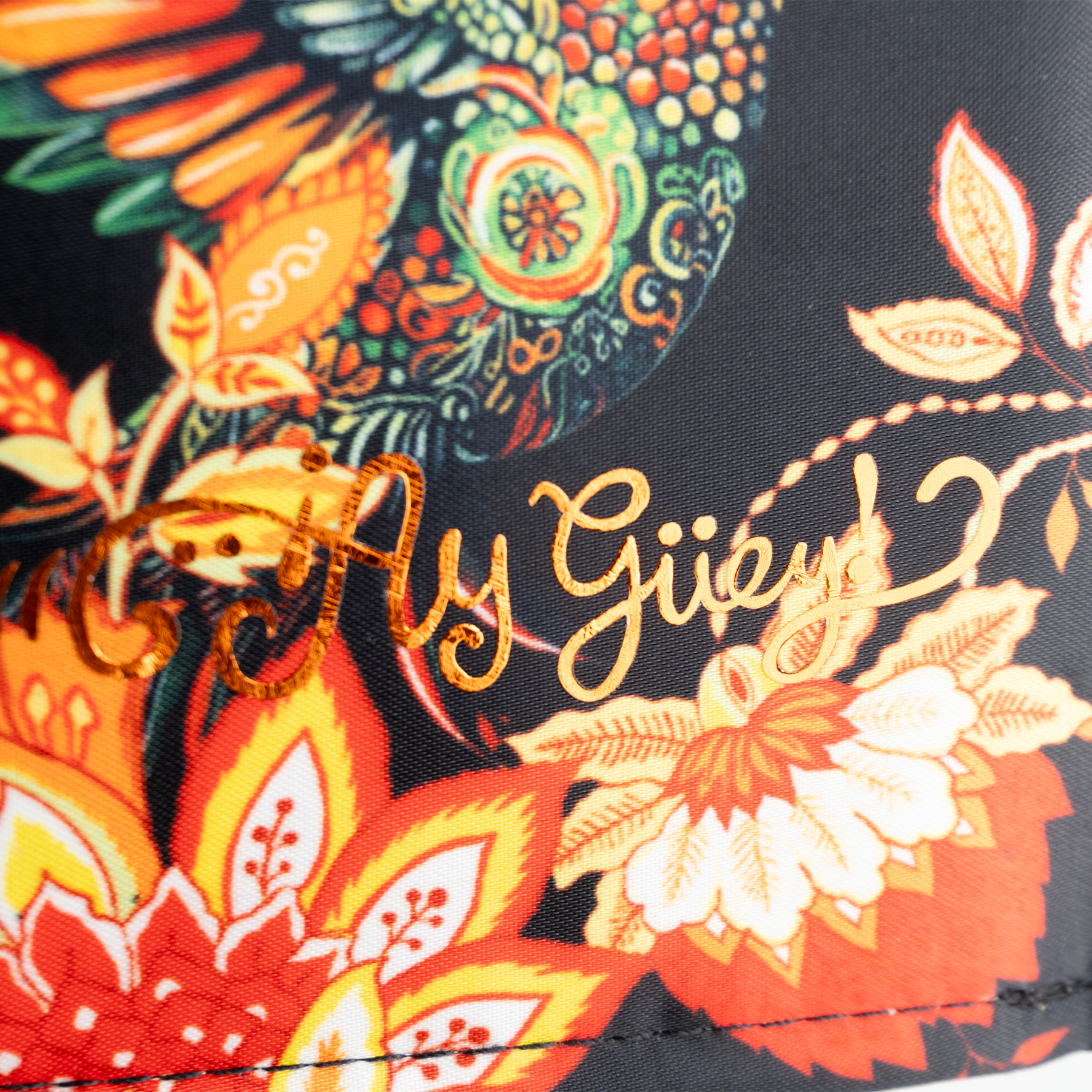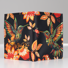 Billetera en tonos naranjas, verde y negros que tiene como protagonista al colibrí, el mensajero de los buenos deseos.