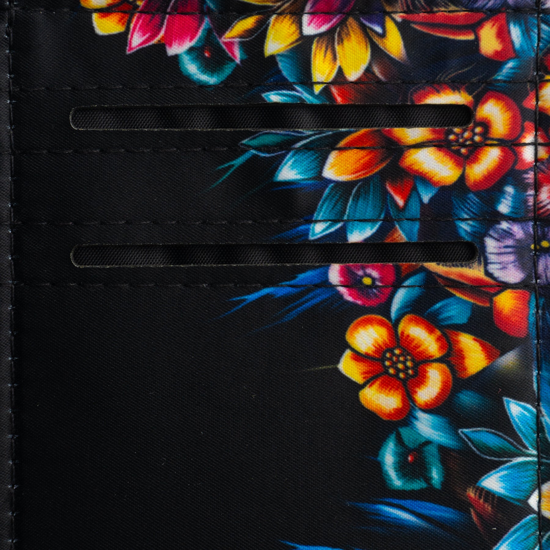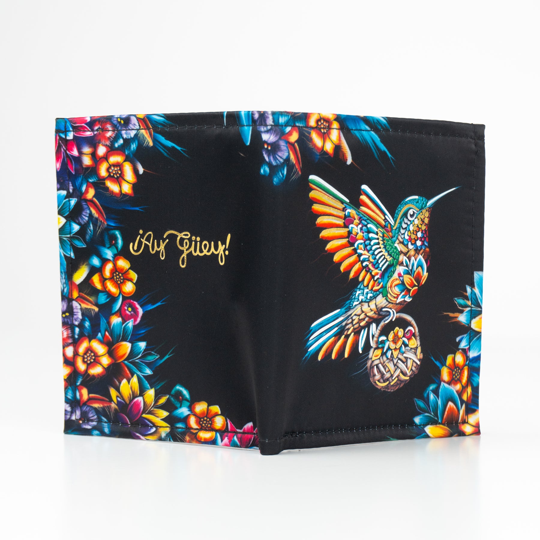 Billetera en color negro y foil metalizado inspirado en los colibrís y el colorido de la primavera.