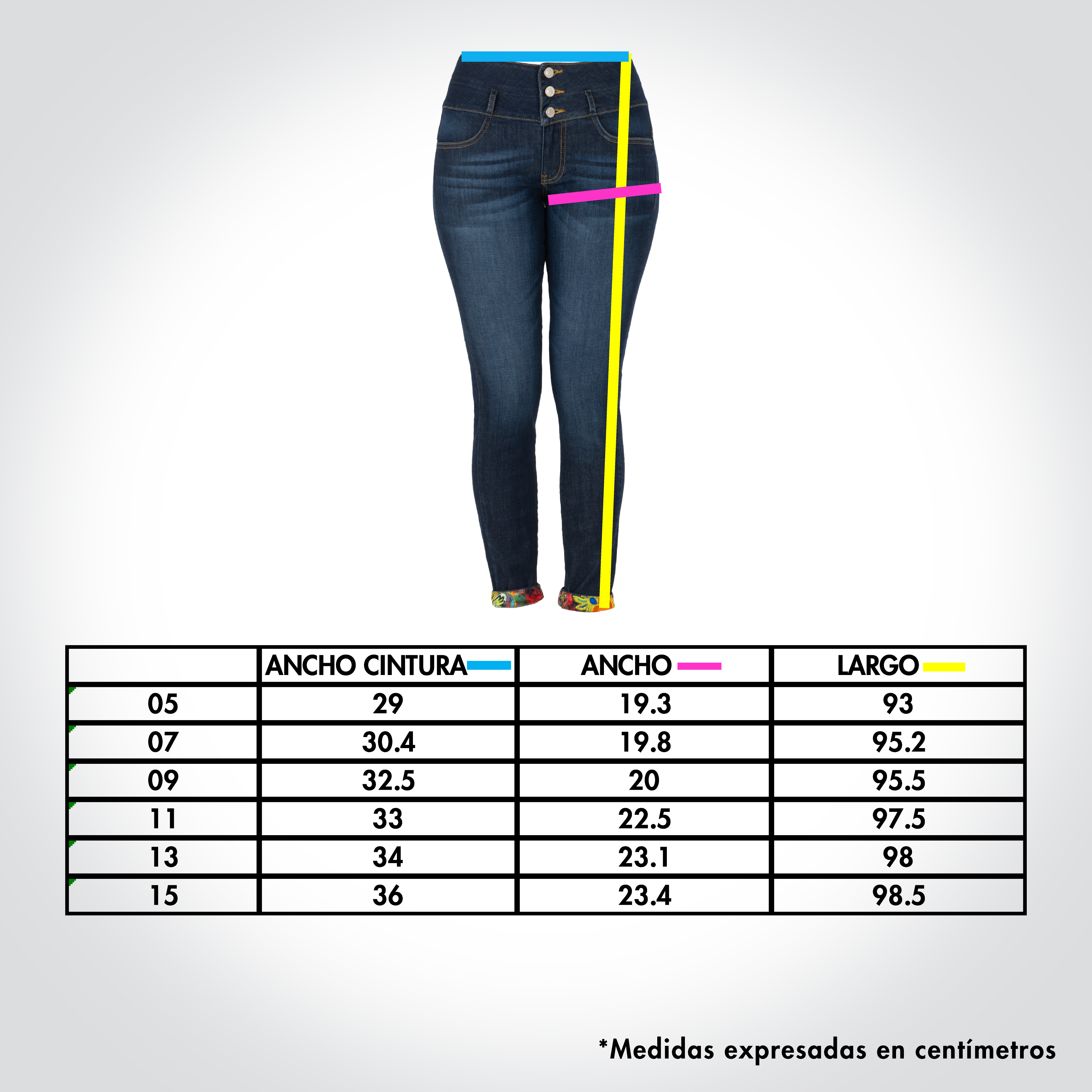 Estos jeans vienen con 3 botones que te ayudarán a ajustar tu abdomen para una figura más esbelta.