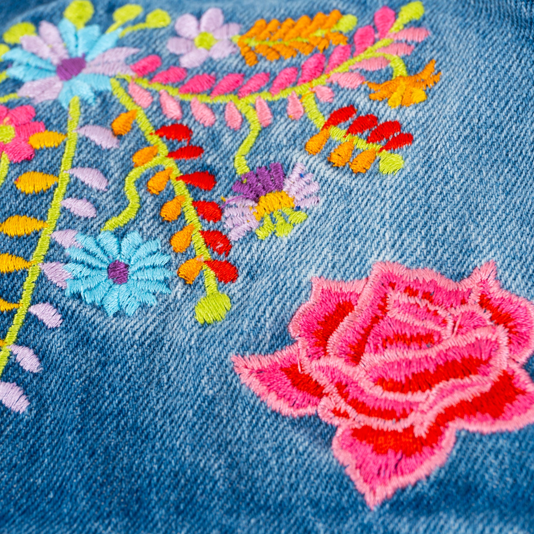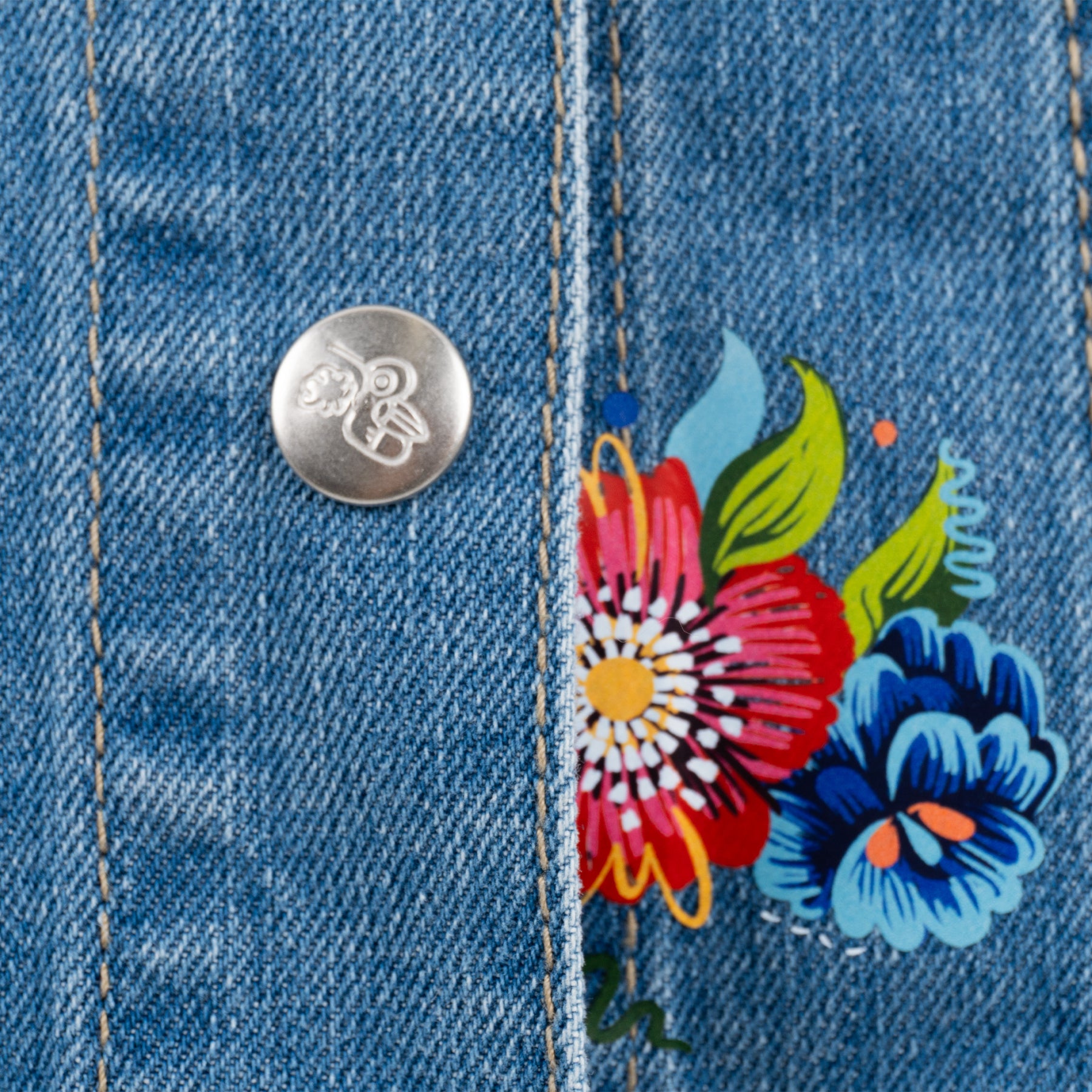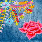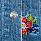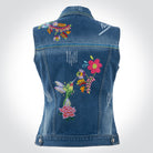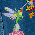 Chaleco de mezclilla para dama. Diseño inspirado en el colibrí y los tejidos típicos. Adaptados en colores neones y brillantes para un acabado más moderno.
