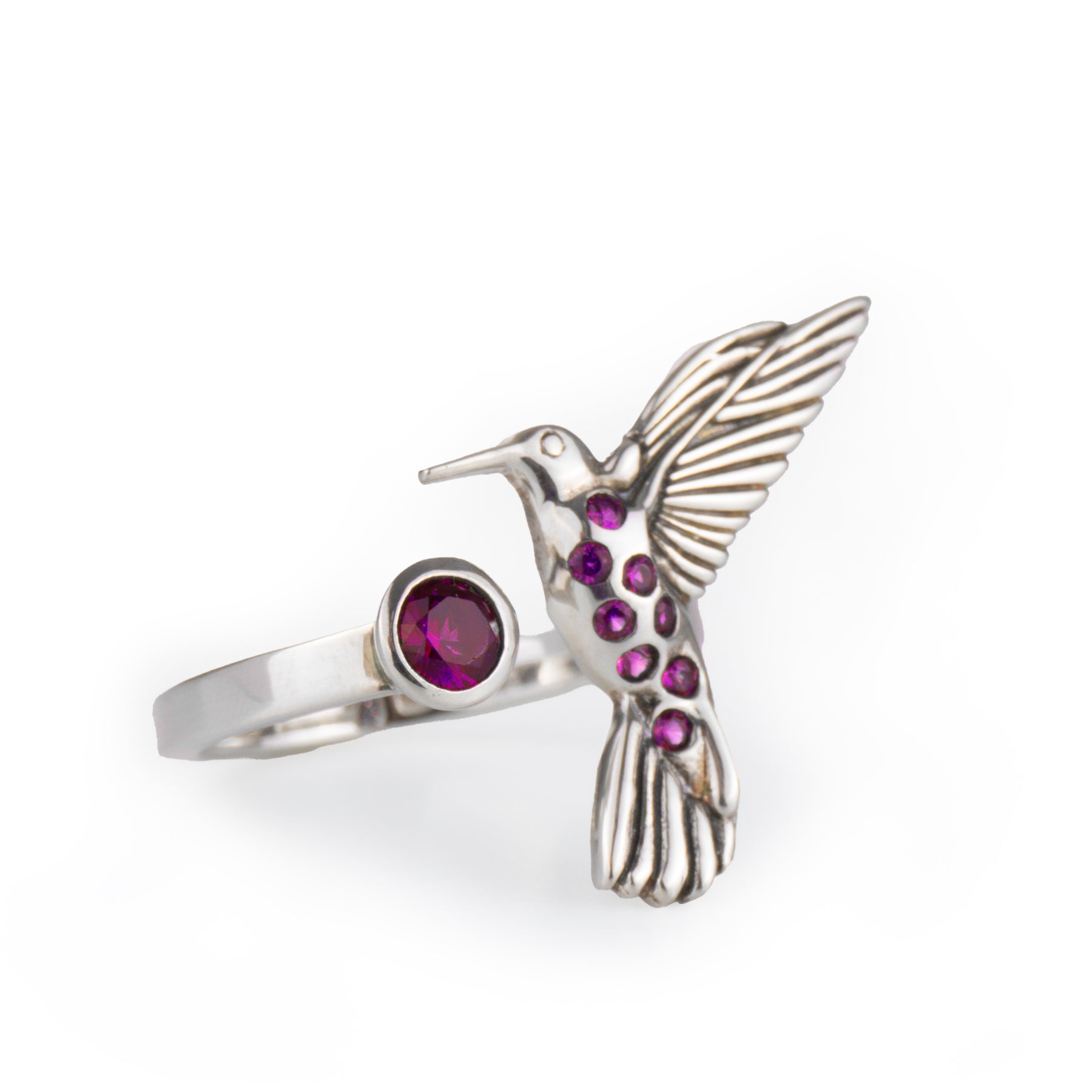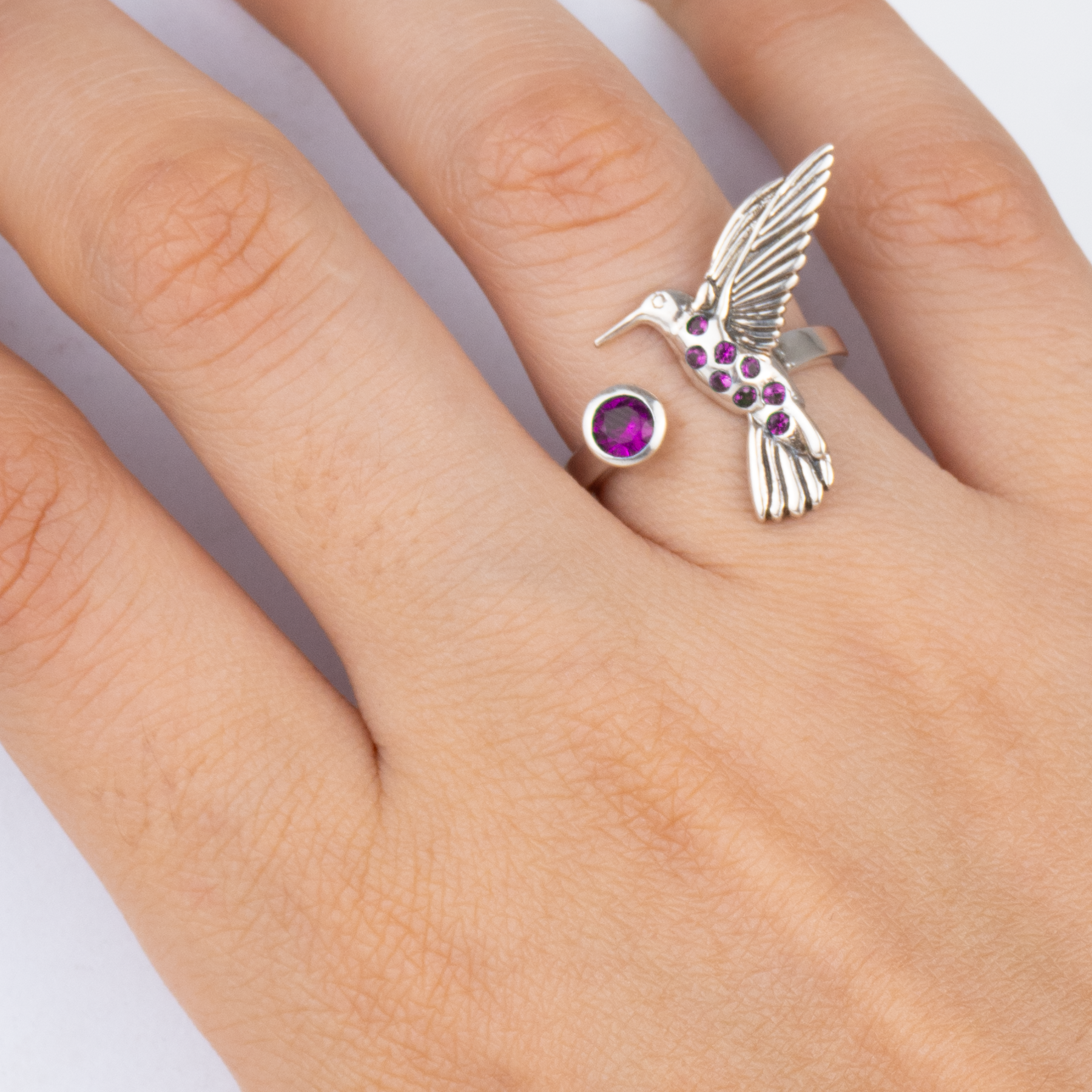 Anillo ajustable con forma de colibrí, adornado con pedrería.