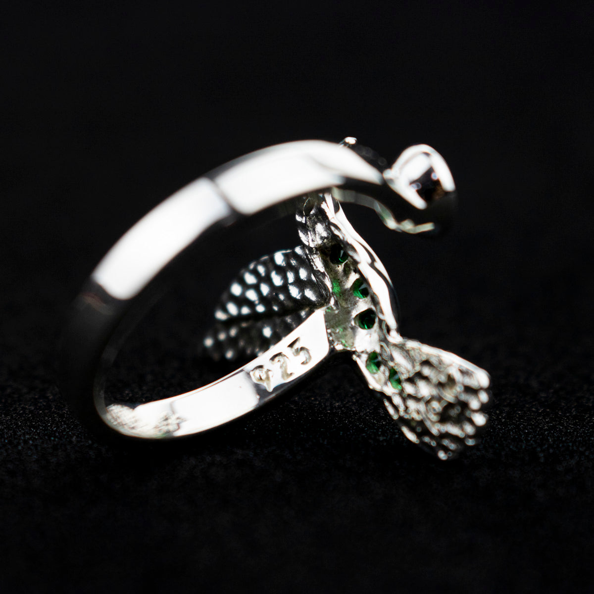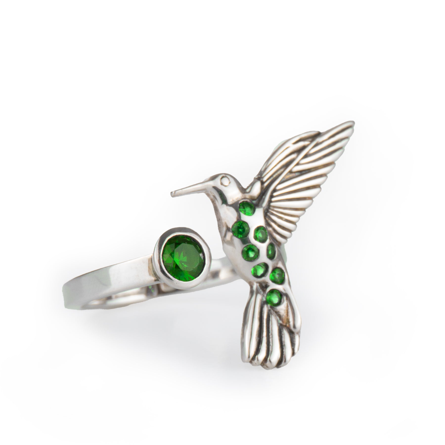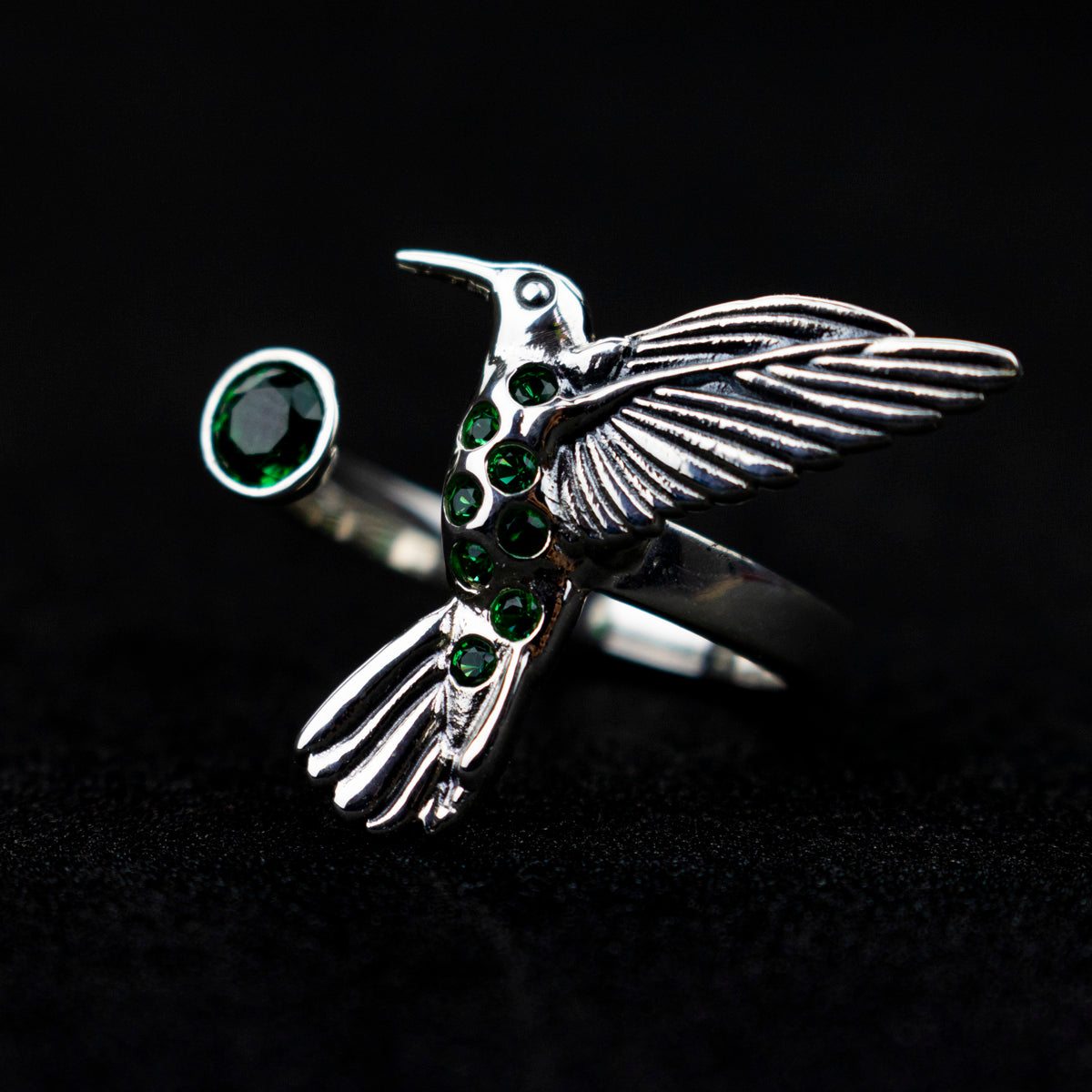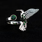 Anillo ajustable con forma de colibrí, adornado con pedrería.
