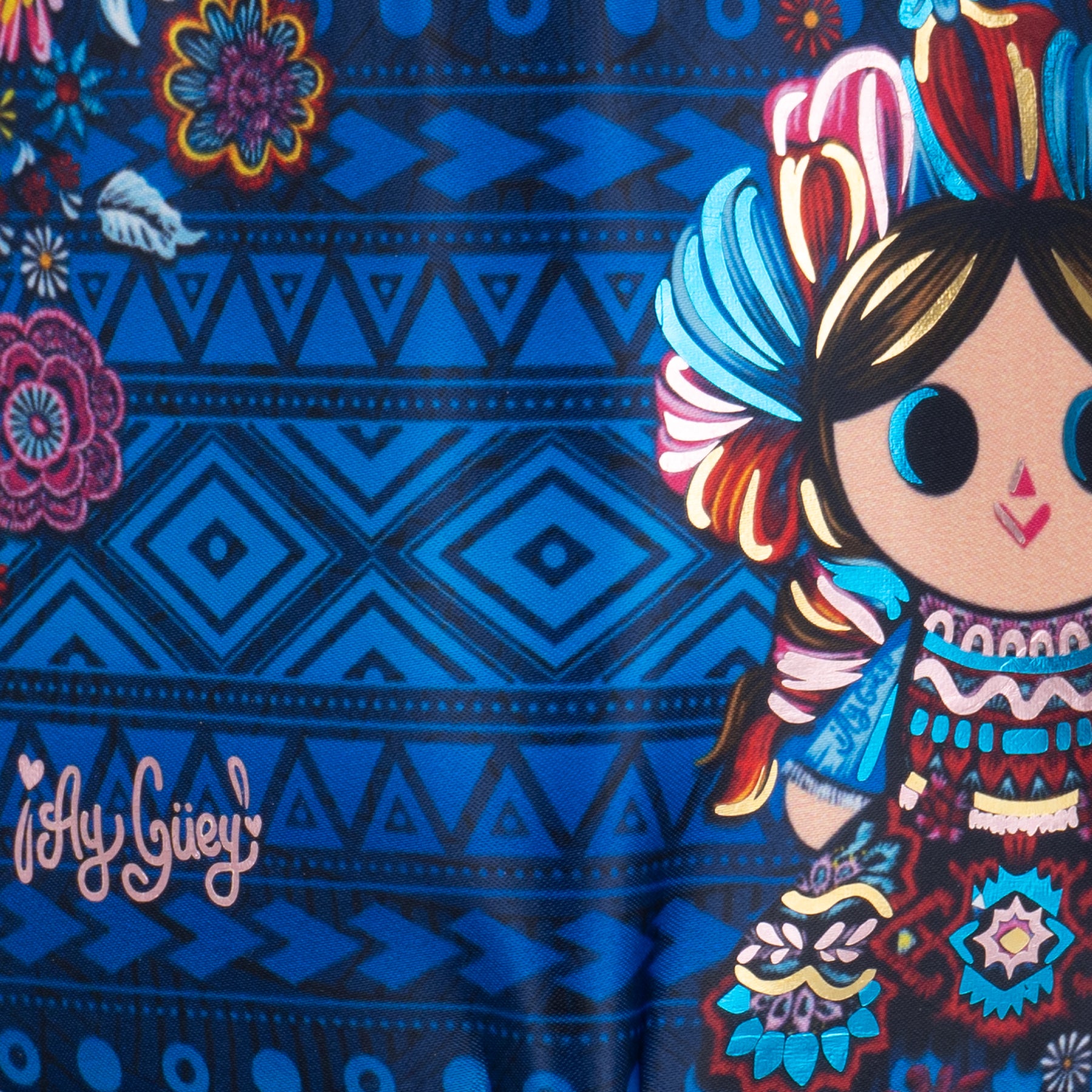 Billetera en color azul y foil metalizado que tiene como protagonista a nuestra muñeca Petrita.