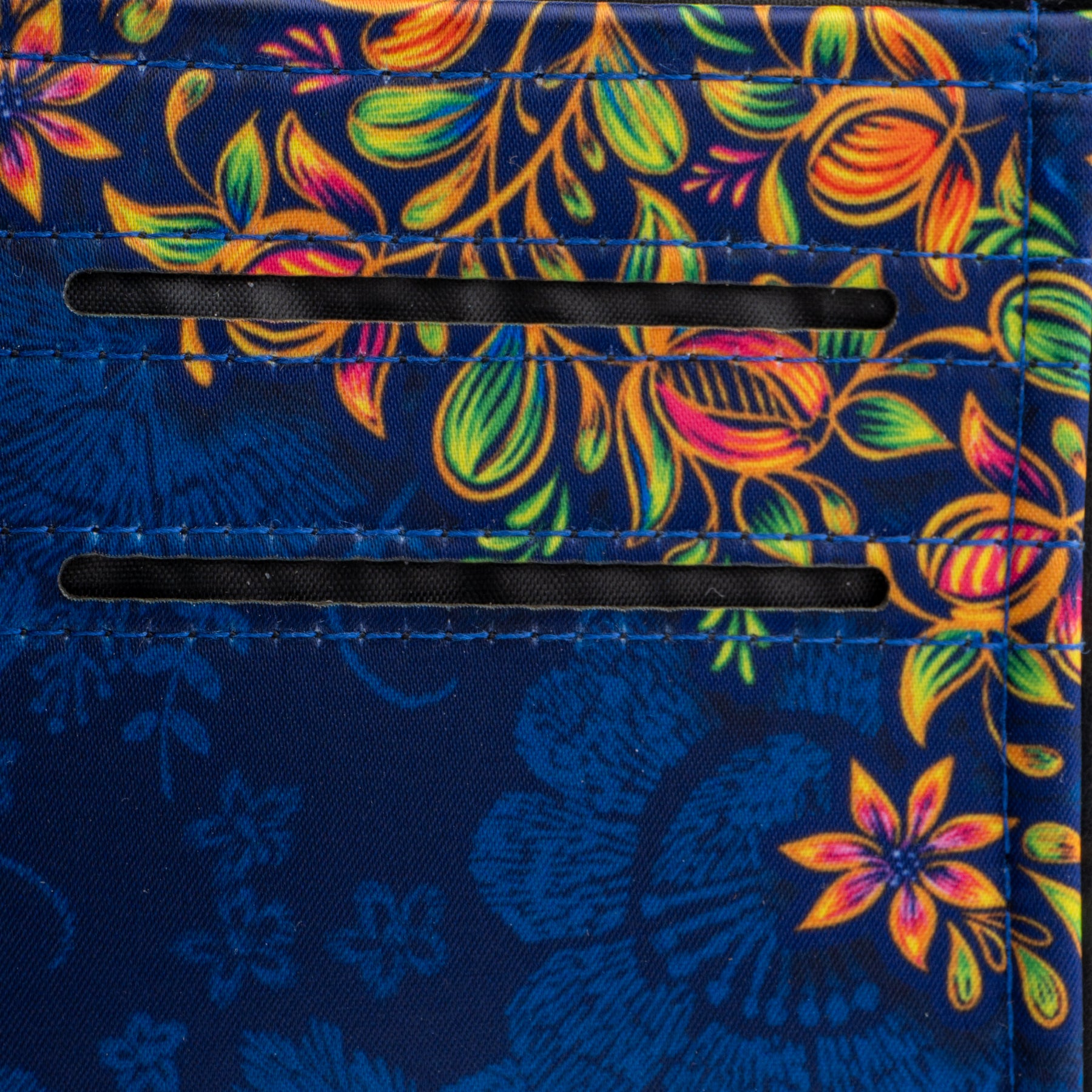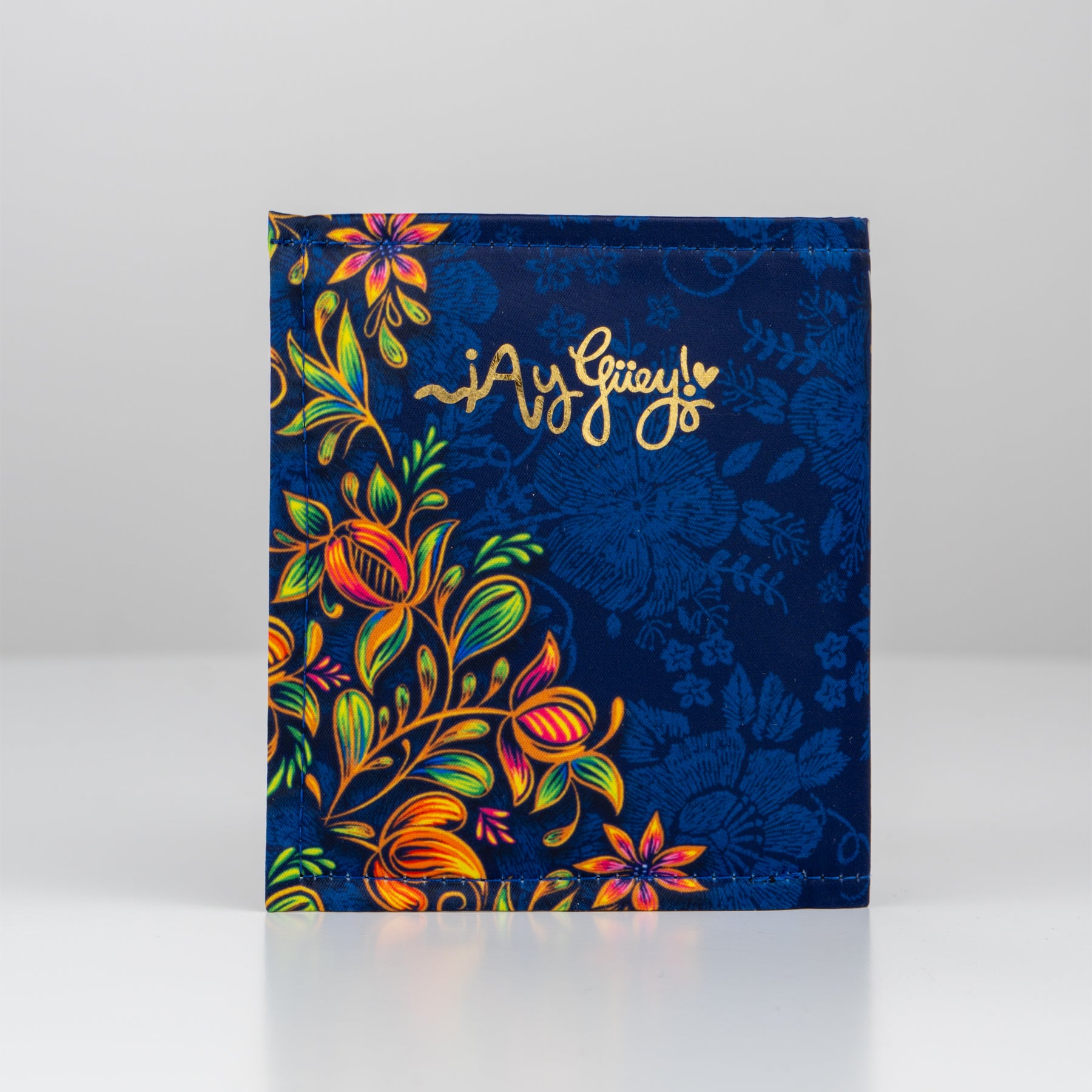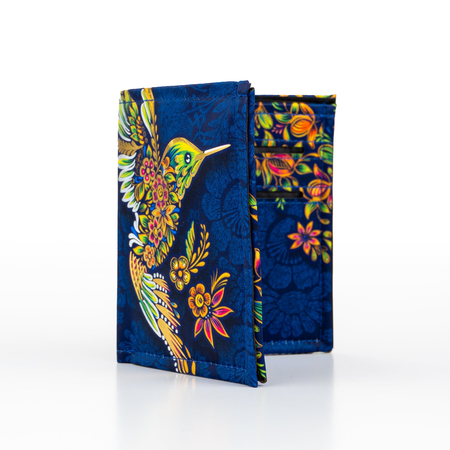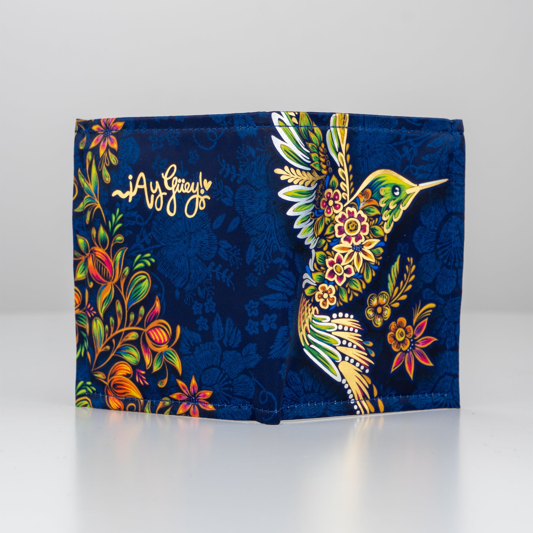 Billetera en color azul y foil metalizado inspirado en los colibrís y el colorido de la primavera.