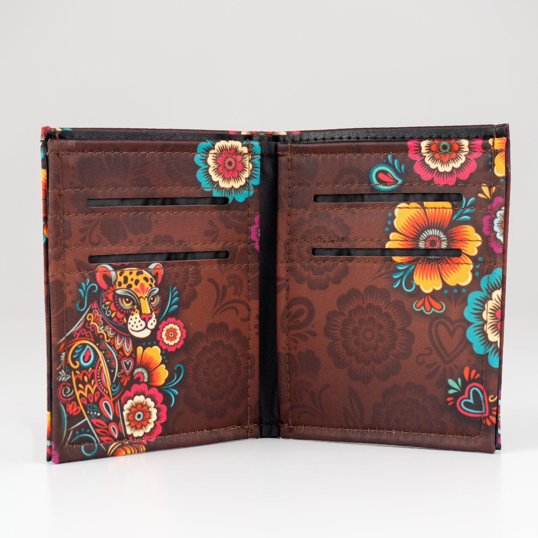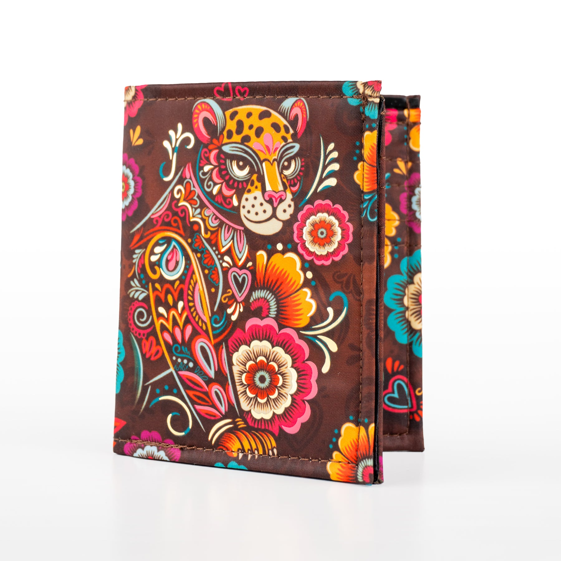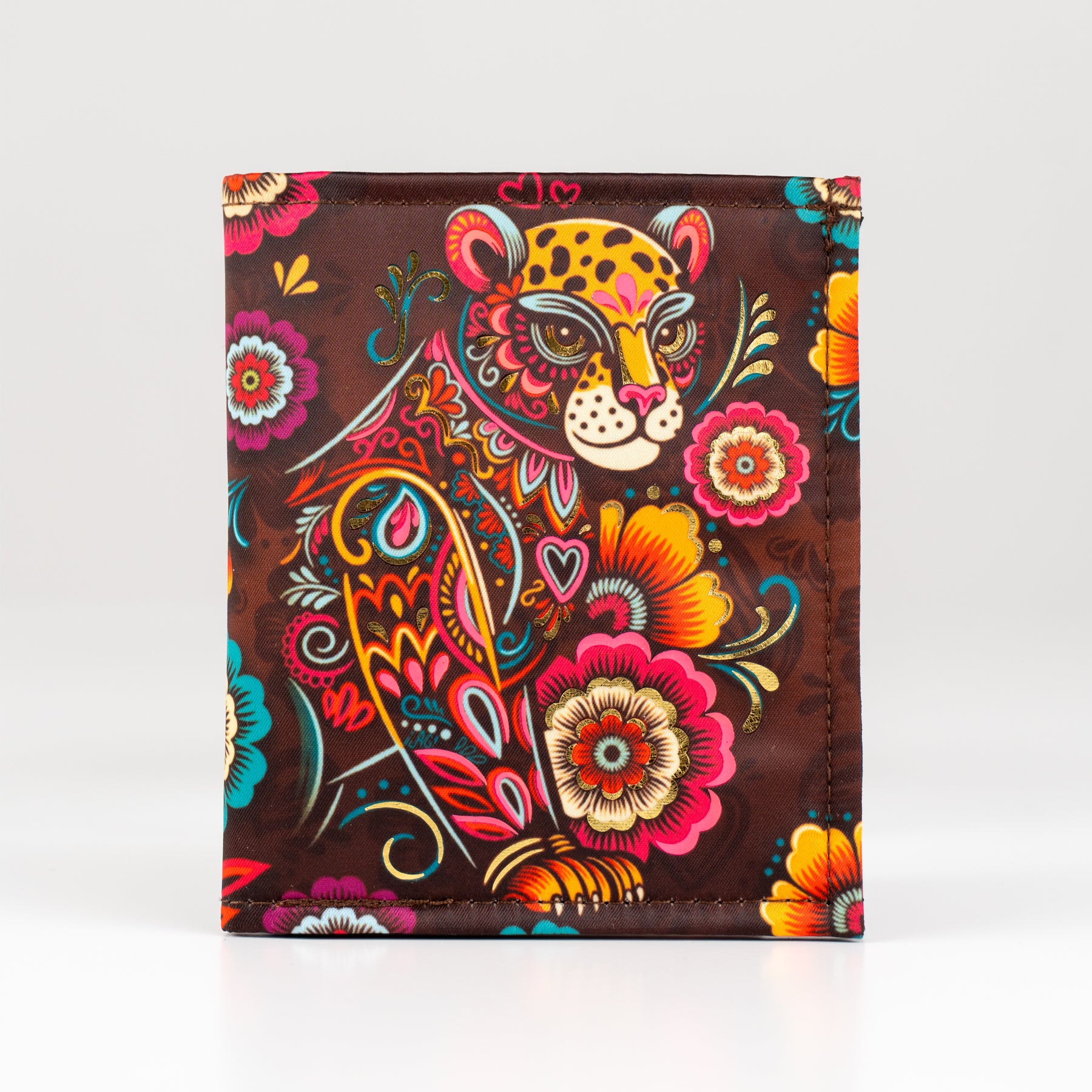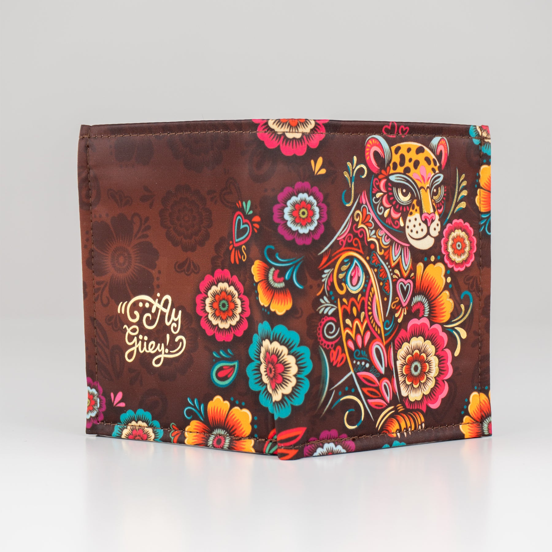 Billetera en color marrón y foil metalizado inspirado en el "Balam" y el colorido de la primavera.
