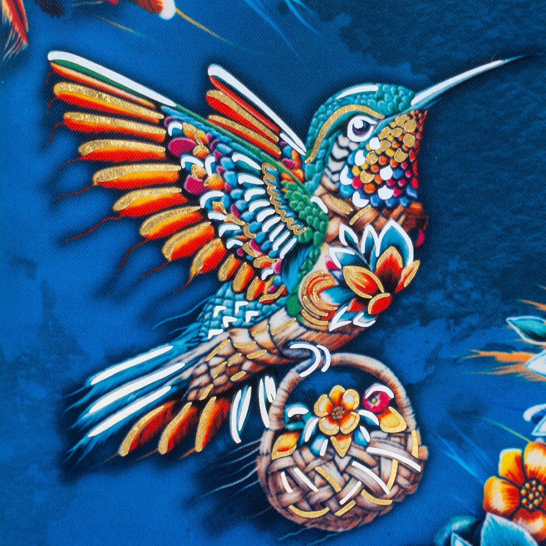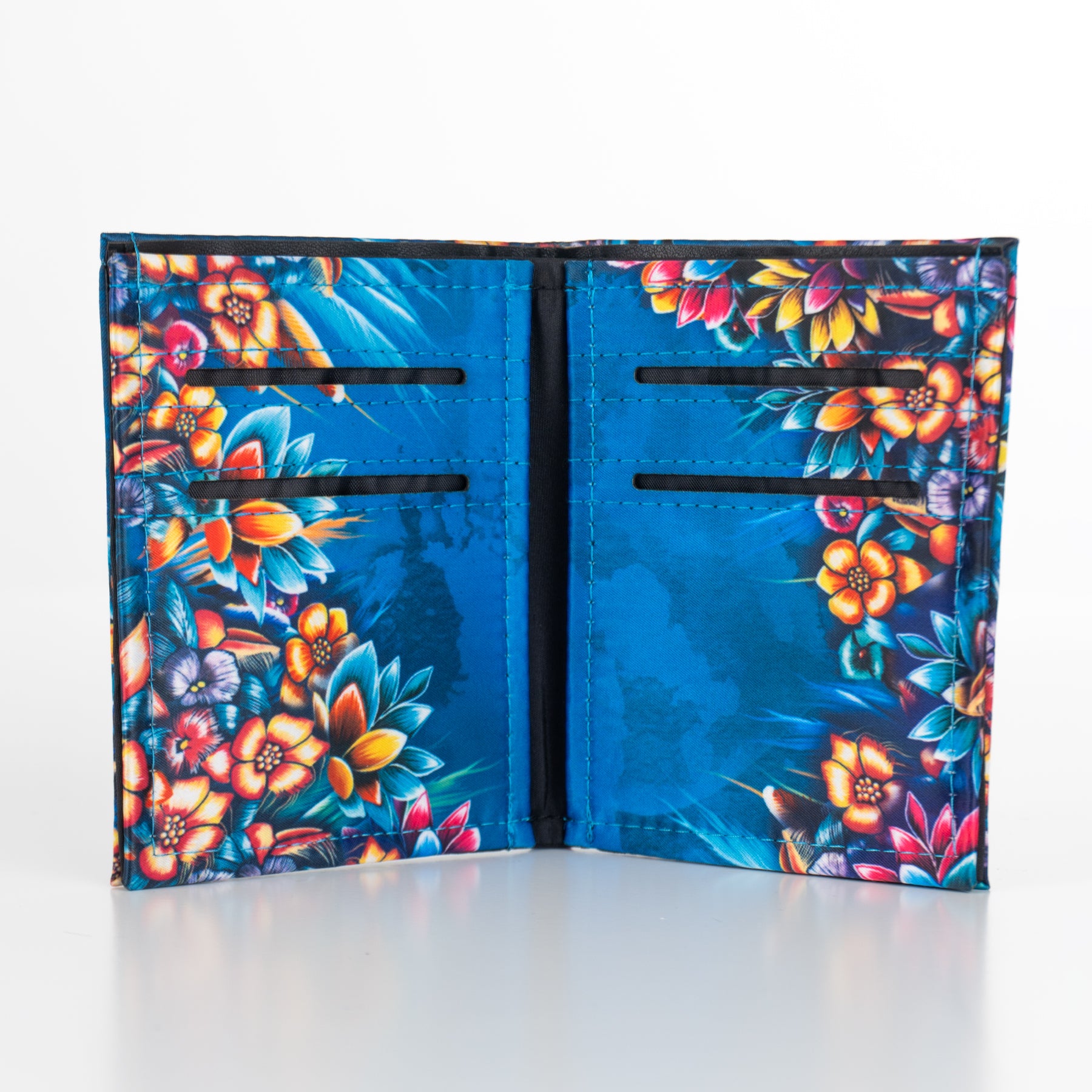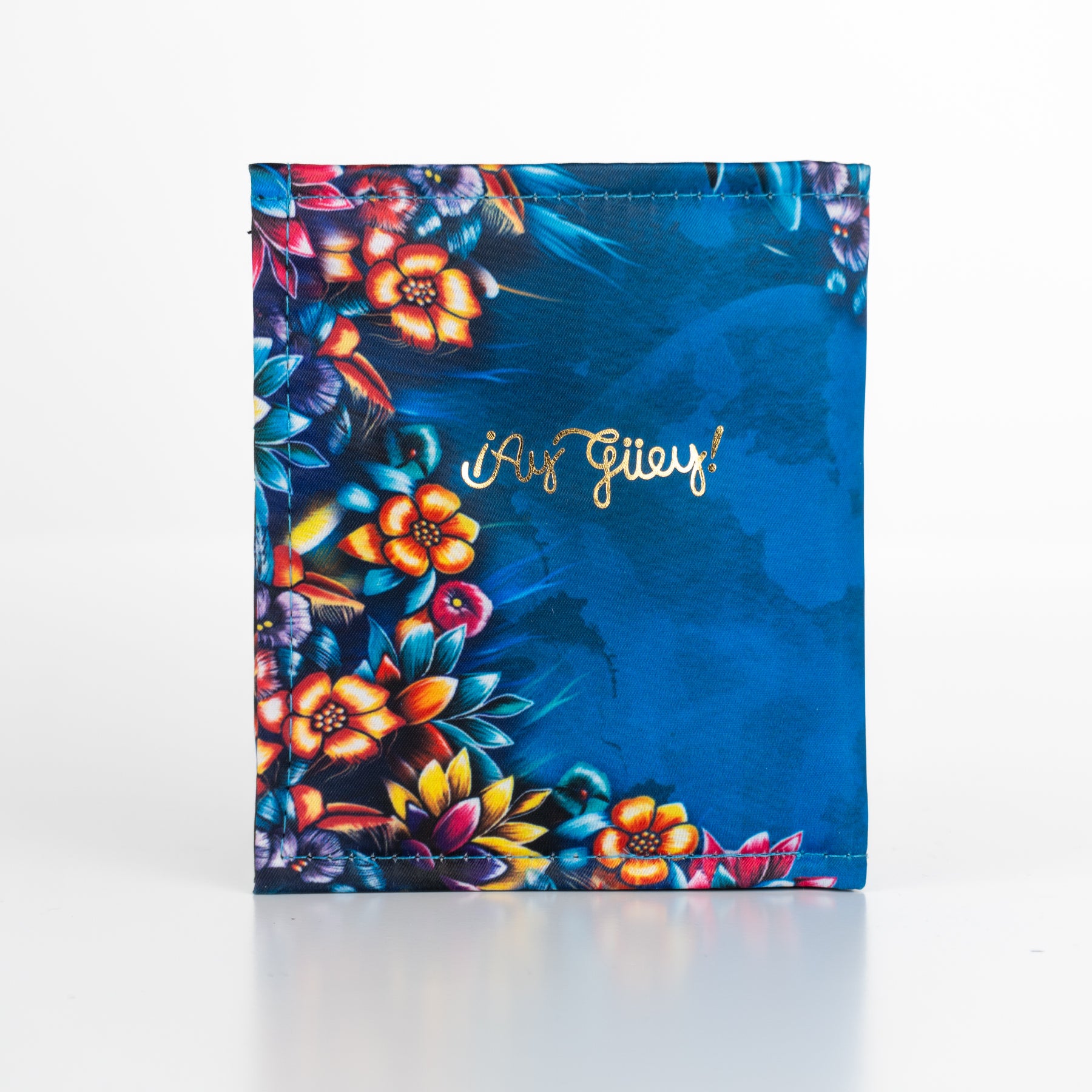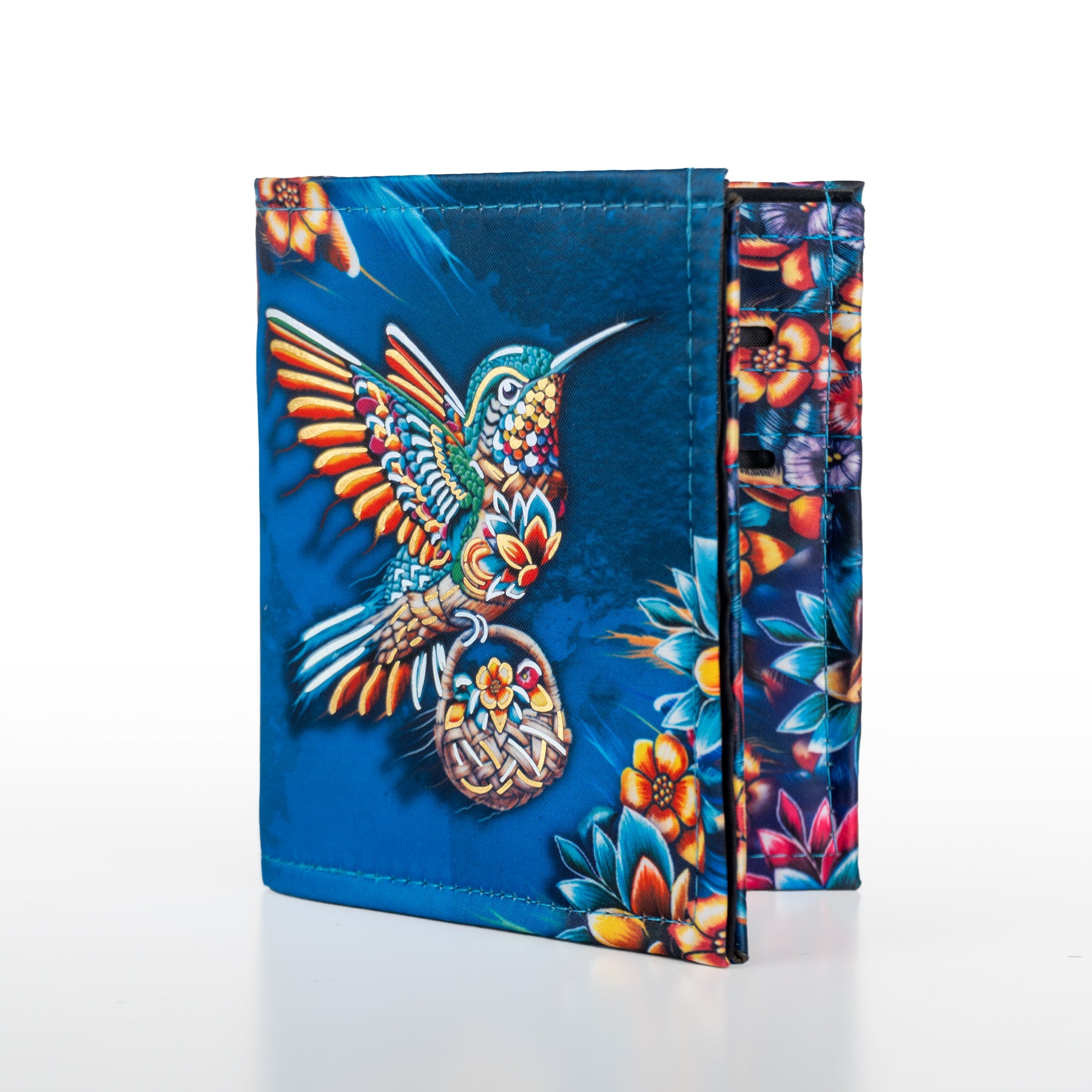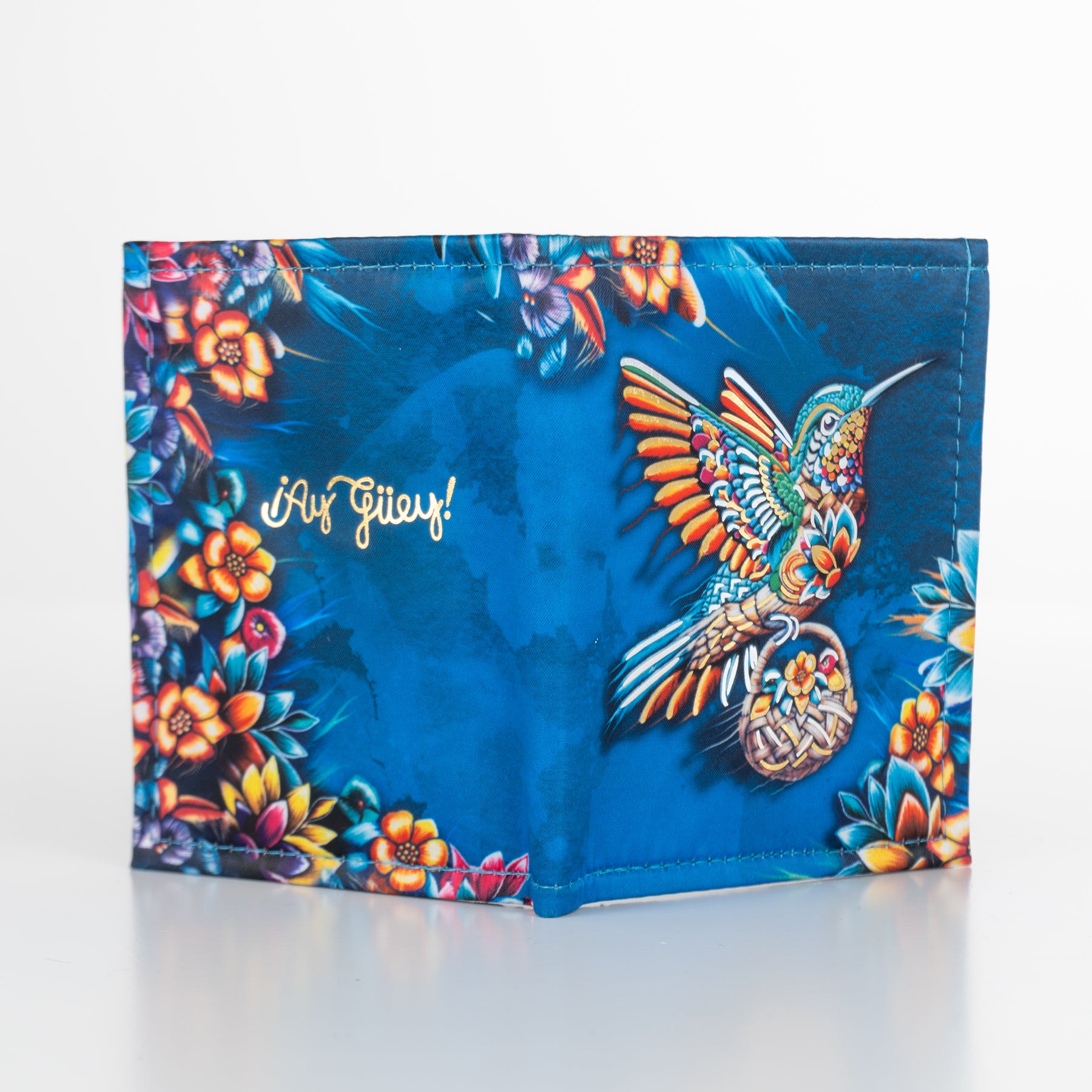 Billetera en color azul y foil metalizado inspirado en los colibrís y el colorido de la primavera.