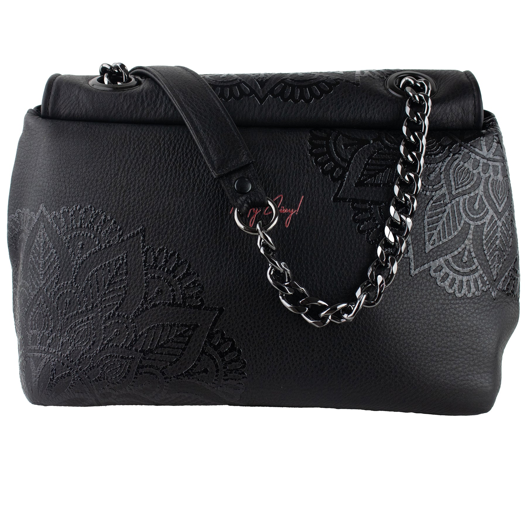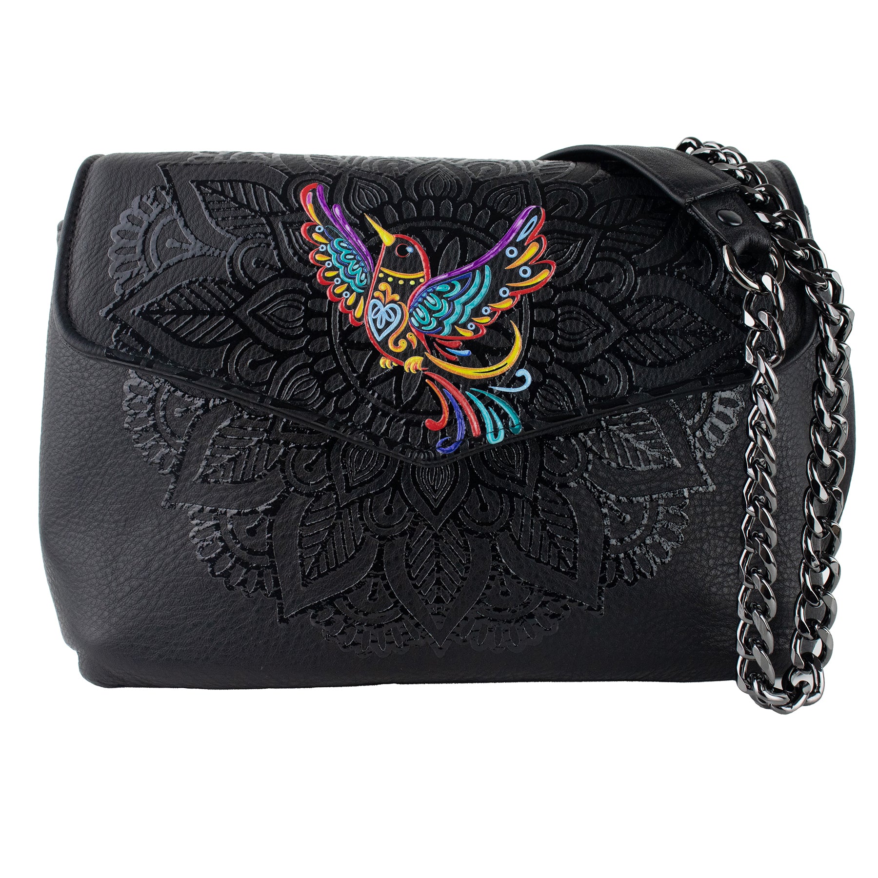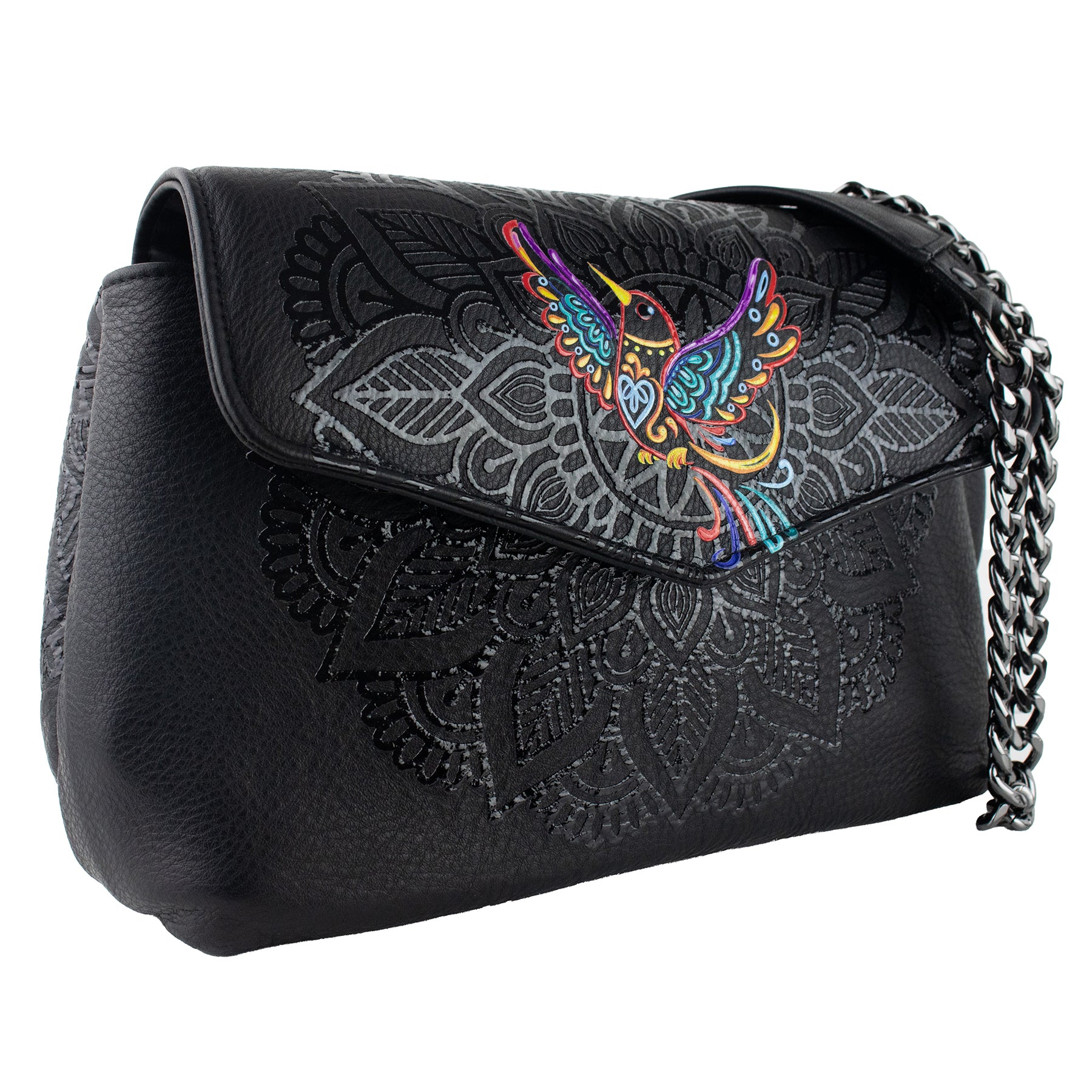Bolsa de dama, con correa de cadena, inspirada en el colibrí, animal que de acuerdo a la cultura azteca son los mensajeros de buenos deseos. Resaltan sobre la bolsa un dibujo de mandala que aporta elegancia y misticismo.