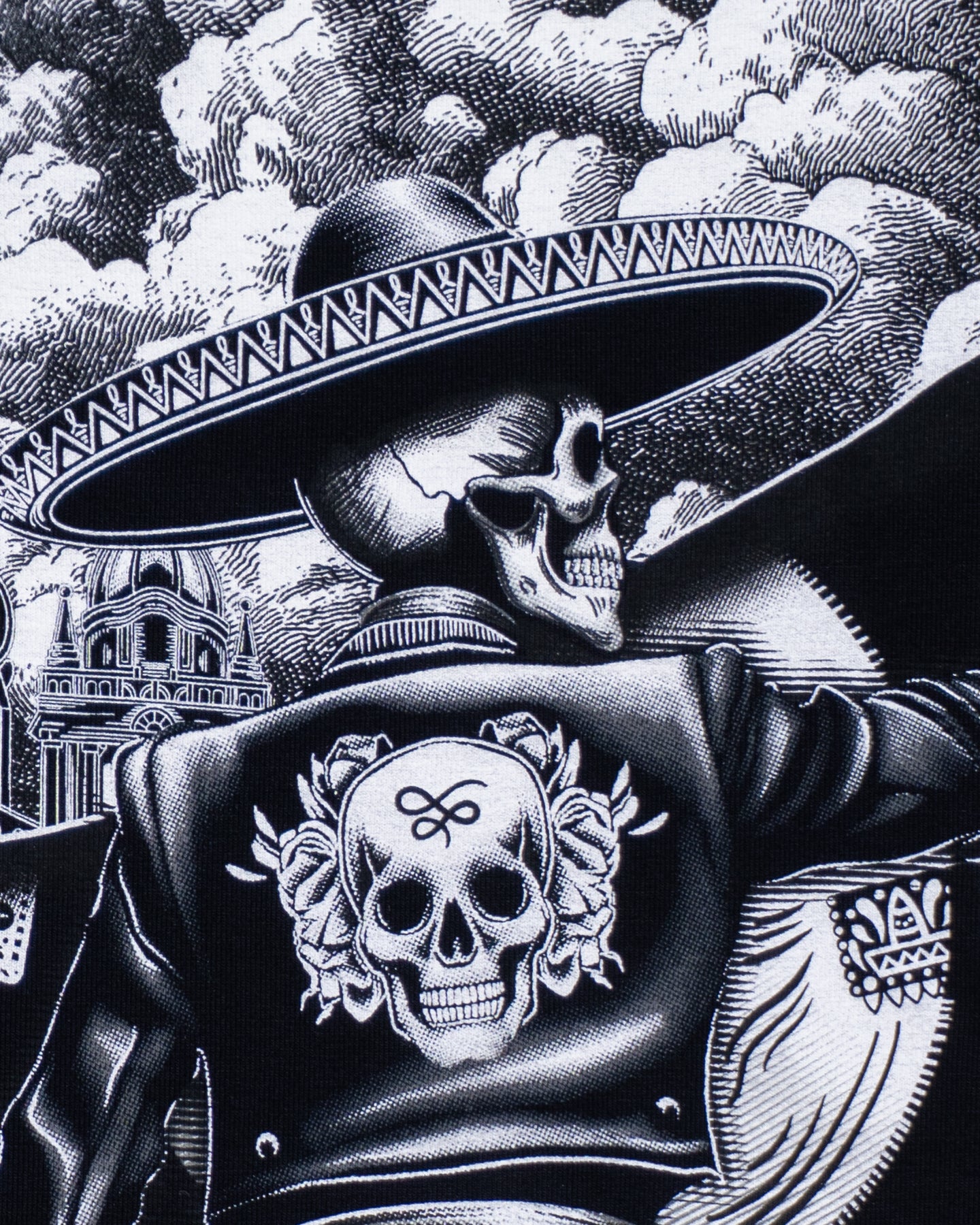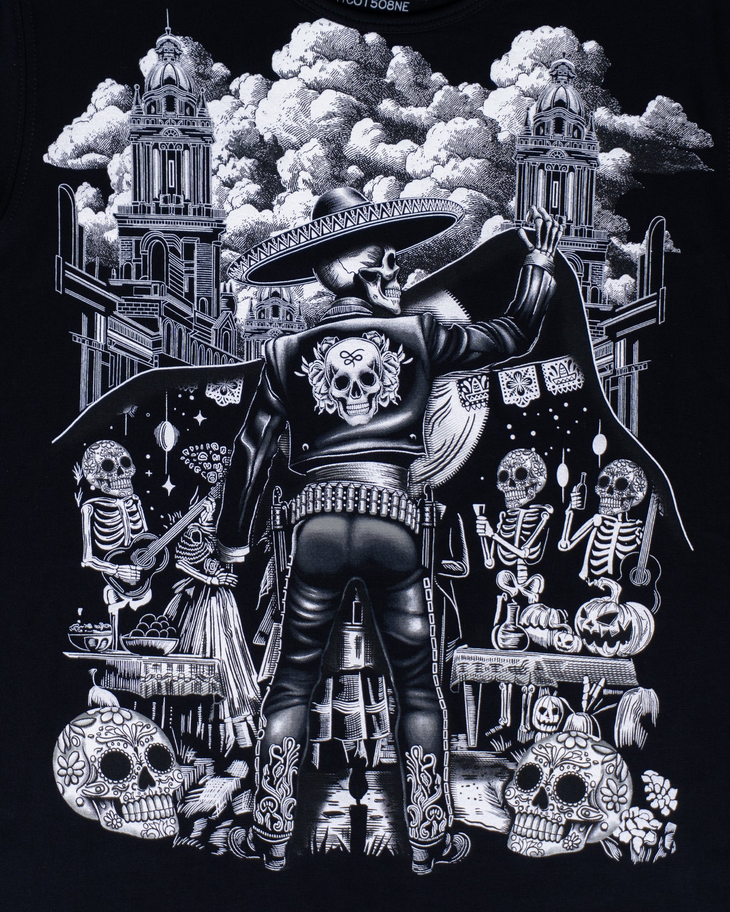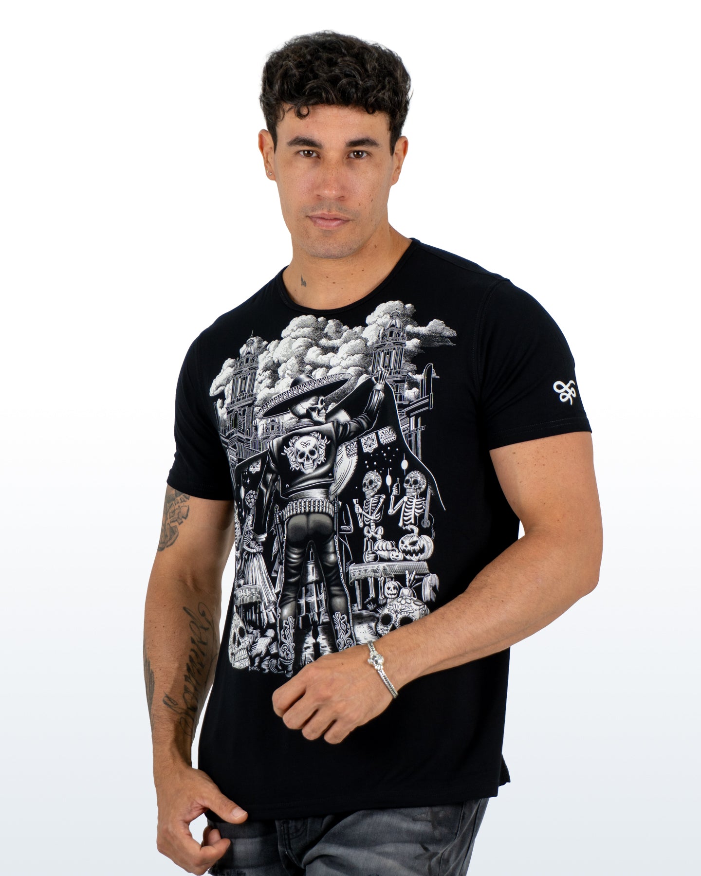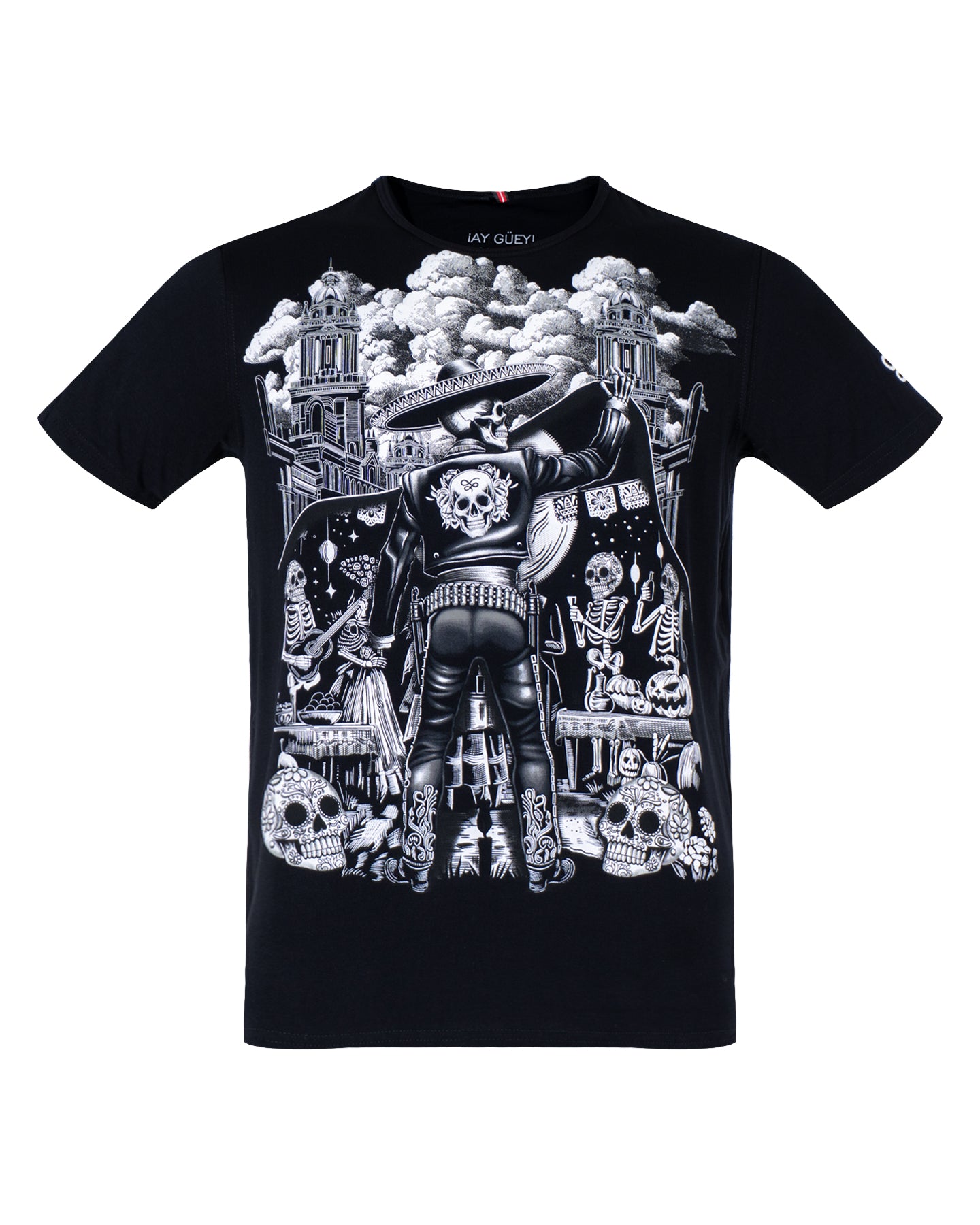 Celebra la riqueza de México con nuestra playera "Dos Culturas". Este diseño impactante fusiona elementos icónicos de la cultura mexicana, presentando un esqueleto charro en un escenario urbano detallado. Una prenda que rinde homenaje a nuestras raíces con un toque moderno y atrevido. Perfecta para quienes buscan estilo y significado.
