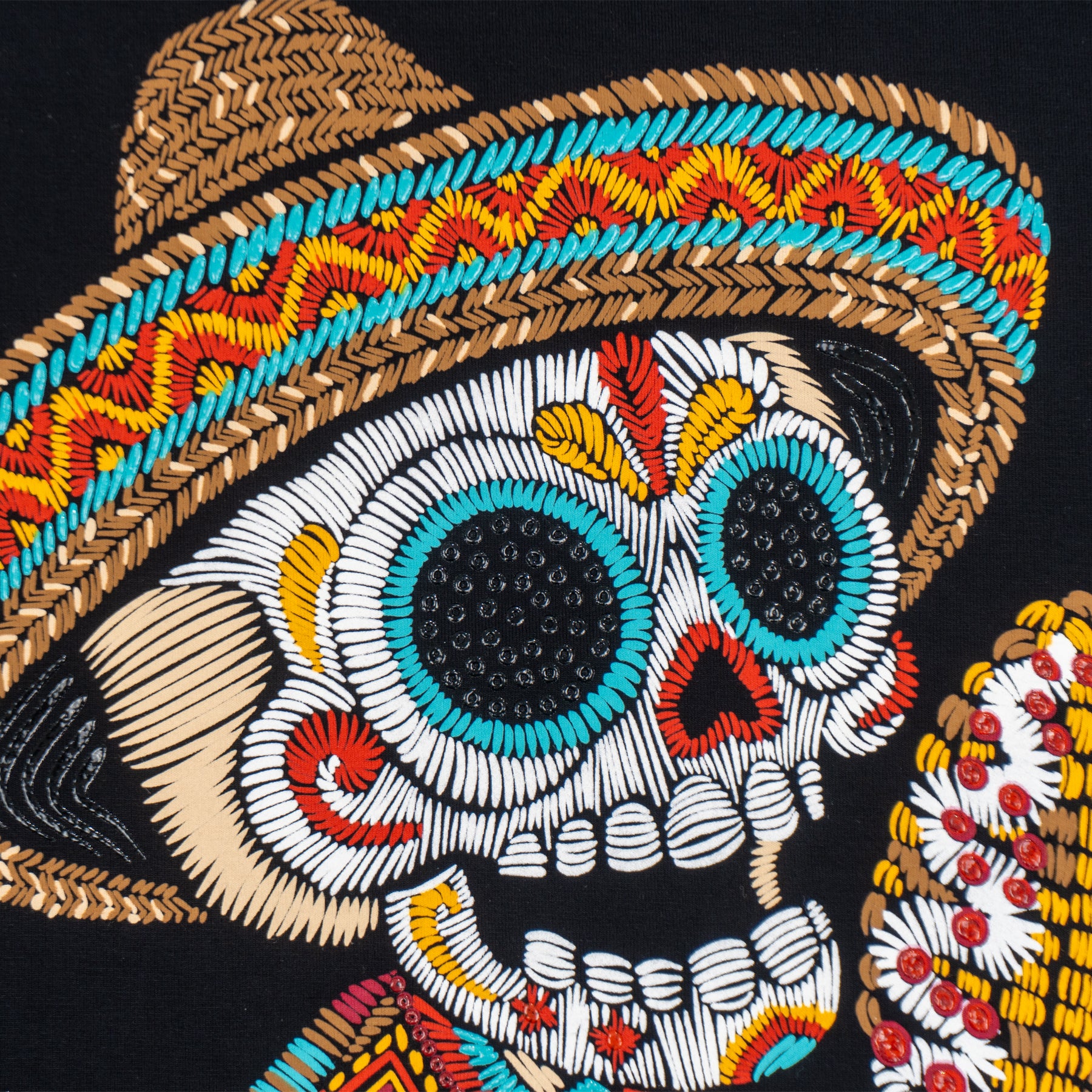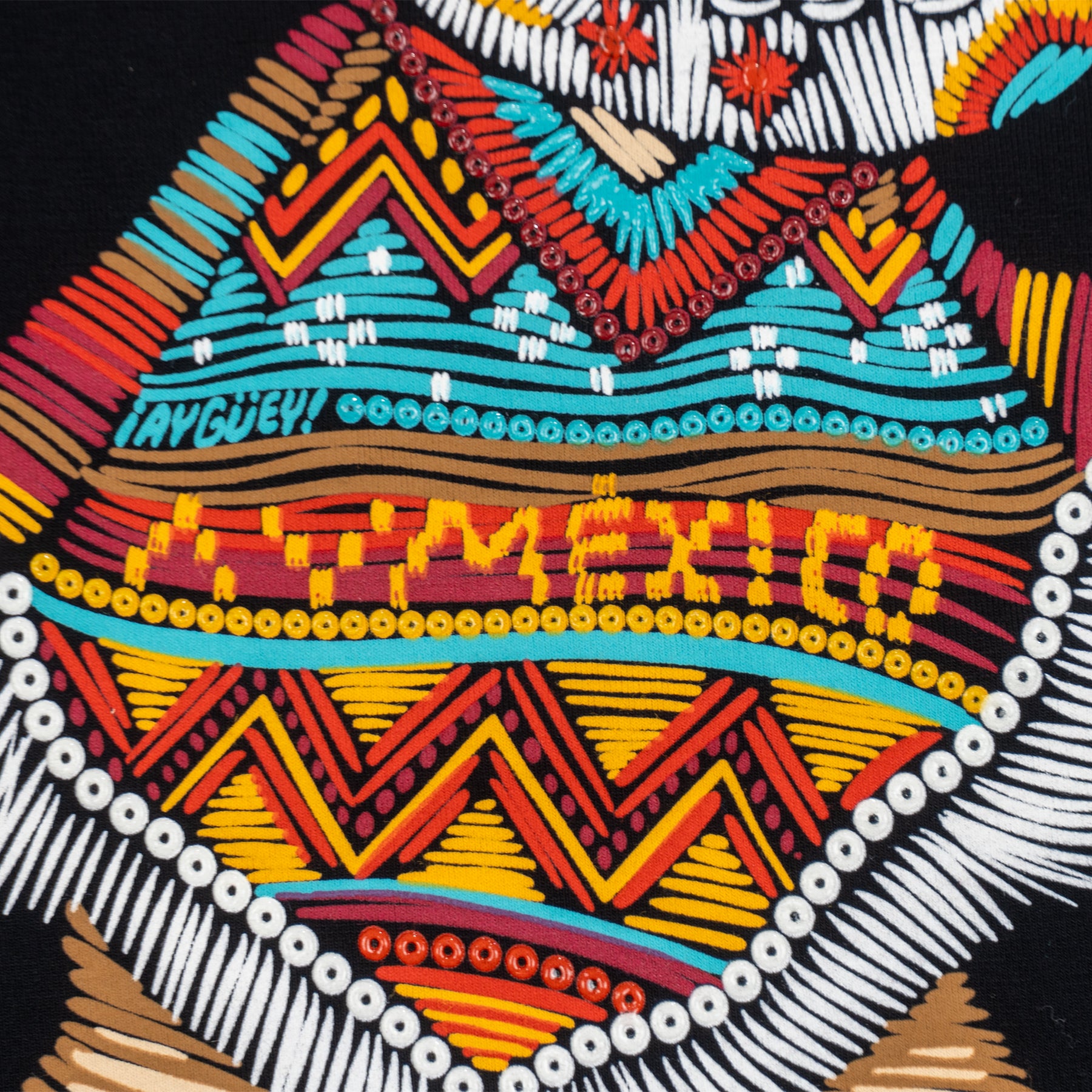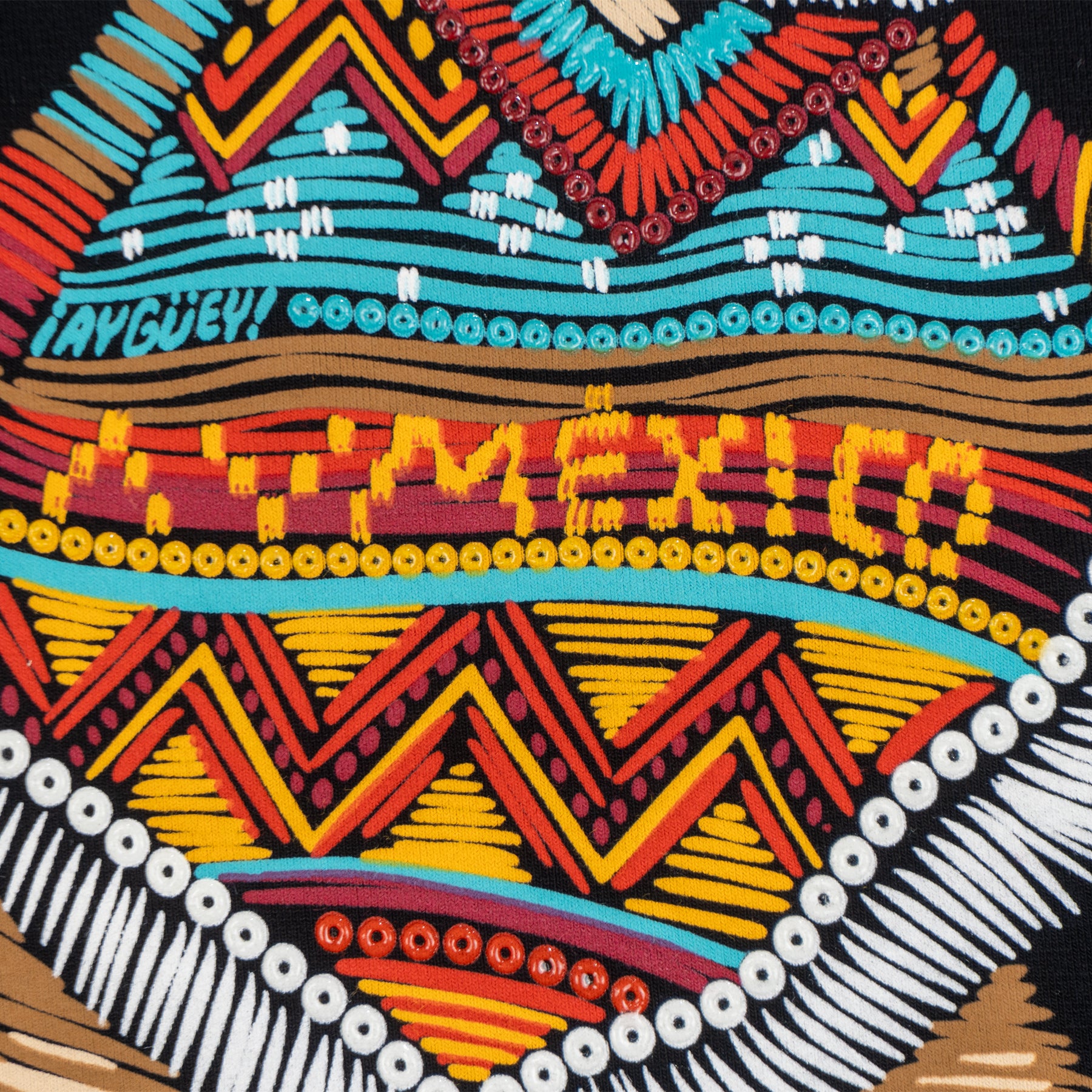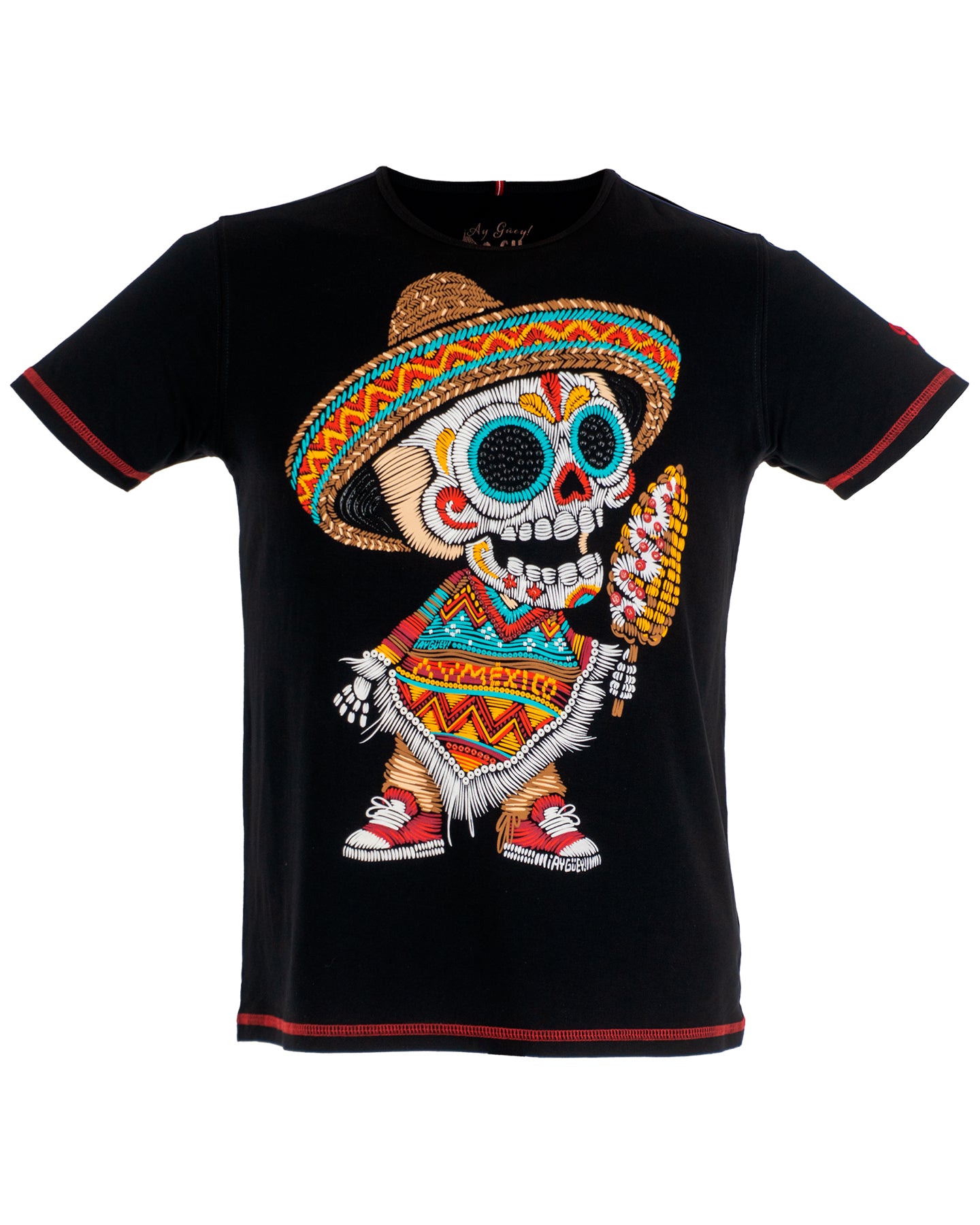 Luce con orgullo a esta calaverita de azúcar bien mexicana, con su joronguito pa'l frío y un elote en la mano, ¡pa' que no falte el sustento! Porque aquí, hasta la huesuda le entra al elote, ¡somos hijos del maíz!