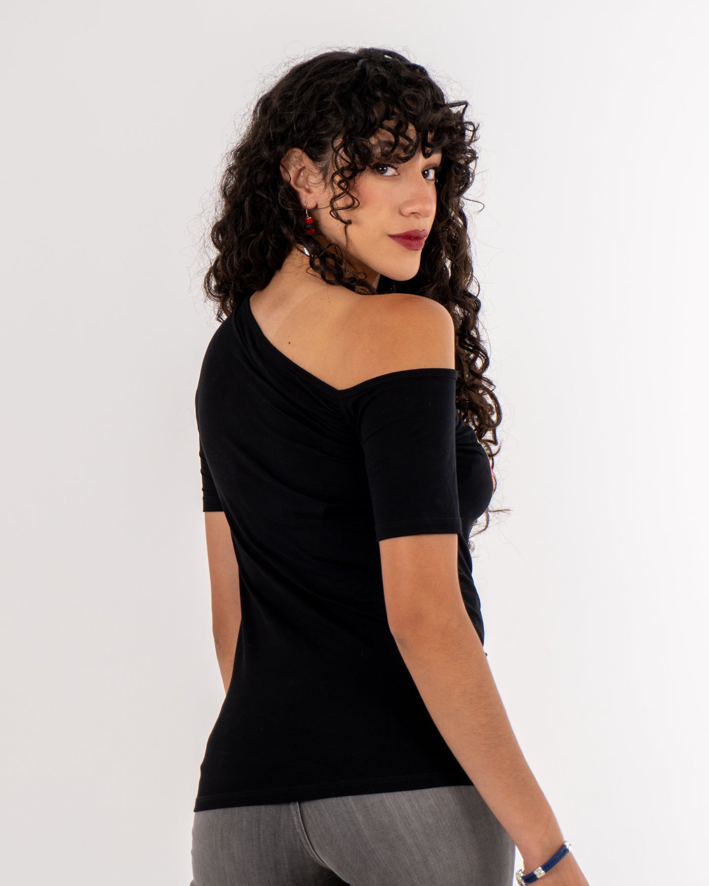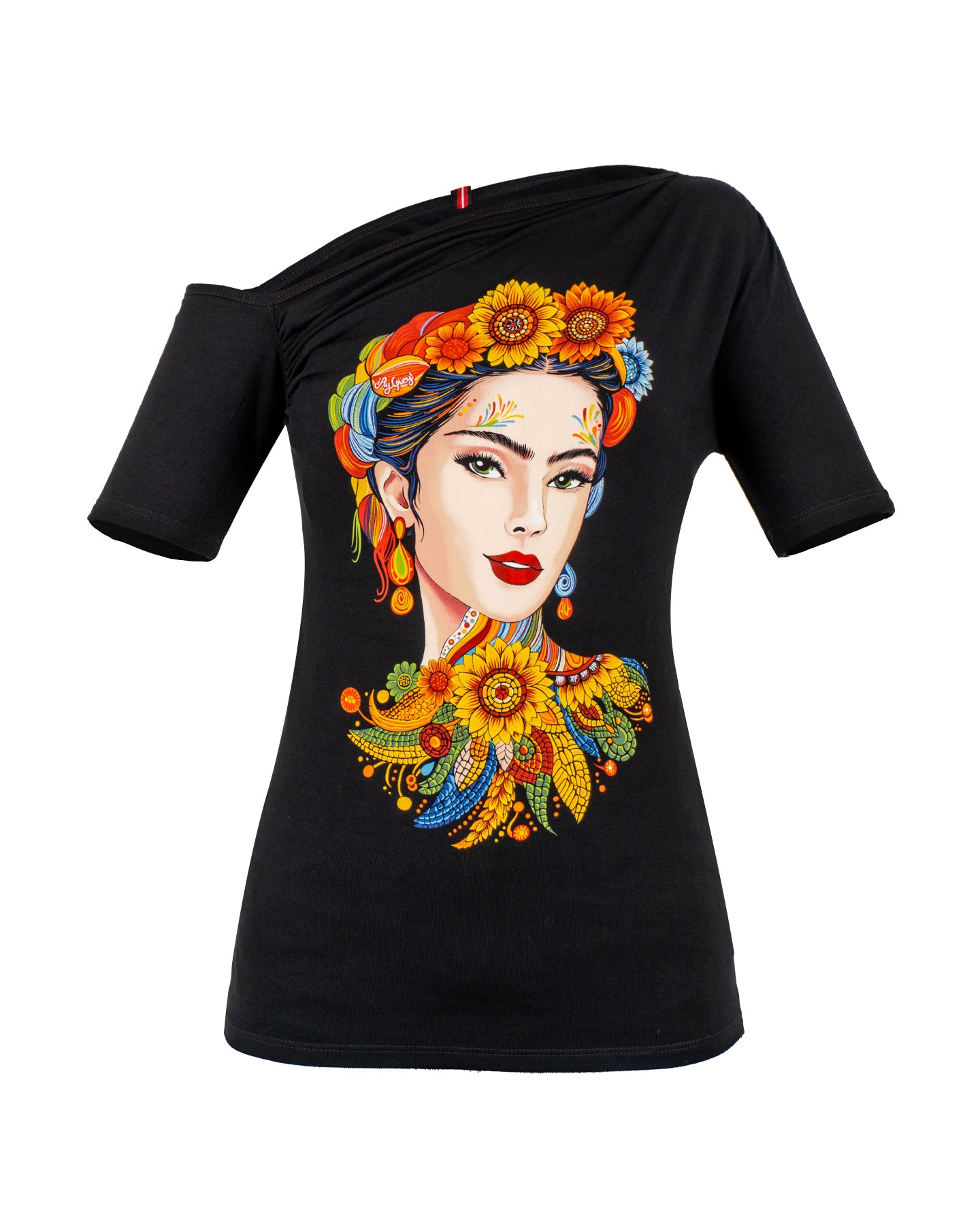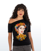 Playera estampada de hombro descubierto para mujer - Modelo JIJA DEL MAIZ
