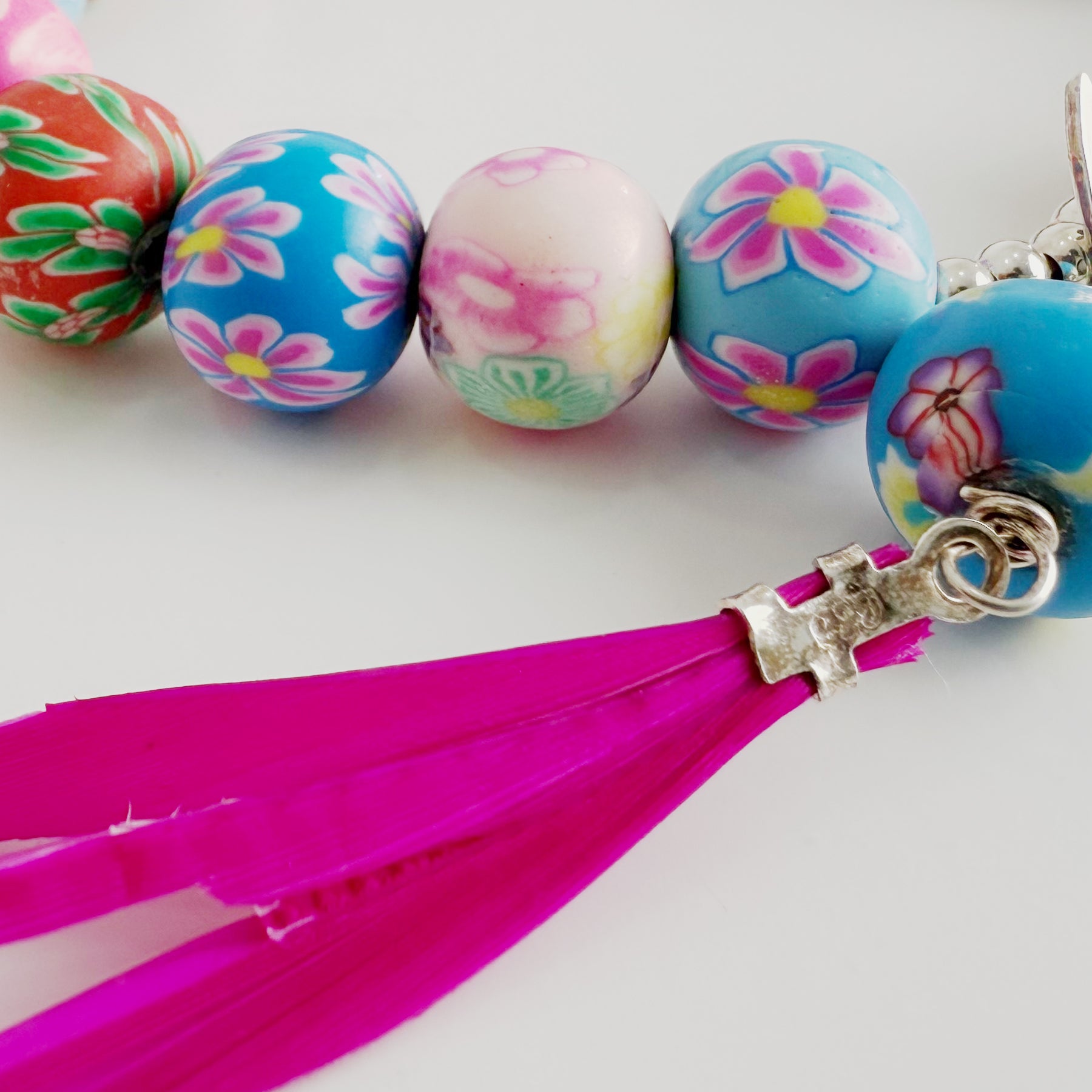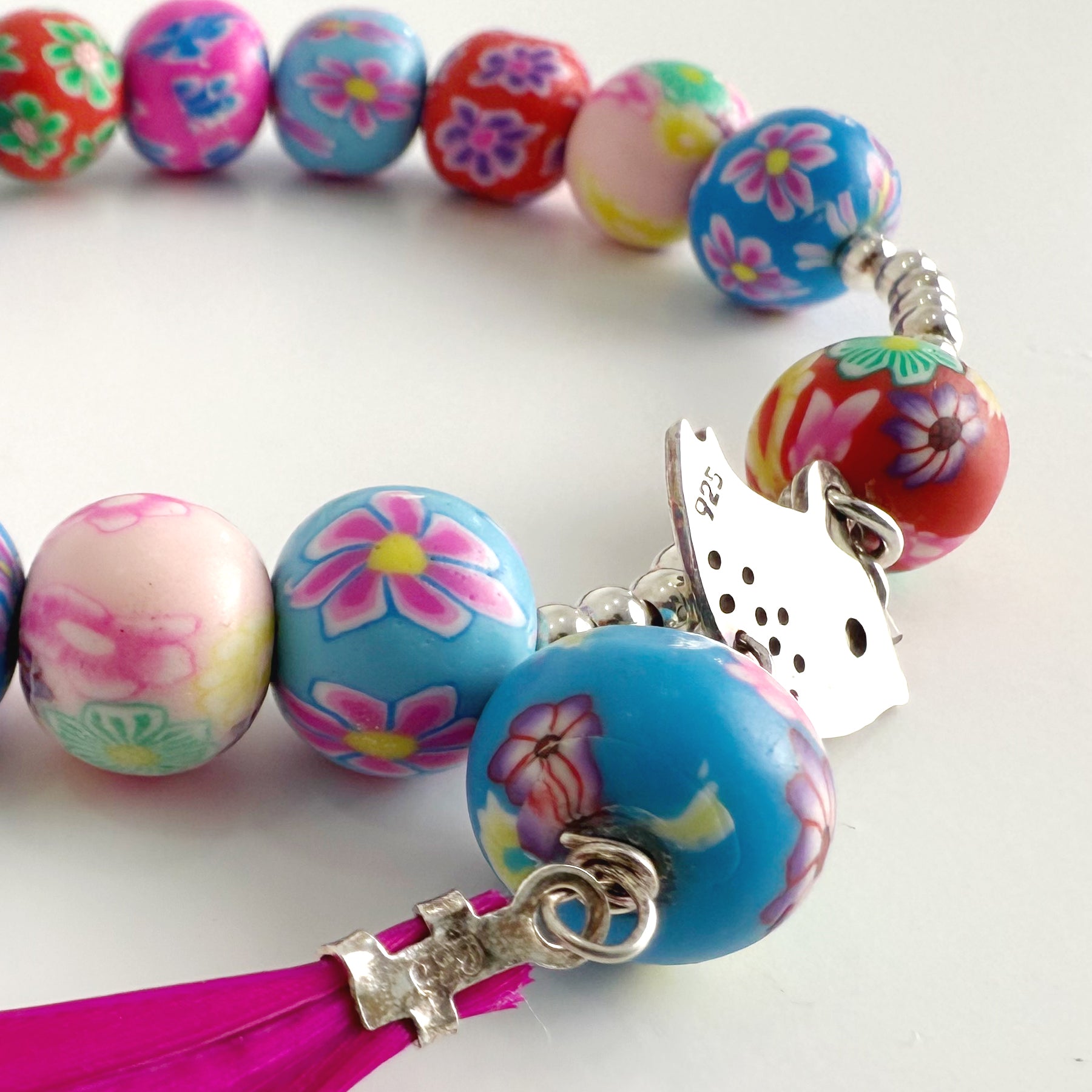 Pulsera con cuentas de color y dije de plata con forma de Pajarito