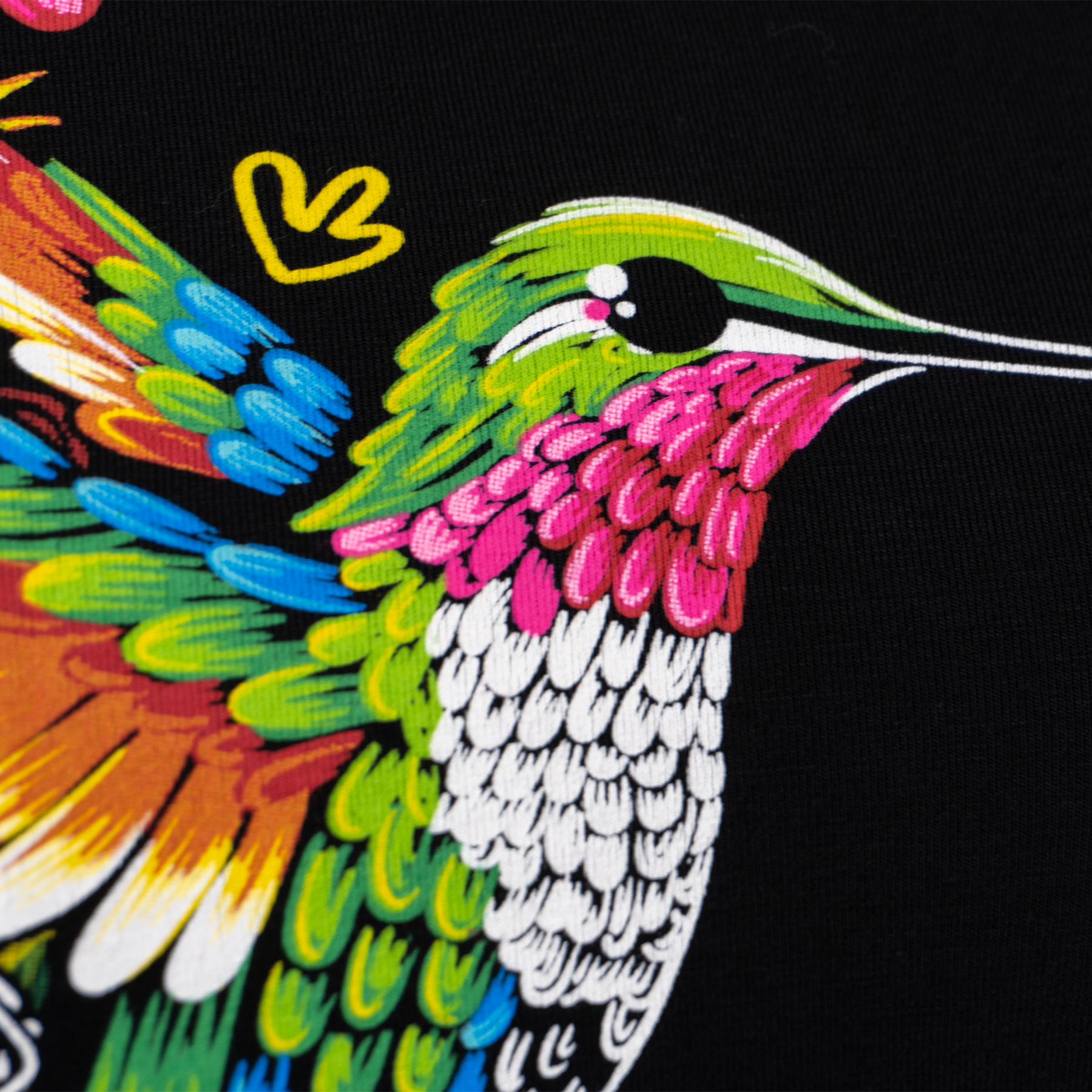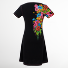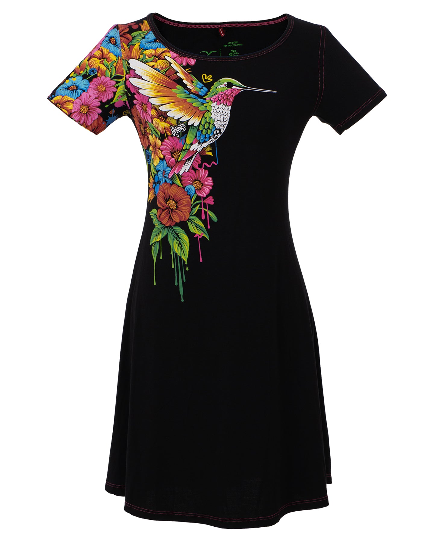 Vestido de dama manga corta, decorado con un colibrí muy artístico que se posa en la parte del hombro. Este diseño es muy casual y fácil de combinar, sus colores brillantes lo hacen mantener esa mexicaneidad característica.