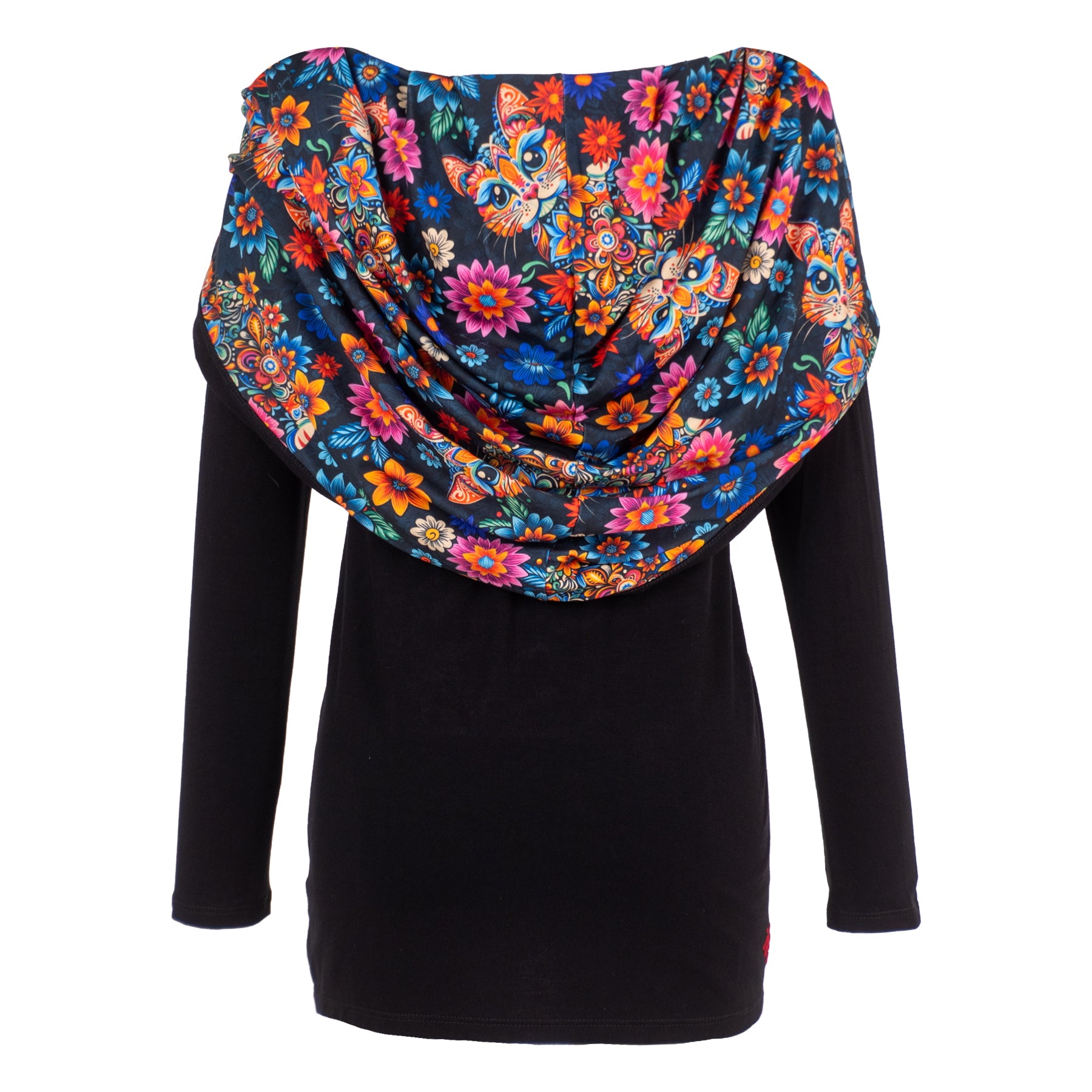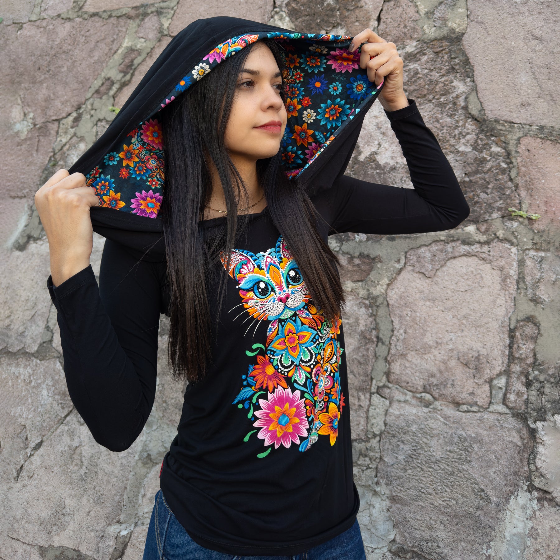 Blusón con gorro estampado con aplicación de pedrería para mujer - Modelo GATITO GATITO