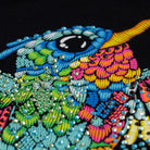 El diseño simula la técnica del bordado artesanal. Inspirado en el quetzal, cuenta con aplicaciones de pedreria que dan brillo al diseño.