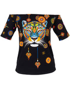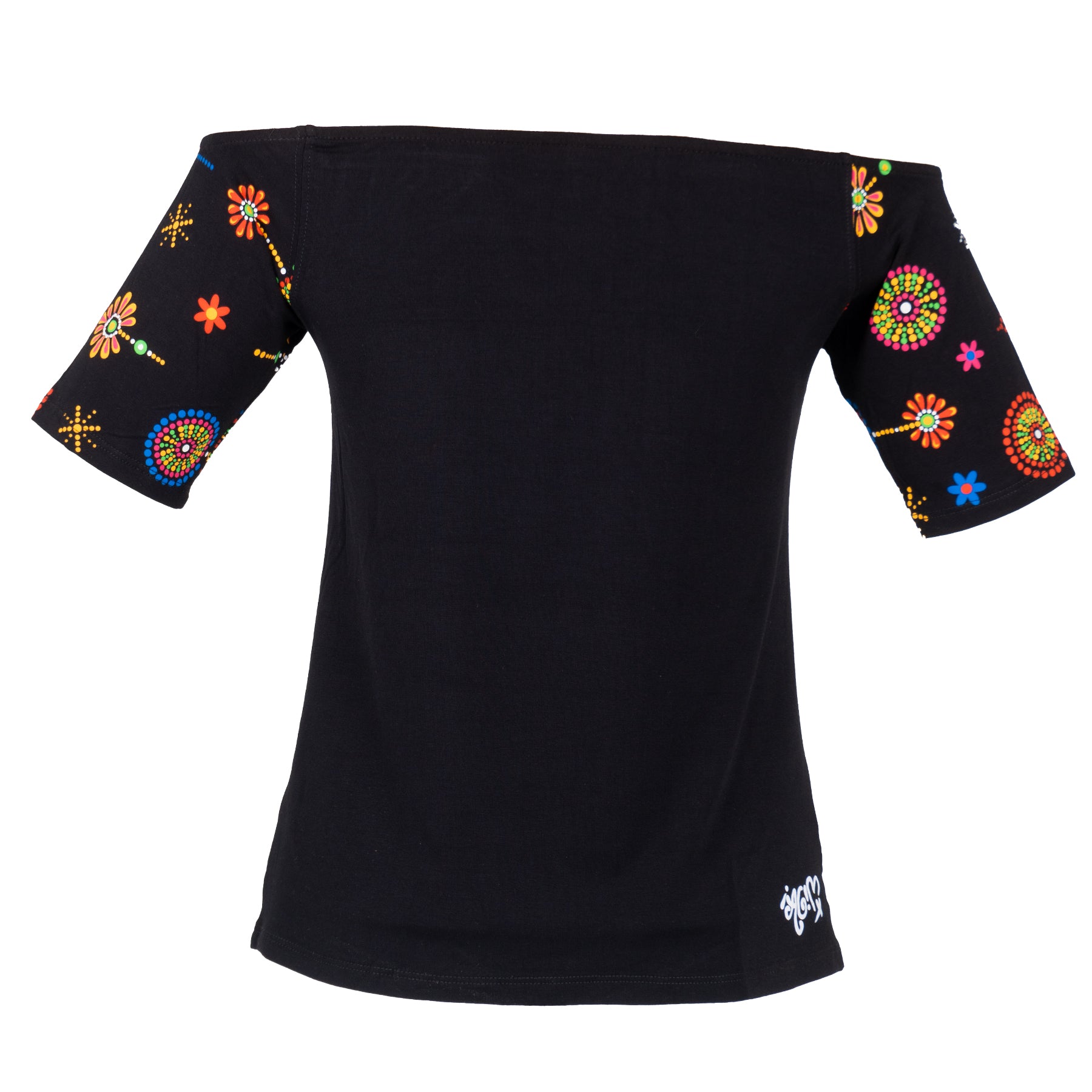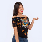 Playera de hombros descubiertos con estampado asimétrico de gran formato para mujer - Modelo SINALOENSE
