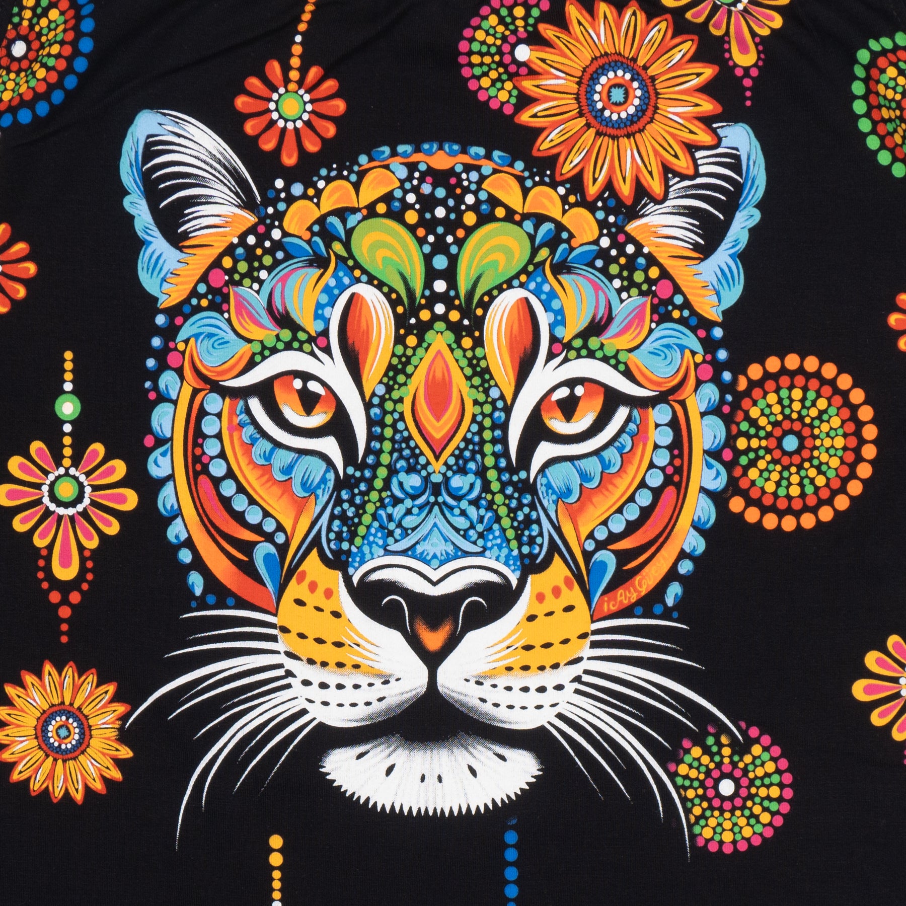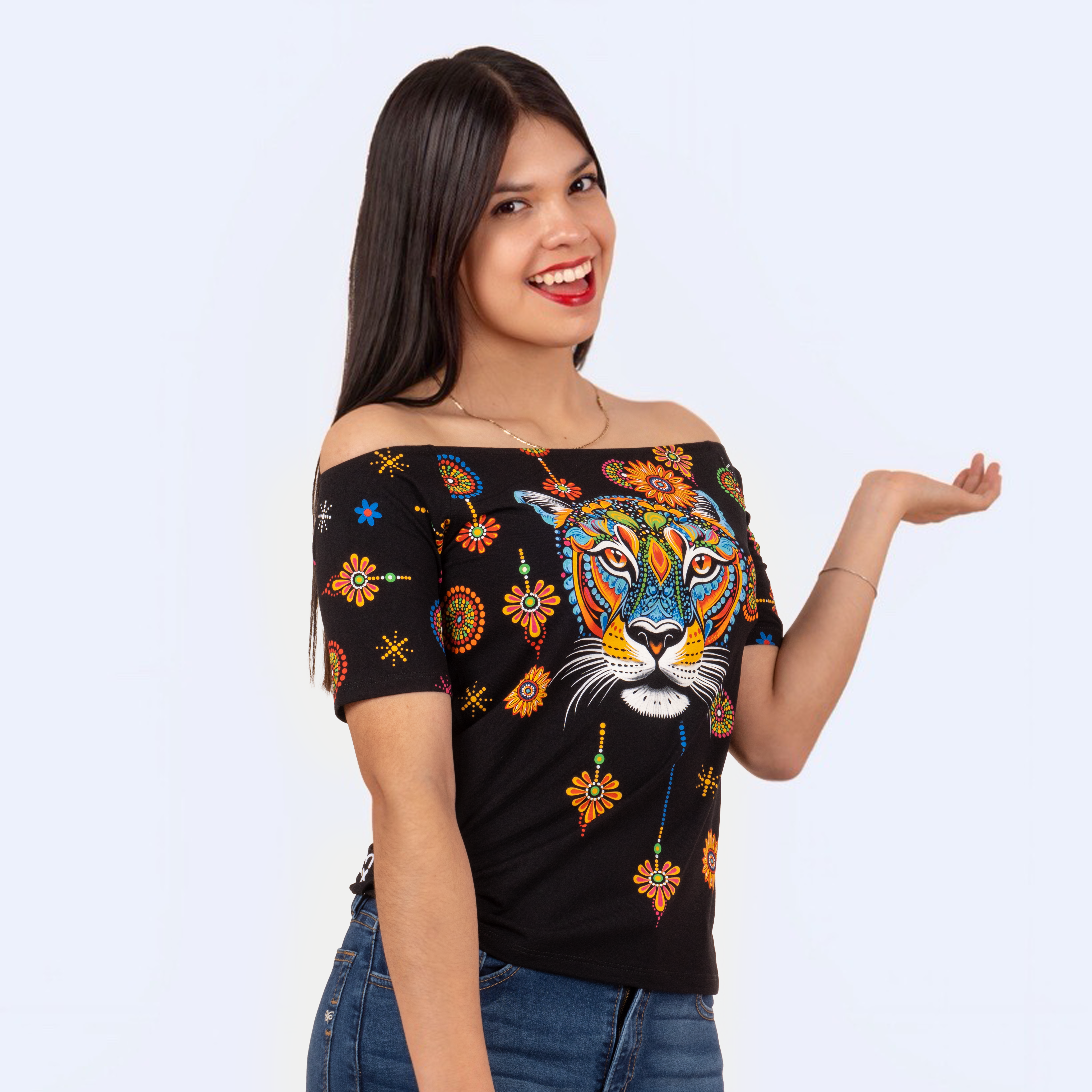 Diseño inspirado en el emblemático jaguar su belleza y estilo decorado a la ¡Ay Güey! con motivos florales que se expanden por toda la prenda.