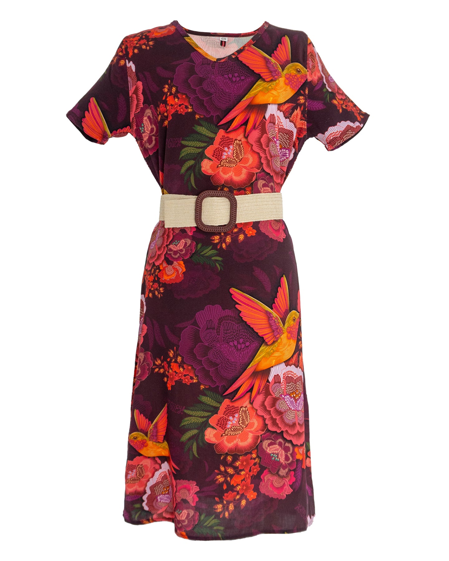 Vestido de dama con manga corta. sublimado. La inspiración de este diseño el colibrí que es una figura prominente en la cosmovisión mexicana, especialmente dentro de la cultura prehispánica. Representa la vitalidad, el amor y la belleza. En diversas tradiciones indígenas, se asocia con la energía y el renacimiento Por otro lado, las flores mexicanas tienen un rol fundamental en las tradiciones del país al combinar ambos elementos trata de representar la conexión entre lo natural y lo espiritual.