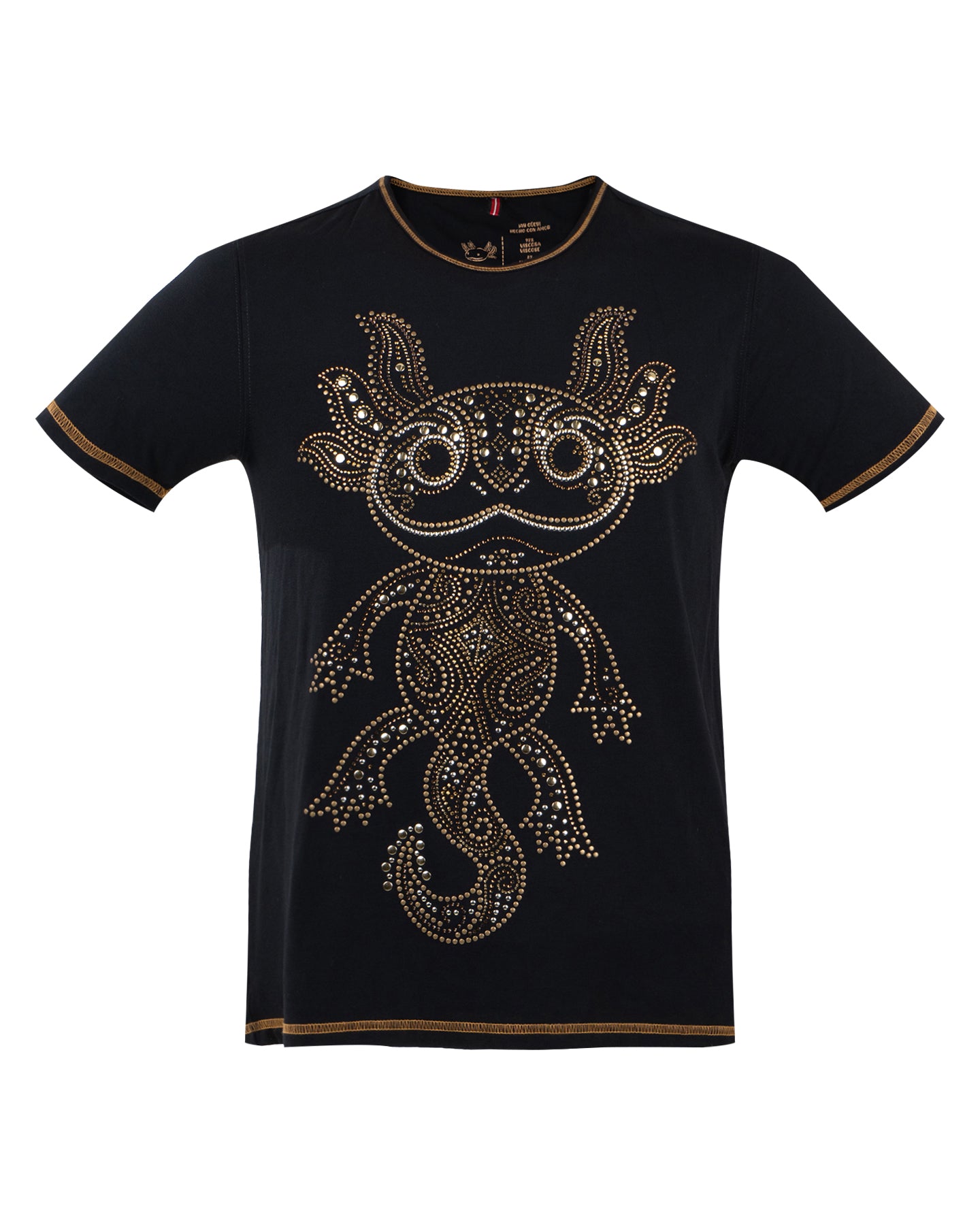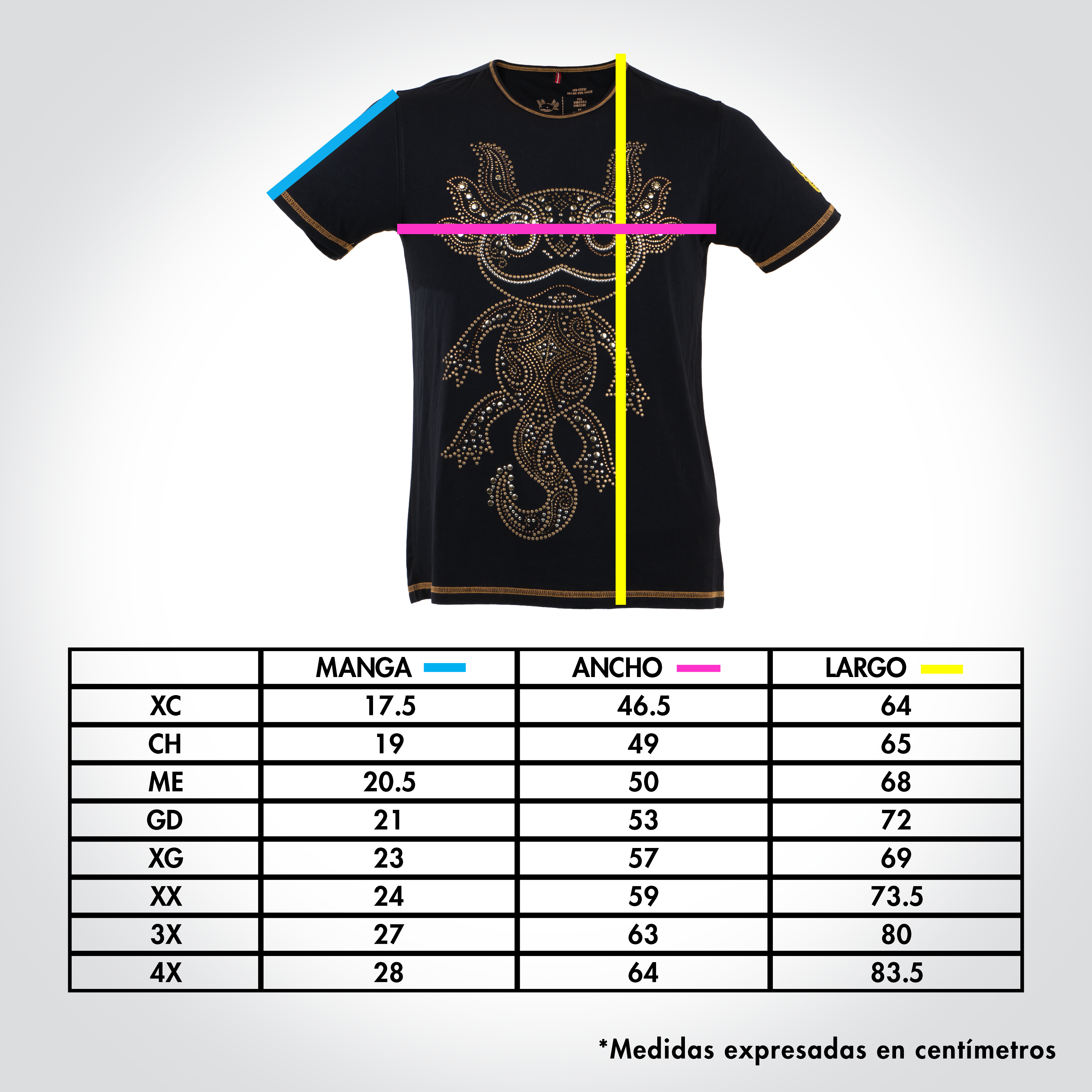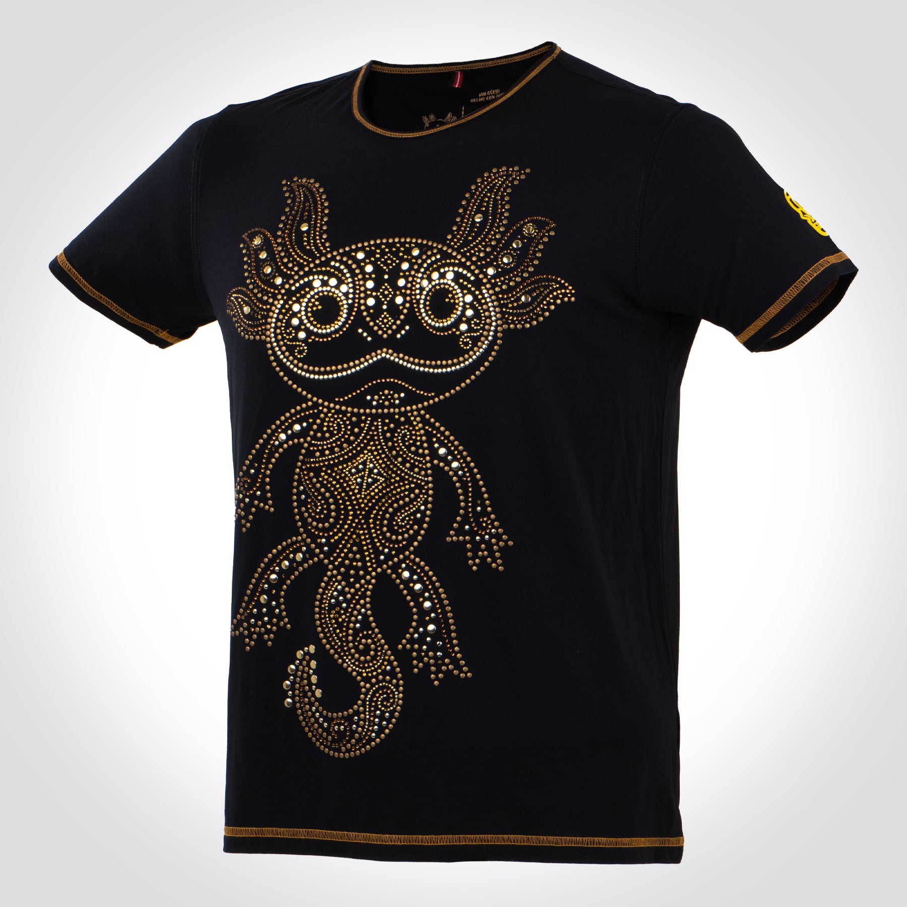 Playera de caballero, cuello redondo, con diseño de ajolote de estoperoles dorados. esta playera es perfecta para unir a la familia en un look único y elegante. Costuras color oro que le dan un toque aún más especial.