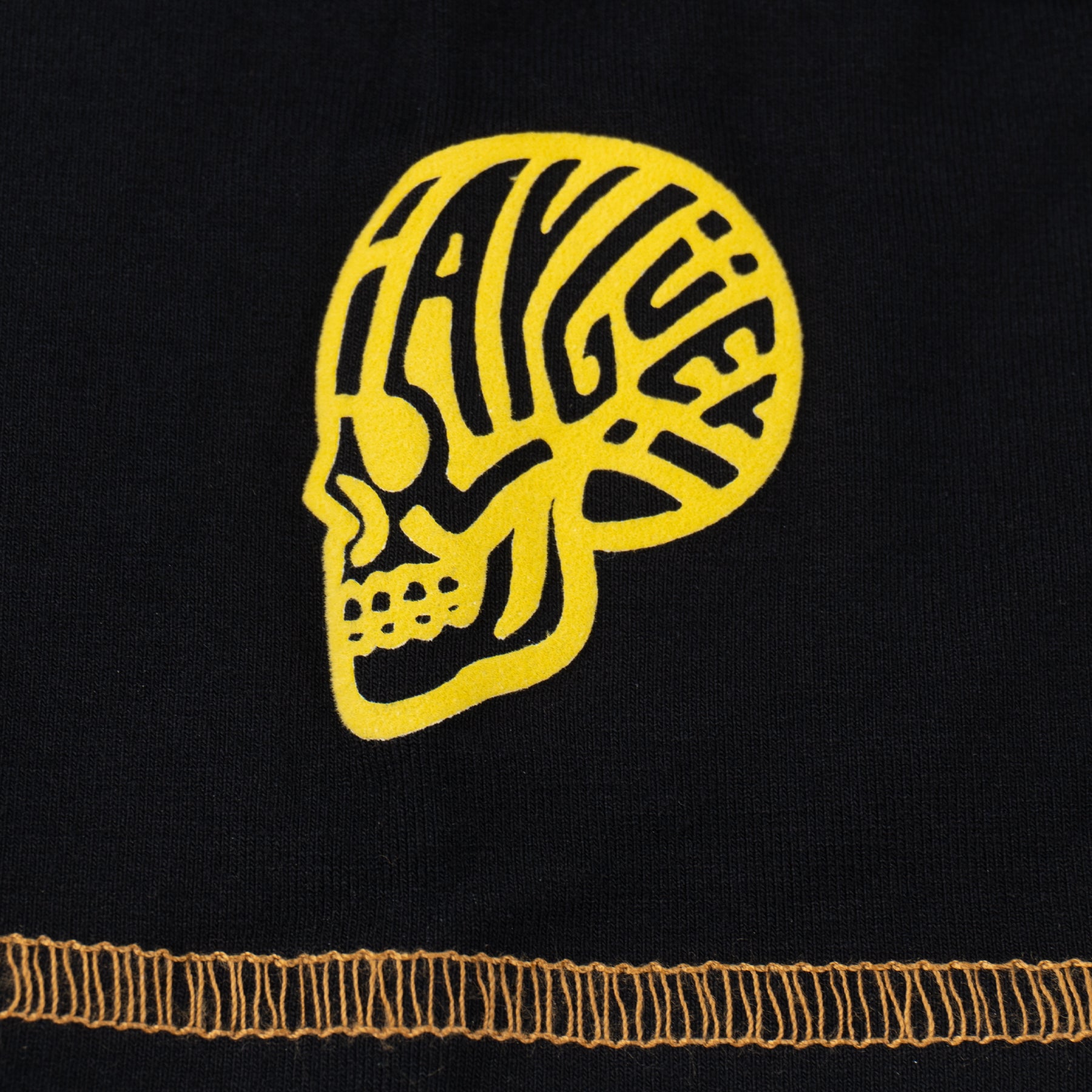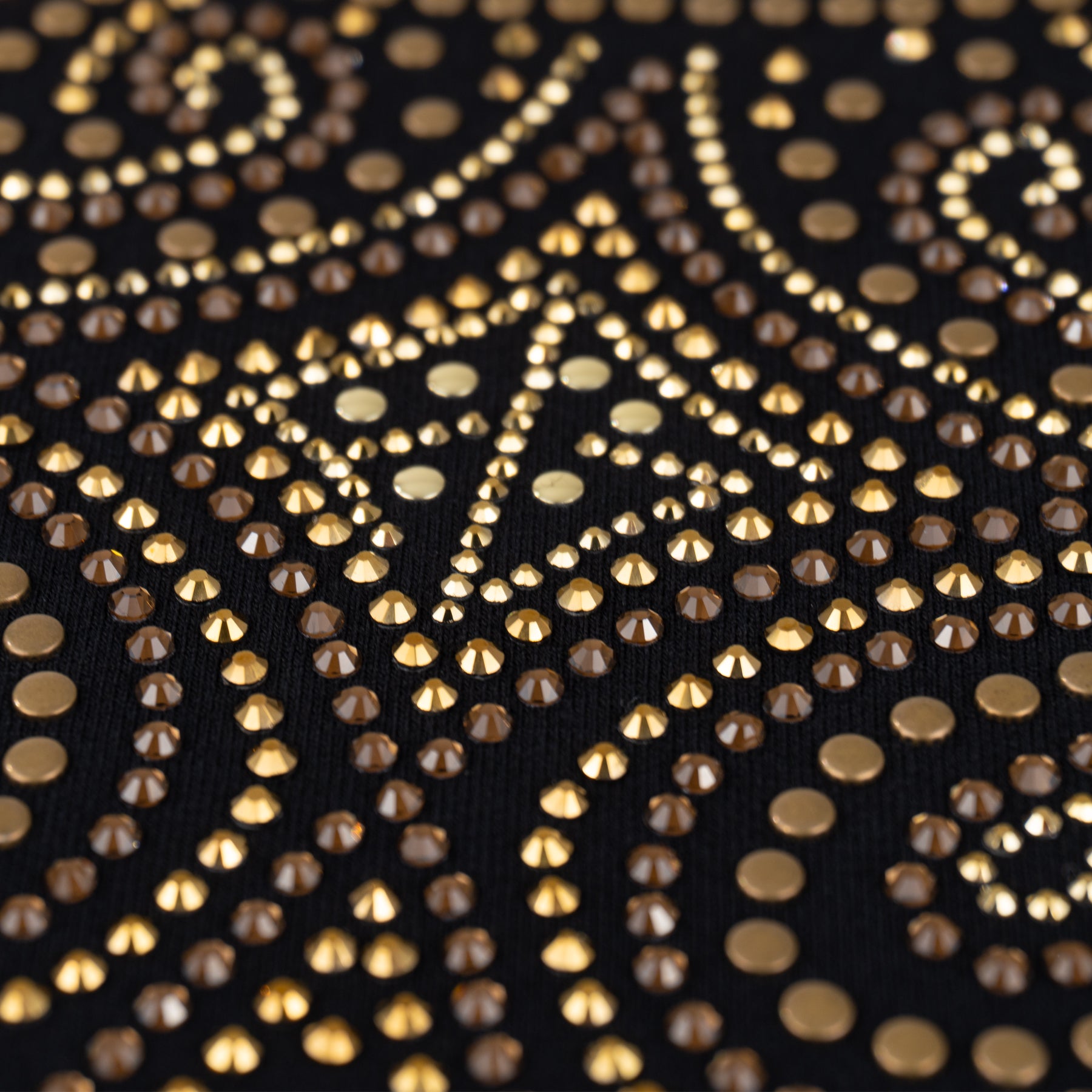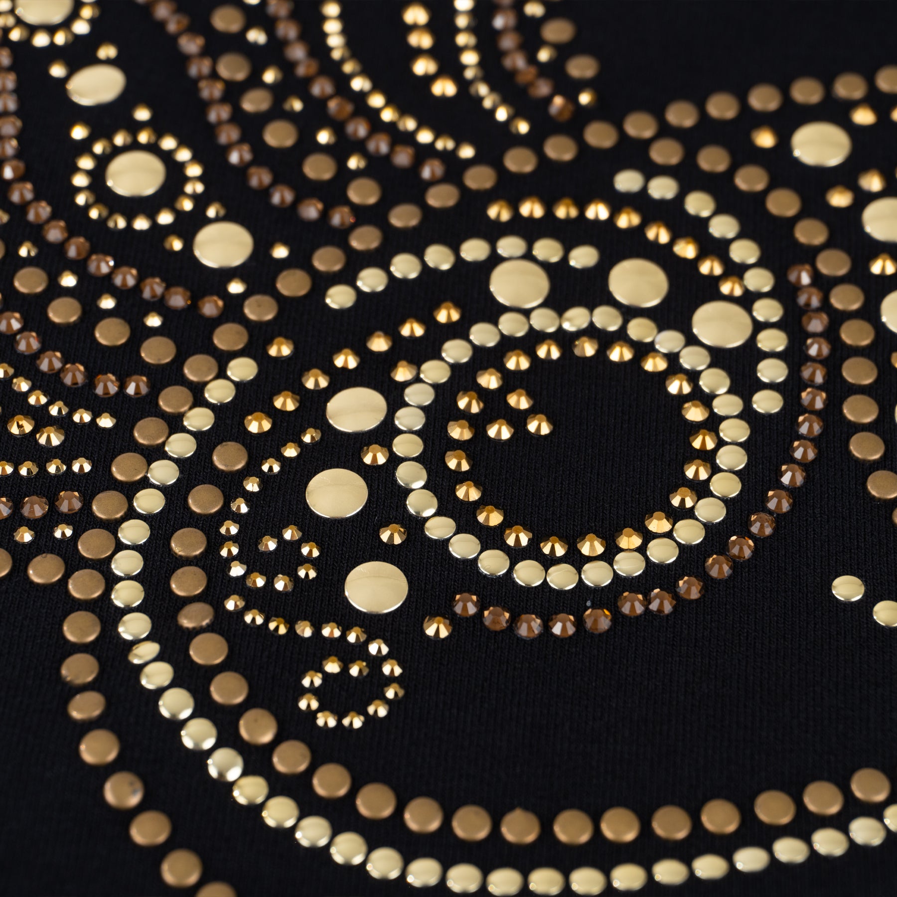 Playera de caballero, cuello redondo, con diseño de ajolote de estoperoles dorados. esta playera es perfecta para unir a la familia en un look único y elegante. Costuras color oro que le dan un toque aún más especial.