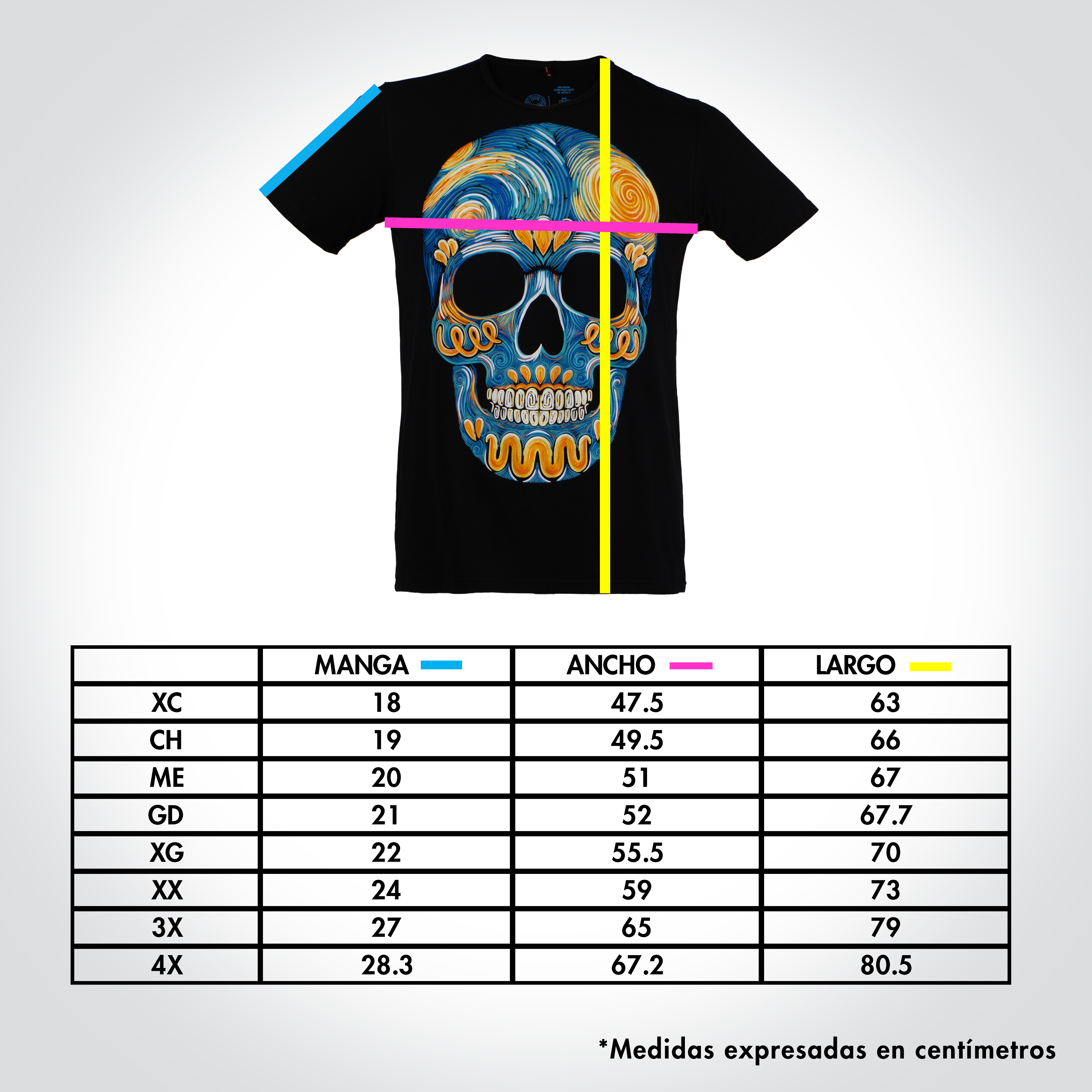 Playera en color negro para adulto inspirado en nuestras clásicas calaveras de azúcar, esta vez brindando un homenaje al pintor Vincent Van Gogh, porque en México también podemos hacer arte con las cosas más cotidianas.