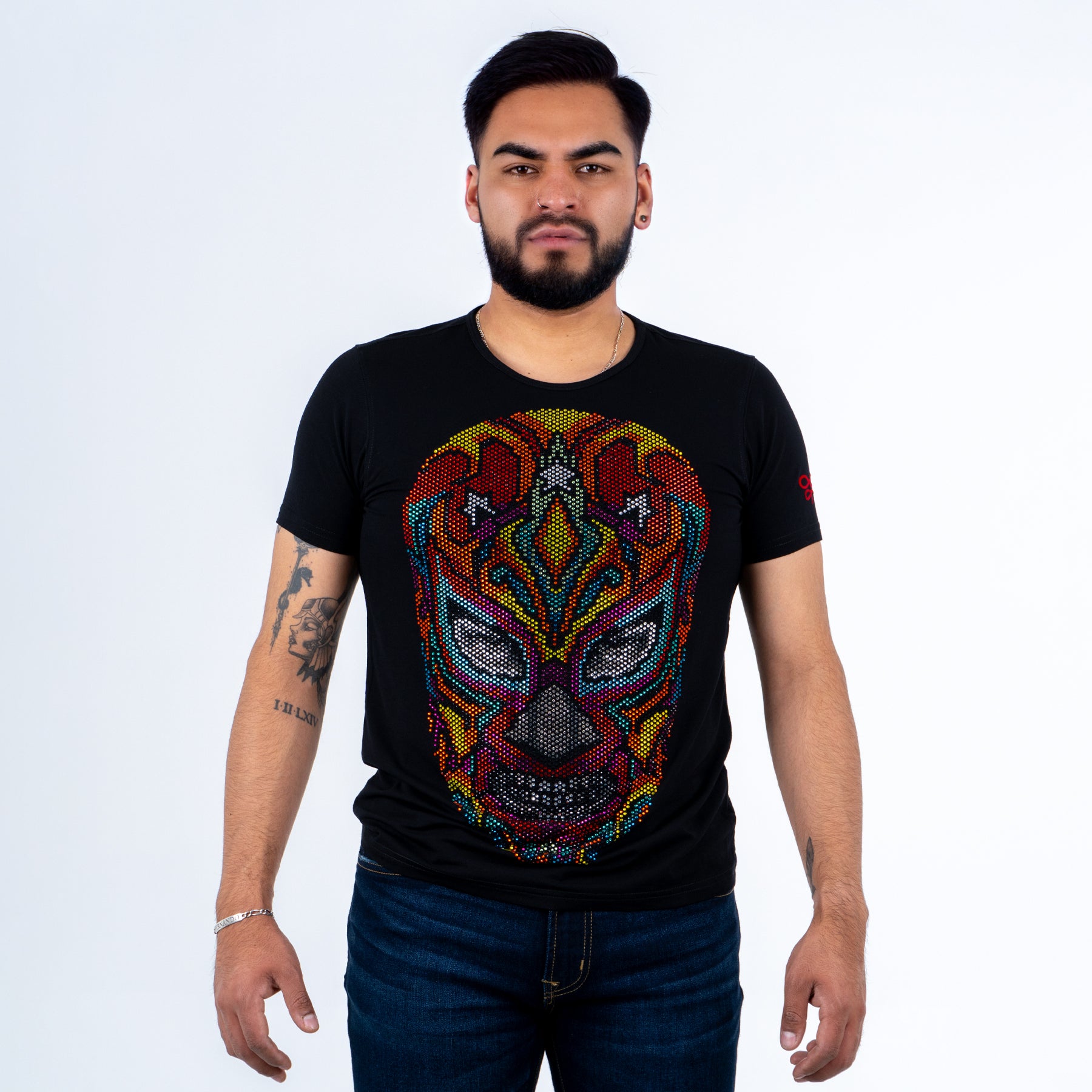 Imagina sentir la adrenalina de la lucha libre con cada movimiento. Nuestra playera de manga corta con pedrería te transportará al ring, permitiéndote lucir como un verdadero campeón.