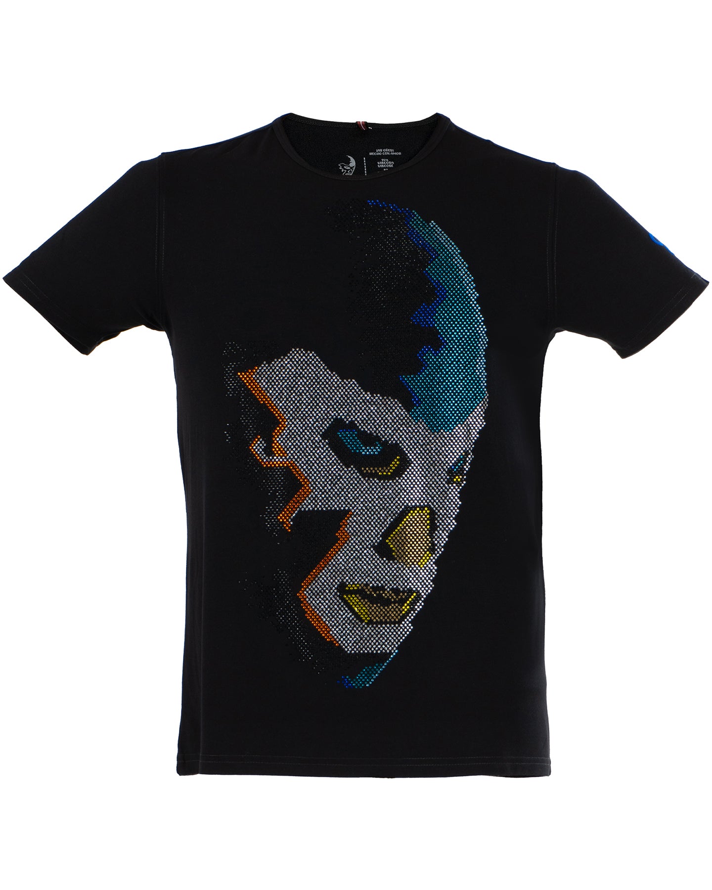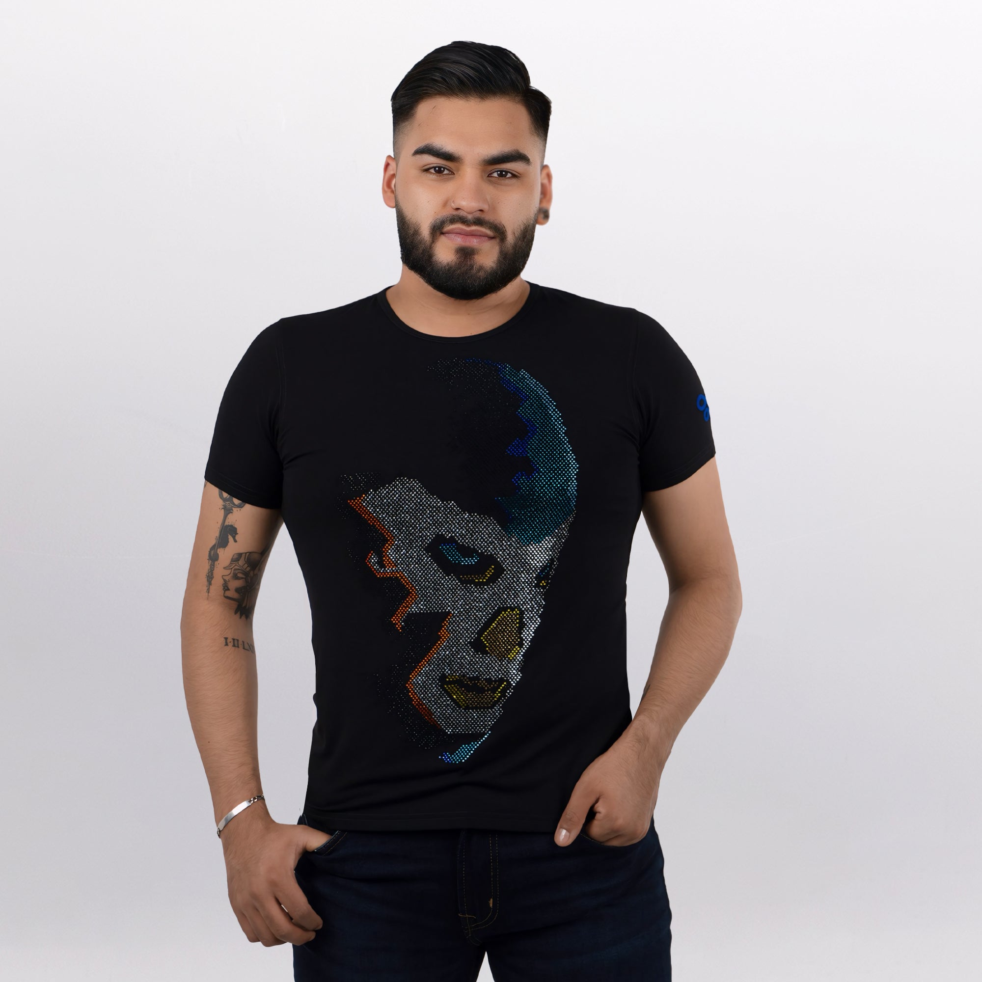 Inspirado en un famoso luchador que cuida con sigilo las calles de México. Playera de caballero con aplicaciones de piedra brillante, que en su conjunto forman al misterioso personaje.