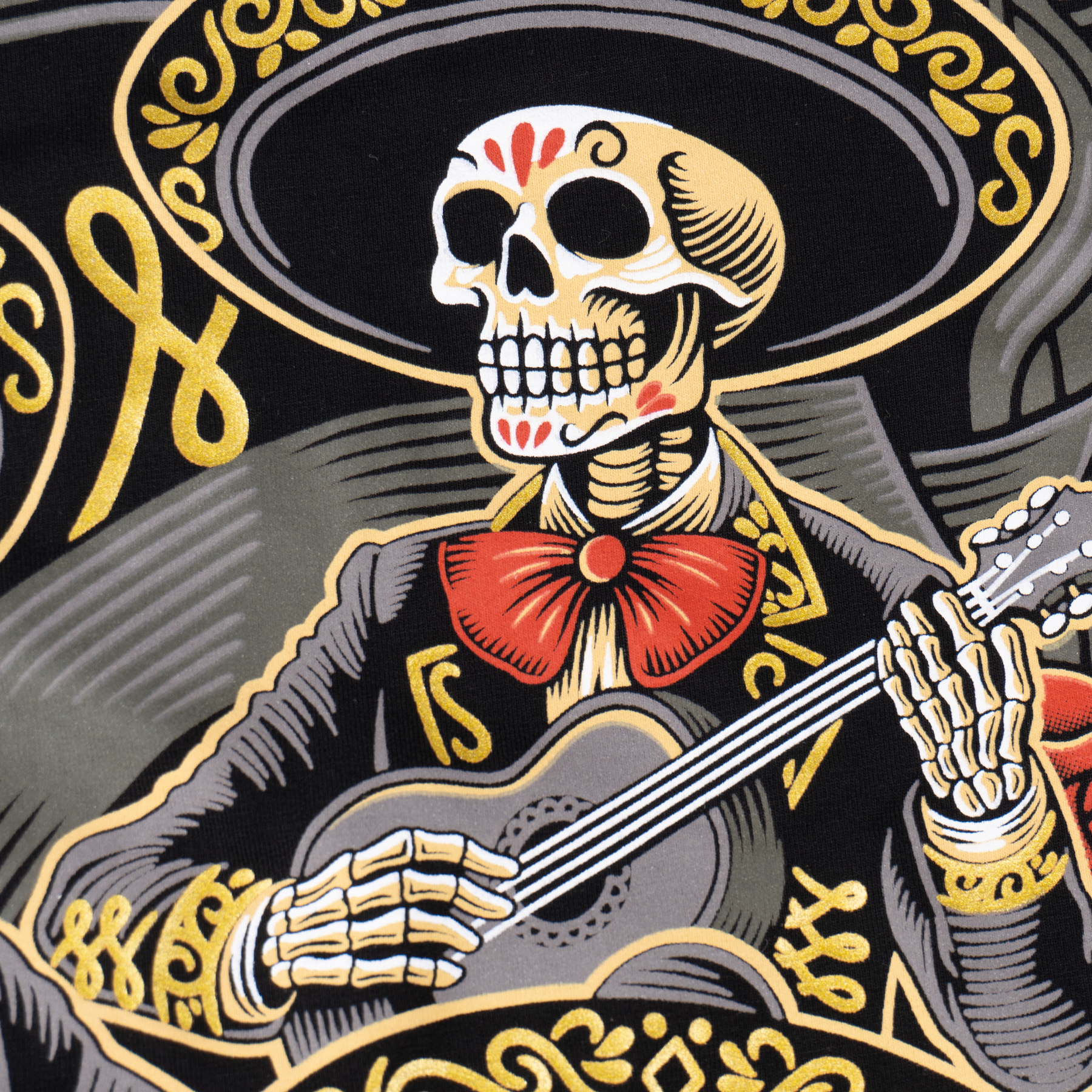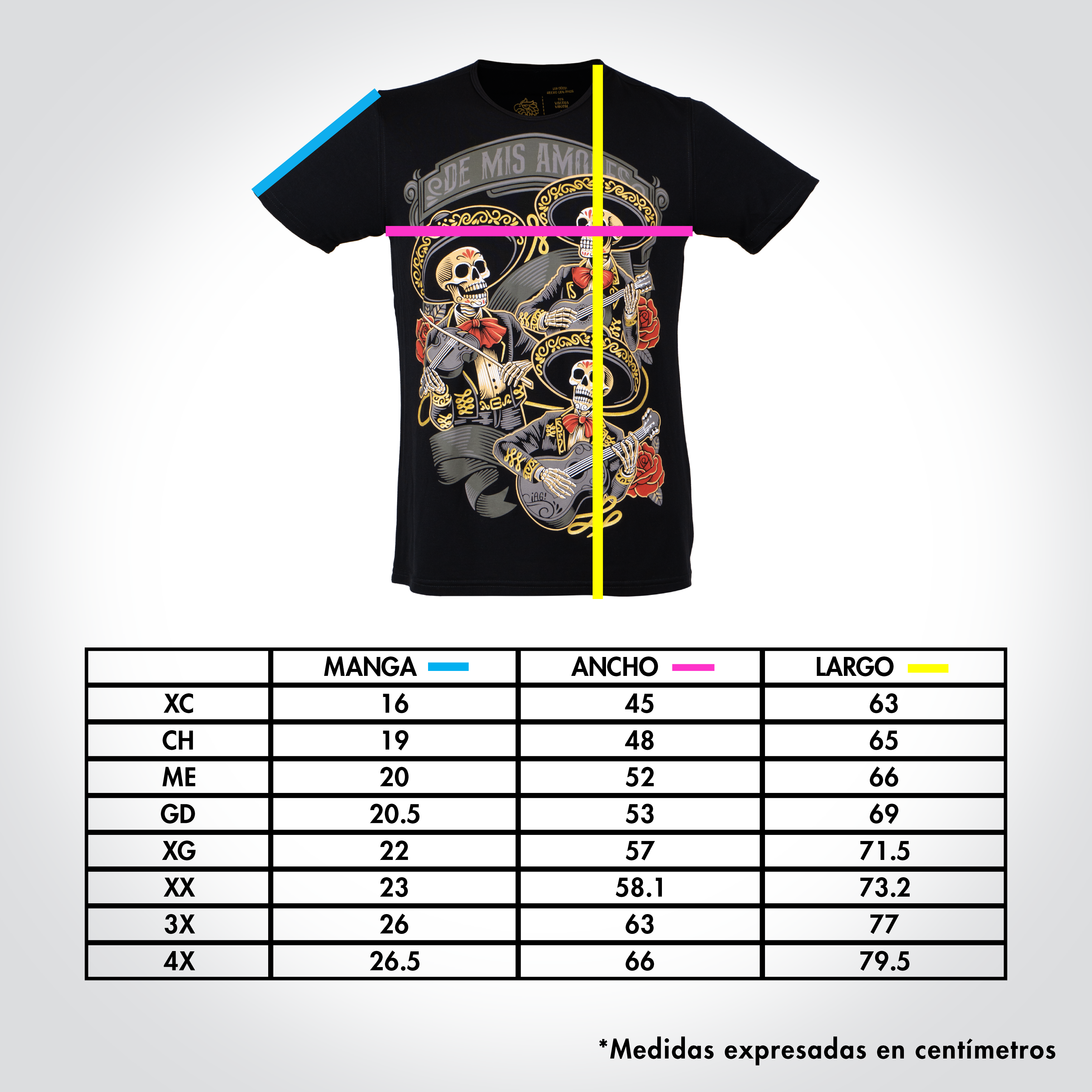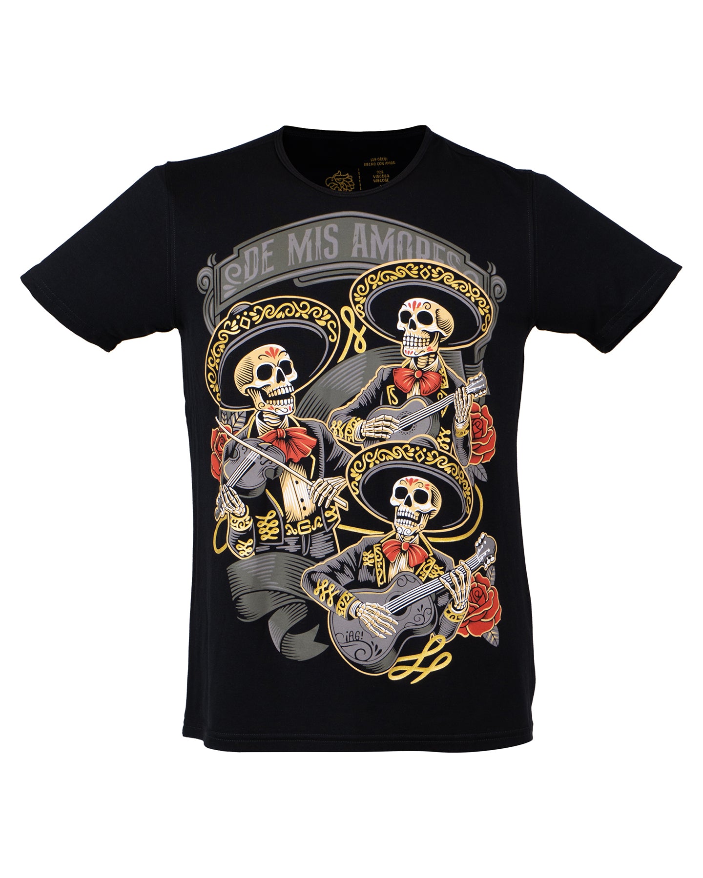 Playera de caballero en color negro inspirada en uno de los patrimonios culturales que son los mariachis un elemento de la cultura mexicana a través del cual se transmiten valores, historia y sentimientos.
