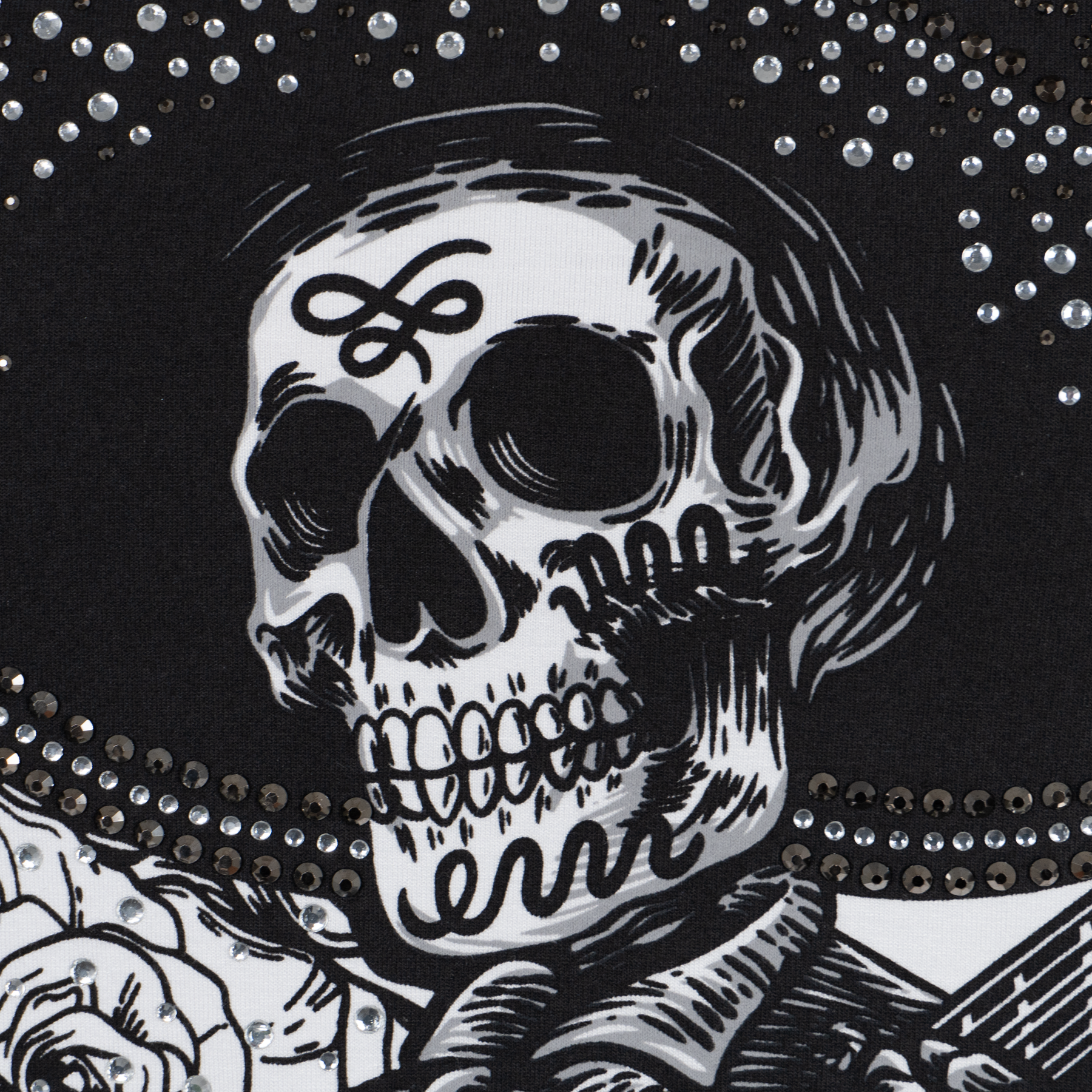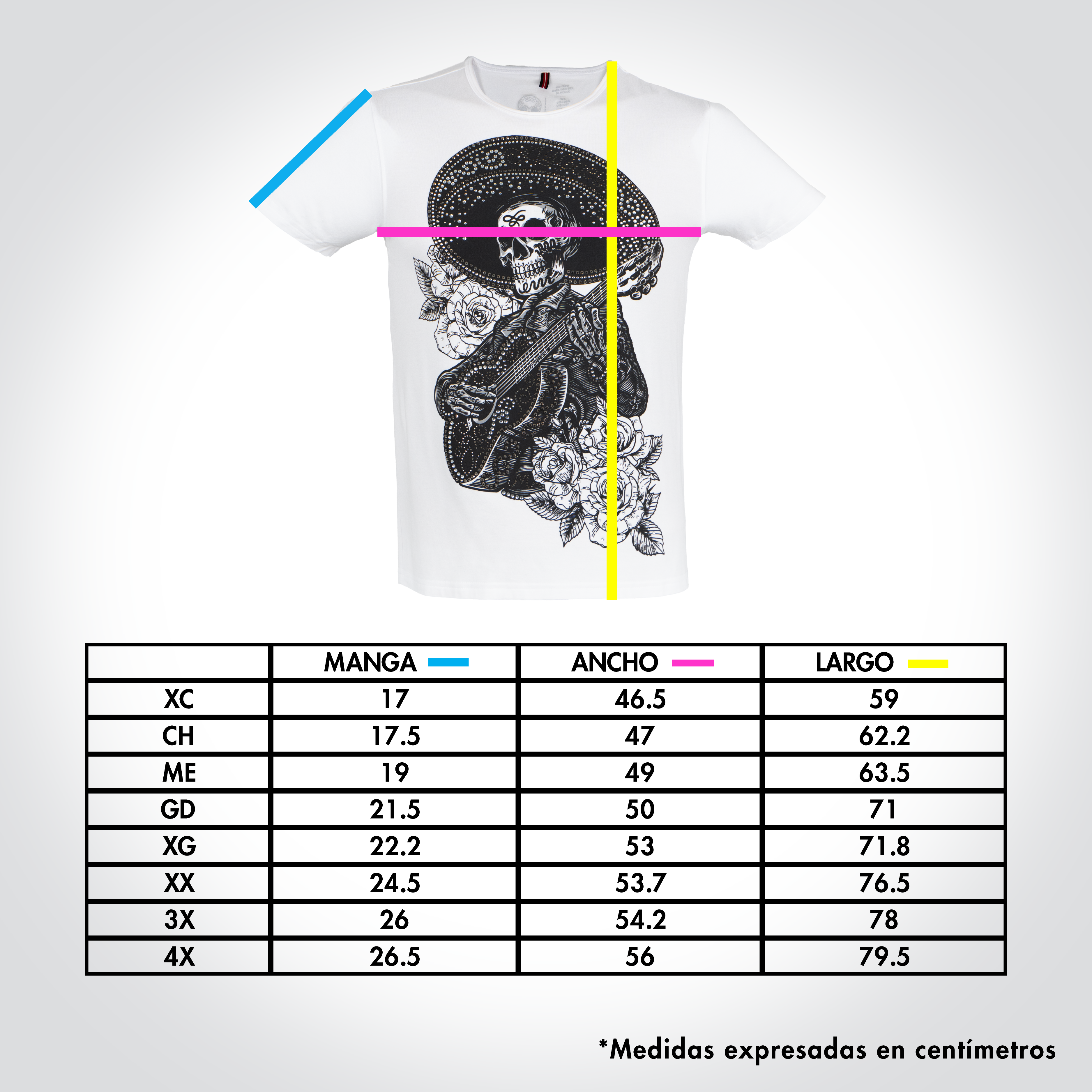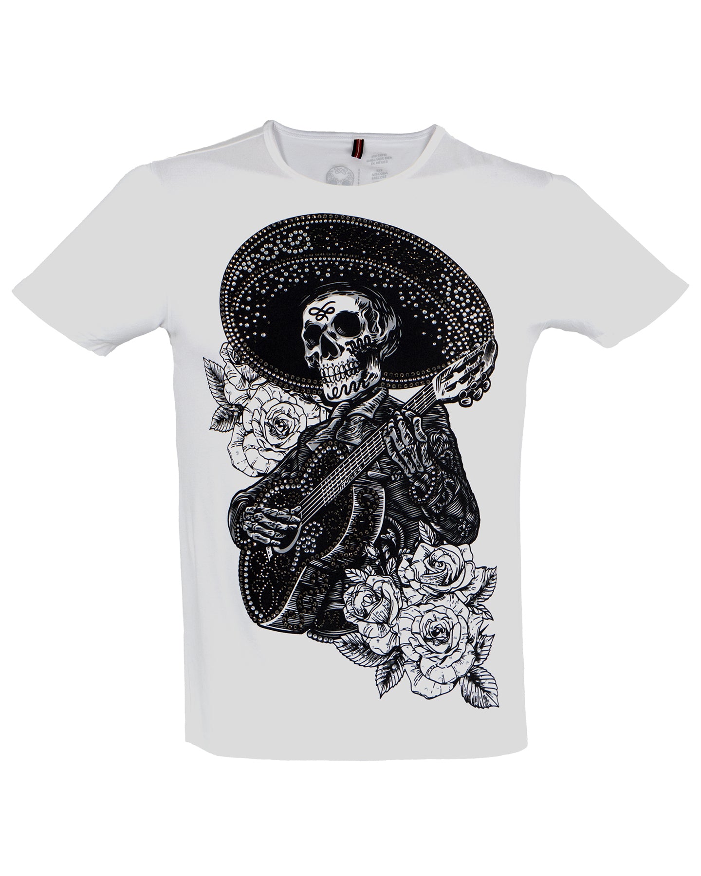 Playera de caballero color blanca con estampado en tintas base agua y pedreria. Basada en nuestro exitoso modelo "El rey" se propuso una nueva gama de colores, muy distinta a la original pero conservando la elegancia y el detalle. Las piedras en tonos plata adornan la prenda dándole más sobriedad.