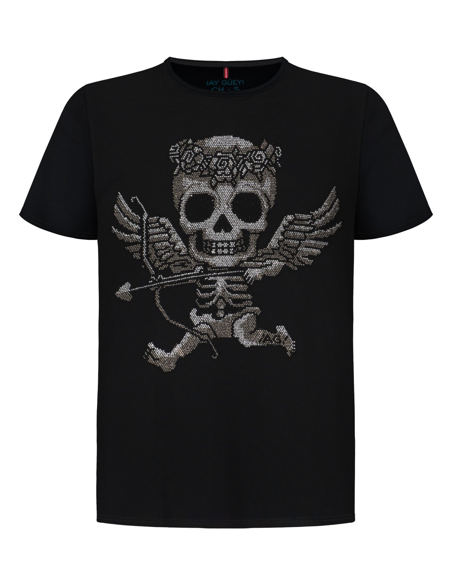 La playera MIGUELITO es la pieza clave para un estilo que desafía lo convencional. Sobre un fit clásico en color negro, se presenta un impactante diseño central: una calavera (inspirado en un cupido), coronado con flores y con arco y flecha. Este arte está cubierto completamente con pedrería plateada, un acabado que no solo le da un brillo espectacular, sino una textura de lujo y una presencia visual inigualable