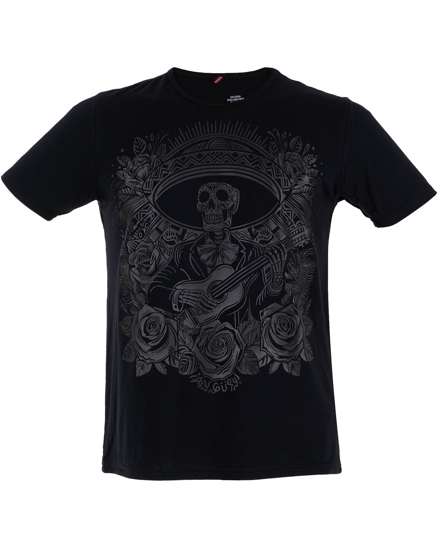 ¡Inspirada en los mariachis! Encarna la pasión y la cultura mexicana con Negra Noche. Playera de hombre, cuello redondo y diseño de charro calavera impreso en gel negro mate simulando la técnica de grabado en relieve. ¡Expresa tu amor por México con estilo y originalidad!