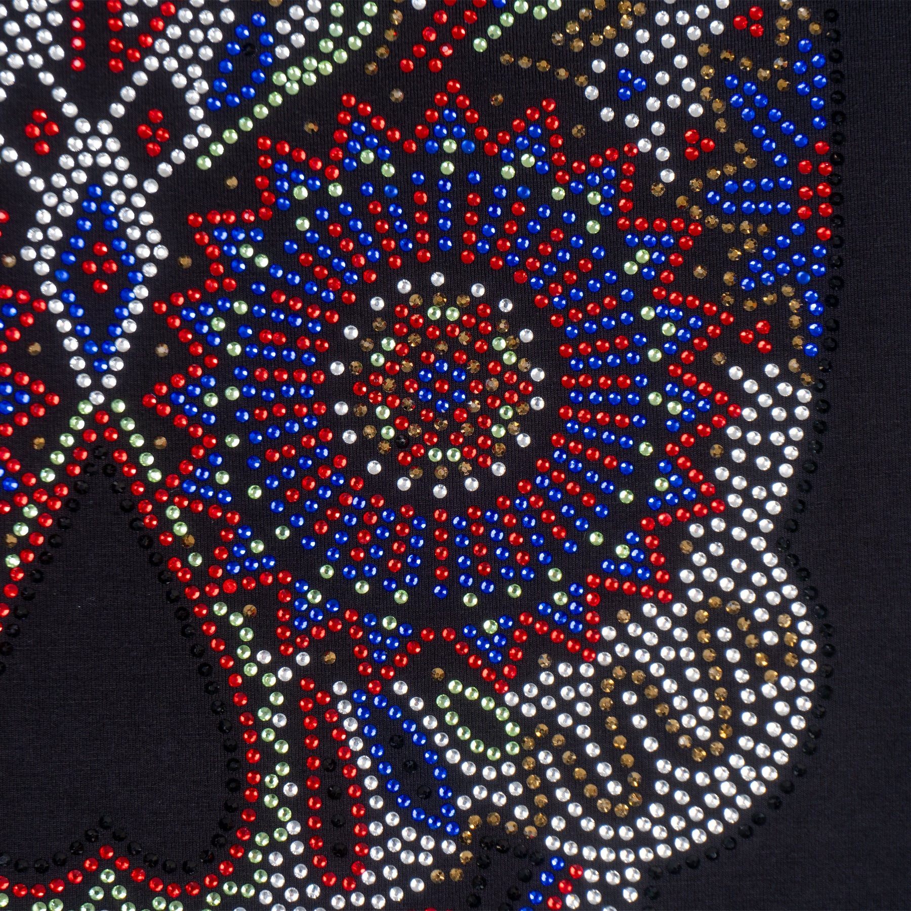 Se utilizó la técnica de pedrería, pegando cada una de estas piedras, dándole vida a esta poderosa calavera. De manera artesanal se juntaron 6 colores en una sola plantilla y se aplicaron por medio de calor. Este diseño tiene 5,919 piezas en tonos rojos, azules, verdes y plateados.