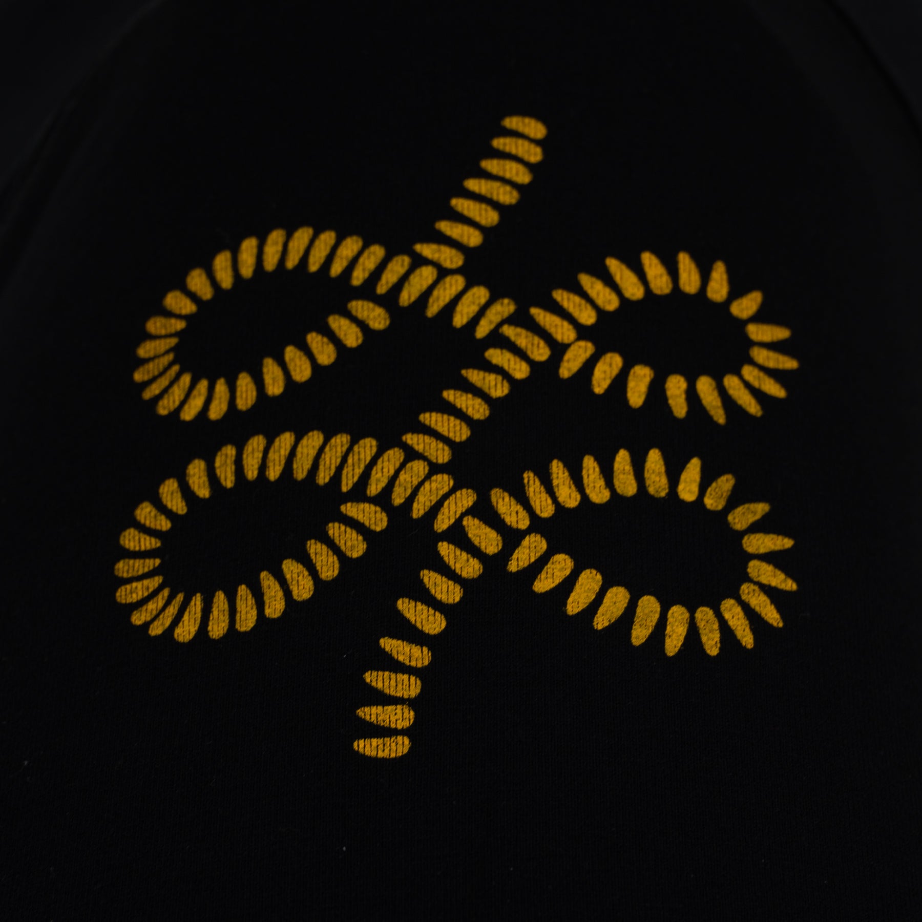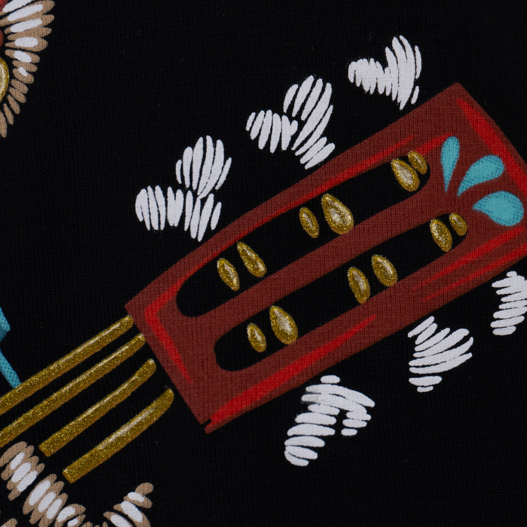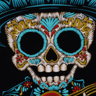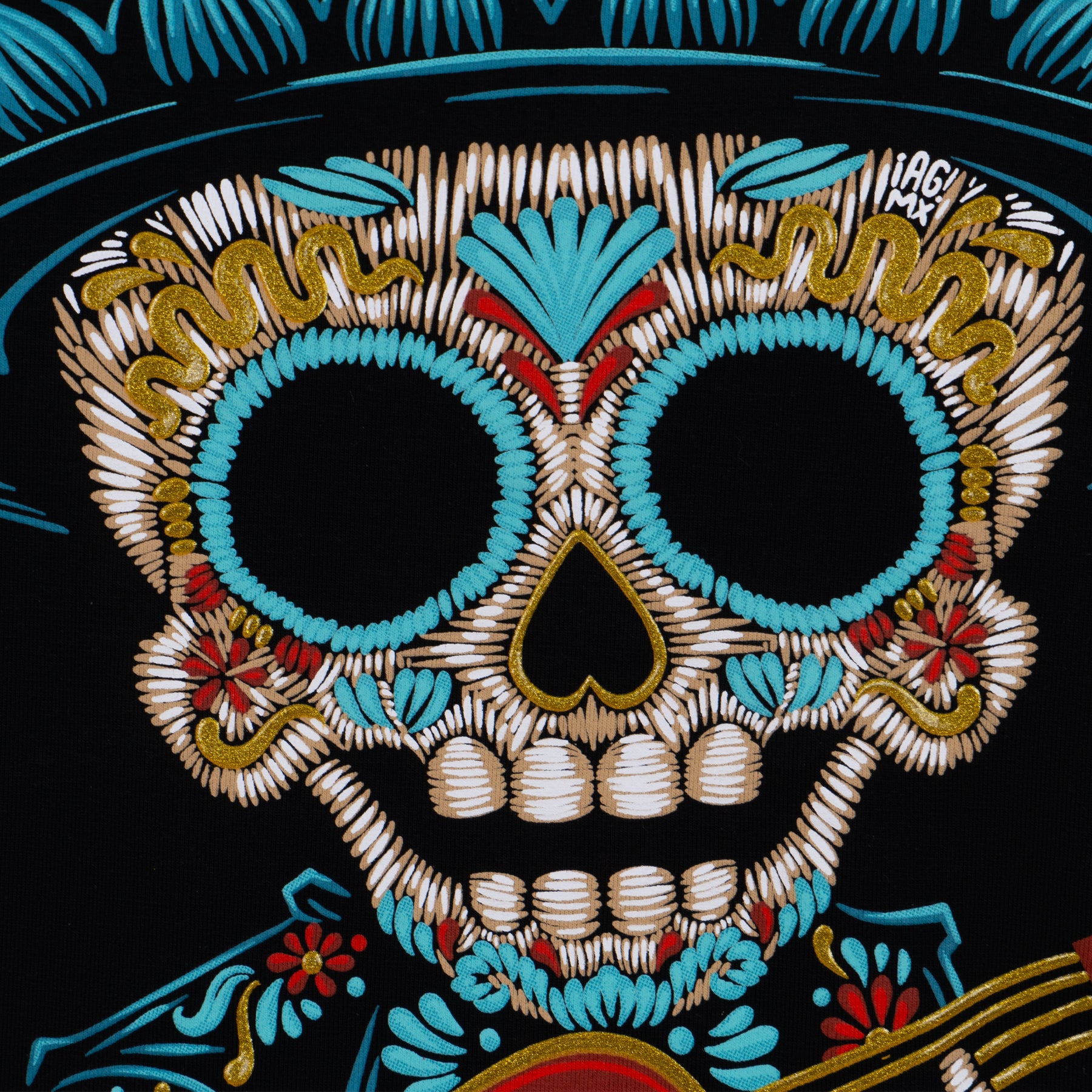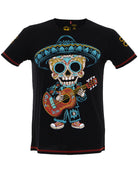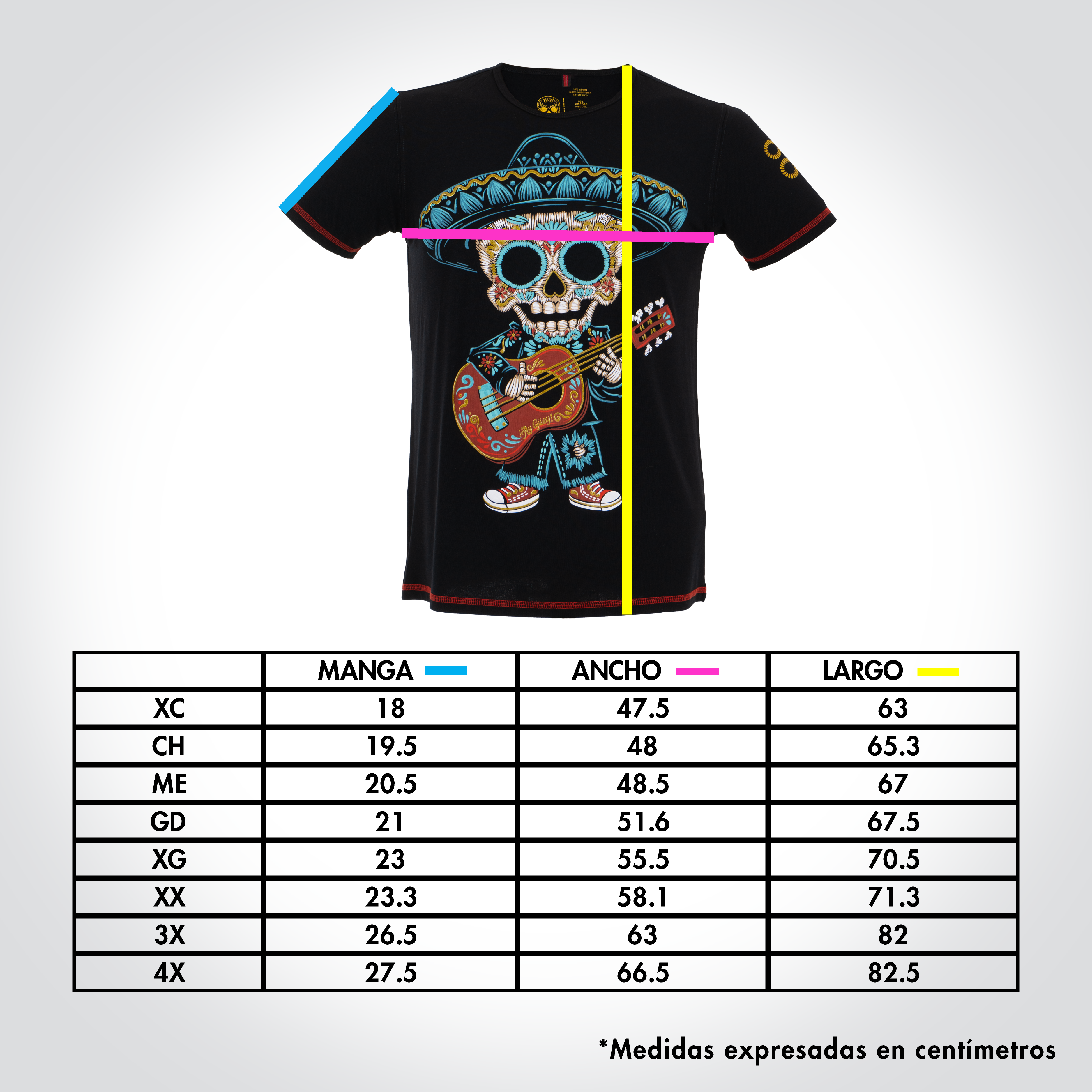 Playera de caballero en color negro y detalles de costura en color con firma en flock en manga. Nuestro catrín ahora representa en un estilo caricaturesco, tiene grandes ojos y una sonrisa traviesa, fusionado con la música del mariachi, y transmitiendo un sentimiento de alegría, tradición, y festividad.