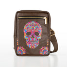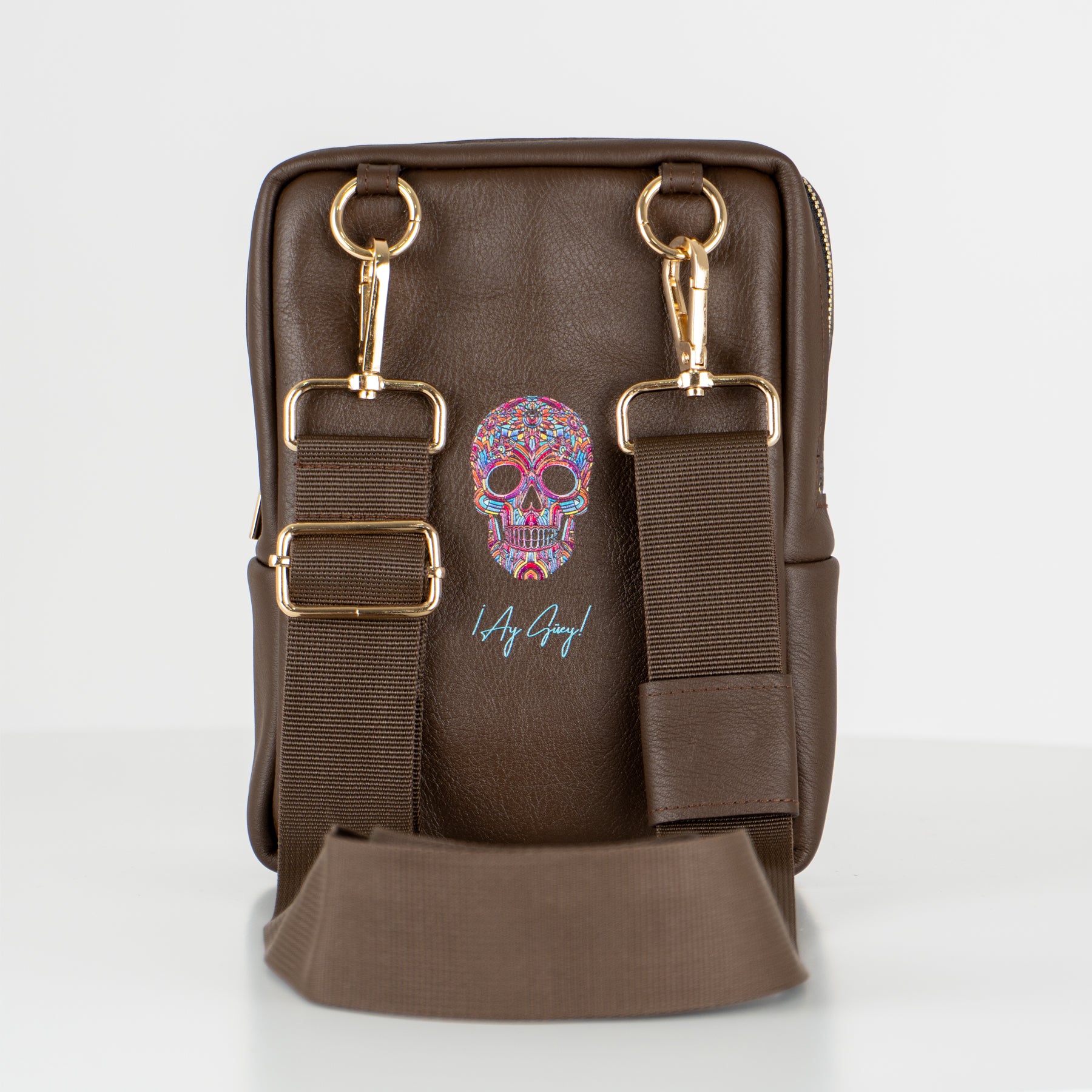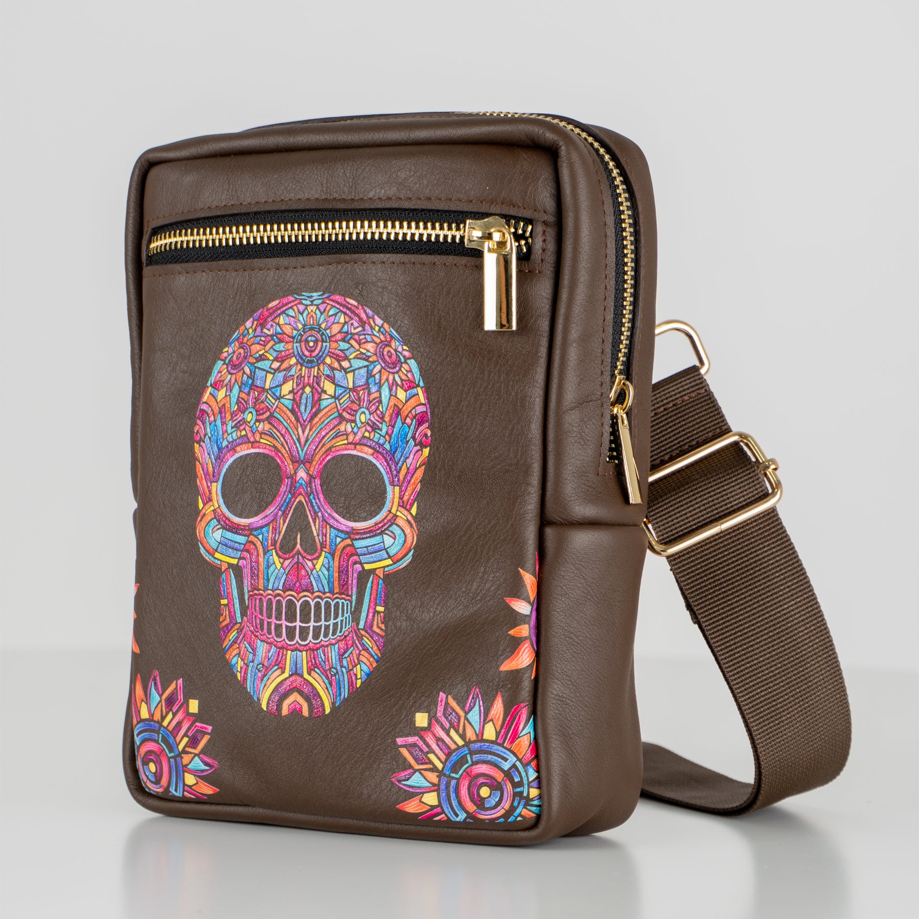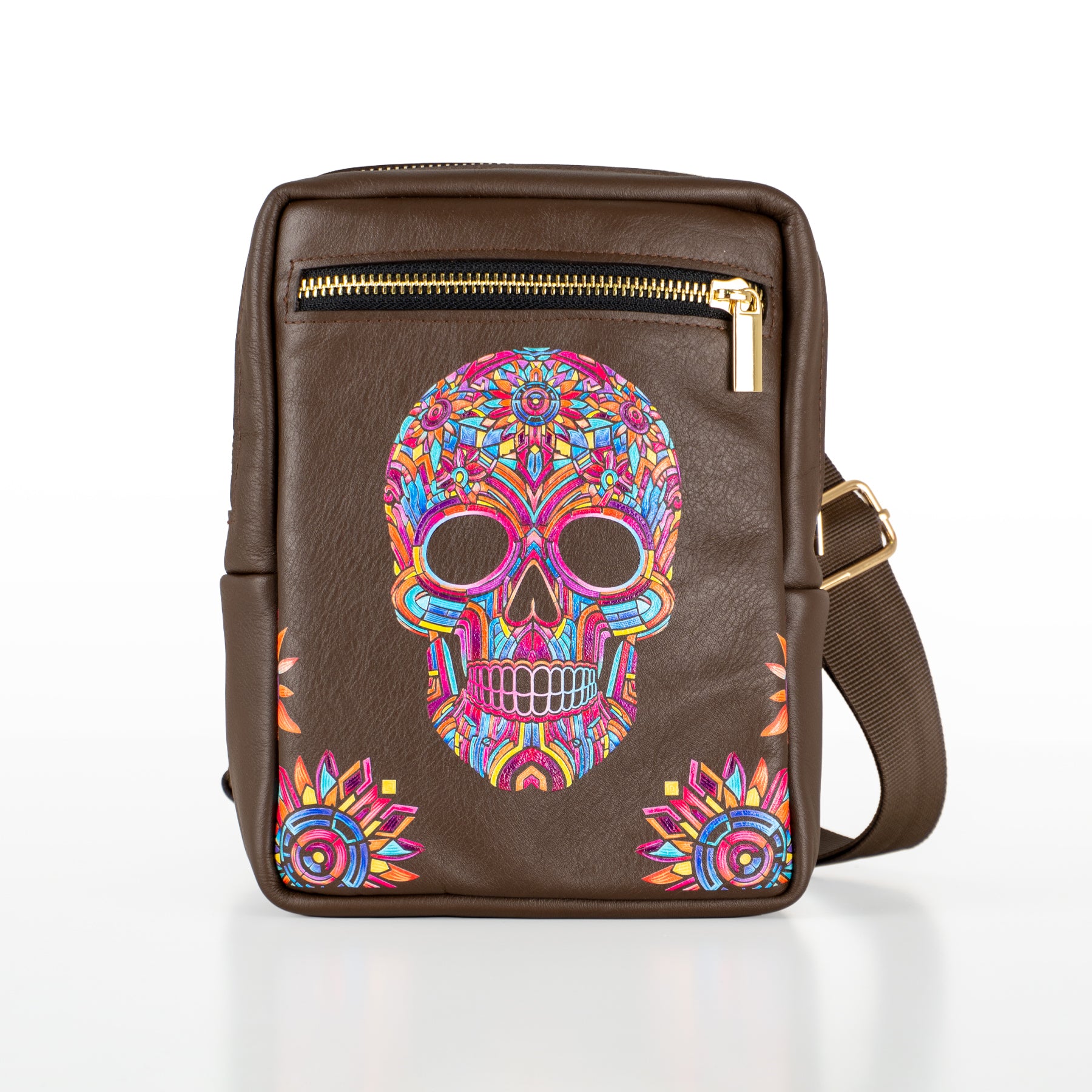 Mochila tipo bandolera, con correa de de tela, inspirada en las calaveras de azúcar y las artesanías mexicanas.