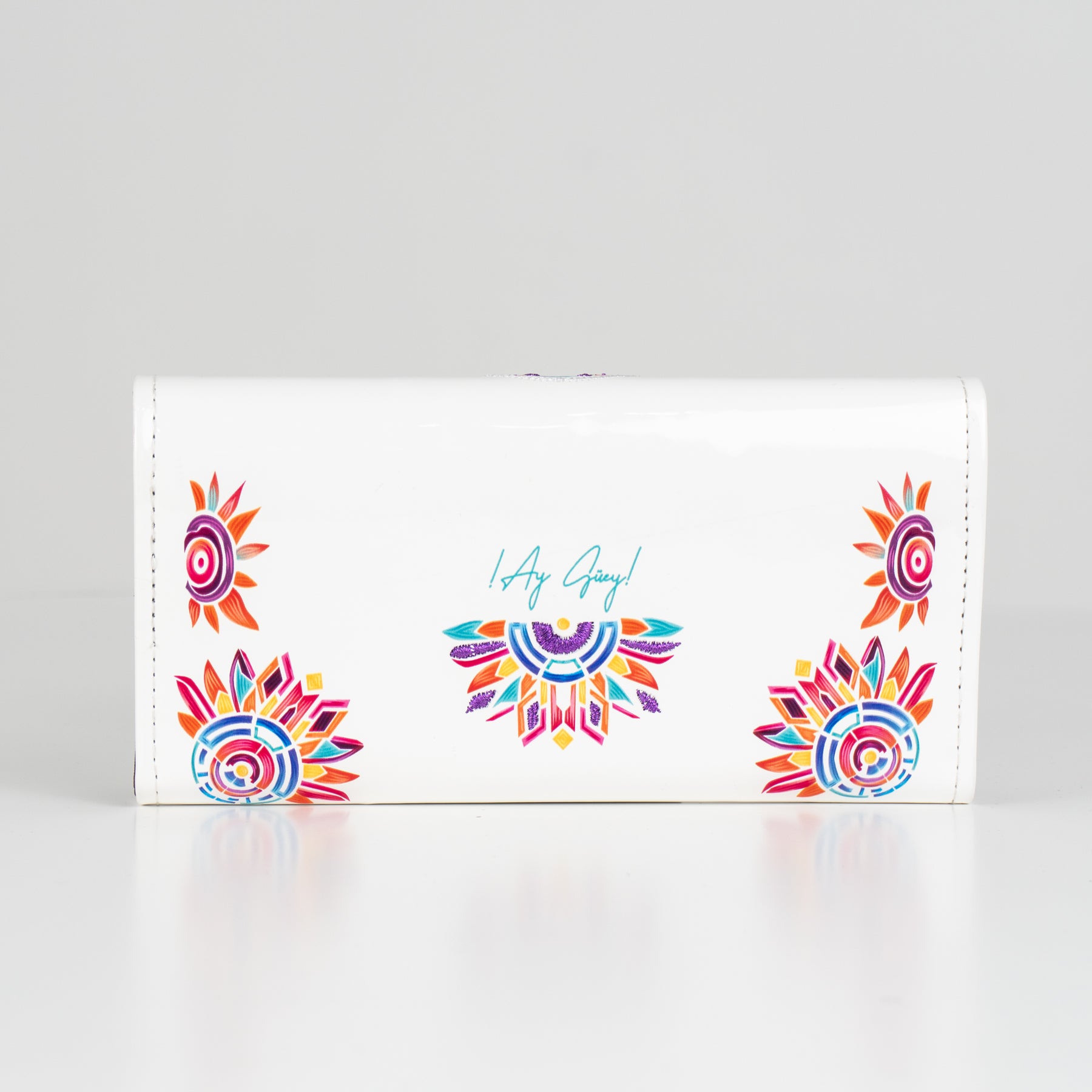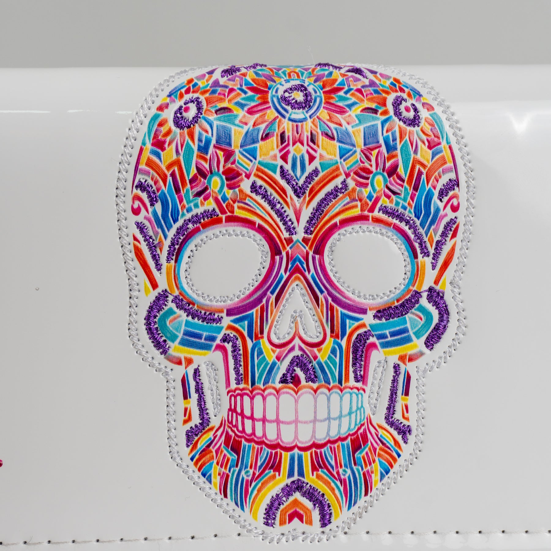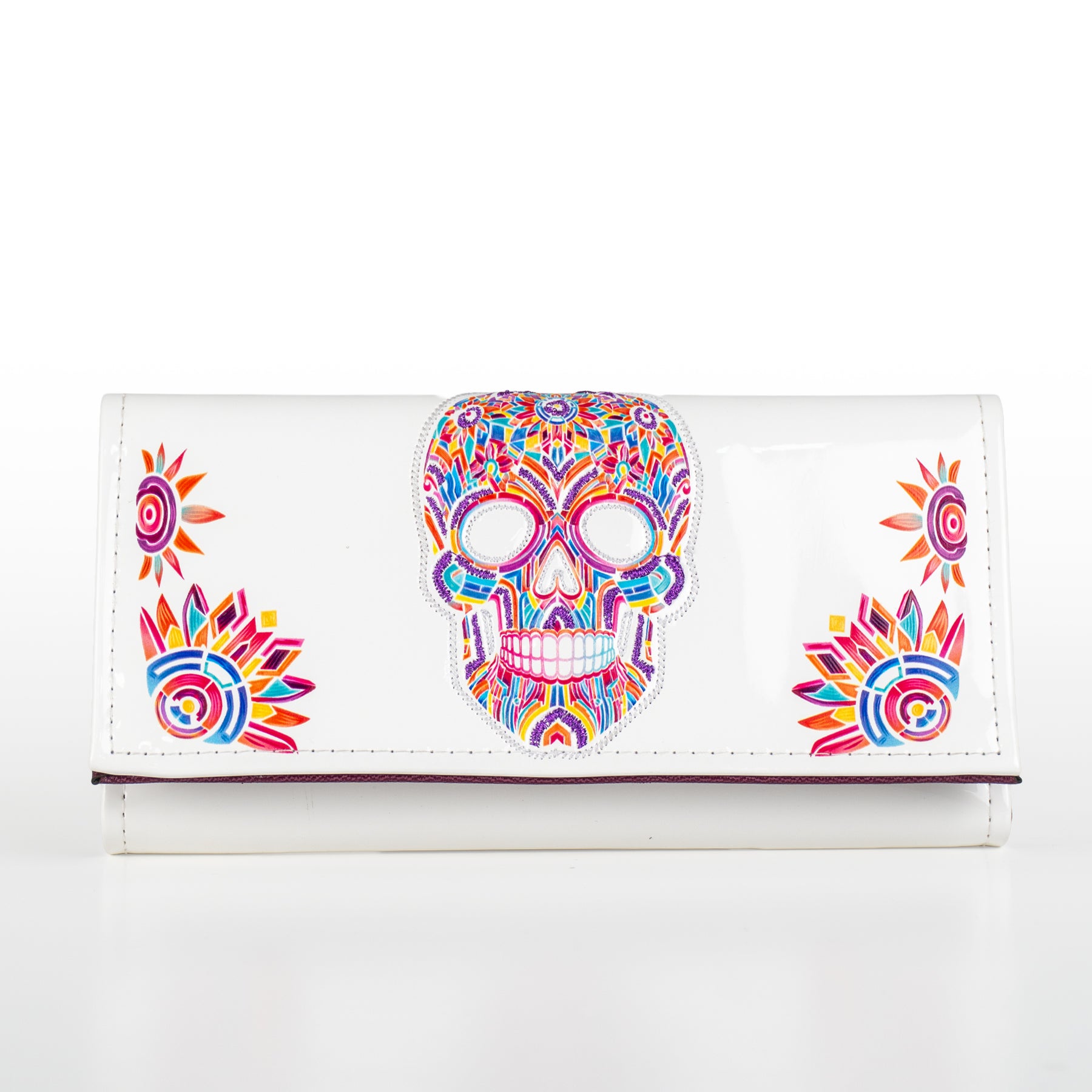 Cartera de dama inspirada en las calaveras de azúcar y las artesanías mexicanas.