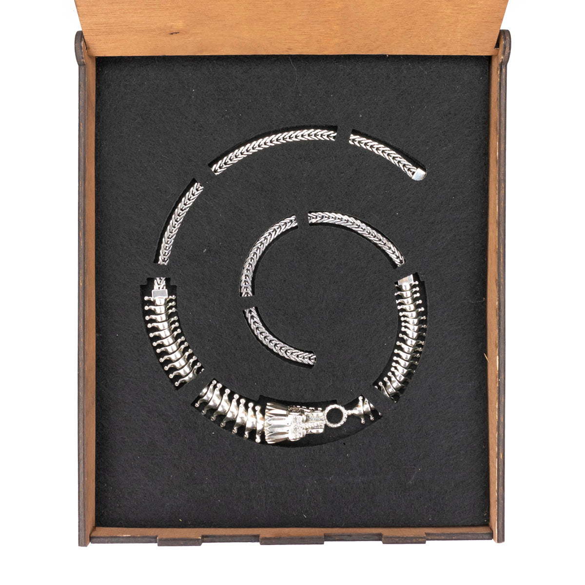 Hermoso collar de plata .925 con detalle articulado de múltiples eslabones y cadena finamente tejida, desarrollado por nuestro equipo en colaboración con Zanfeld.