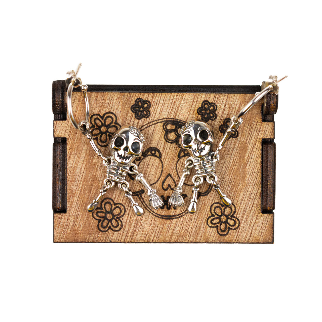 Par de aretes en forma de calavera, simulando que cuelga de tu oreja. De la mano de ¡Ay Güey! esta Colección es presentada por Zanfeld, taller platero con mas de 30 años de experiencia, ubicado en el pueblo mágico de Taxco de Alarcón. Seis generaciones de joyeros han perfeccionado la técnica para obtener joyas de plata de la más alta calidad, sin perder la tradición artesanal. Apasionados por crear y elaborar piezas únicas que reflejen el esmero y cuidado en cada pieza que nace de sus expertas manos. Incluye caja de madera grabada.