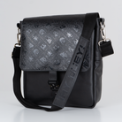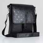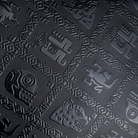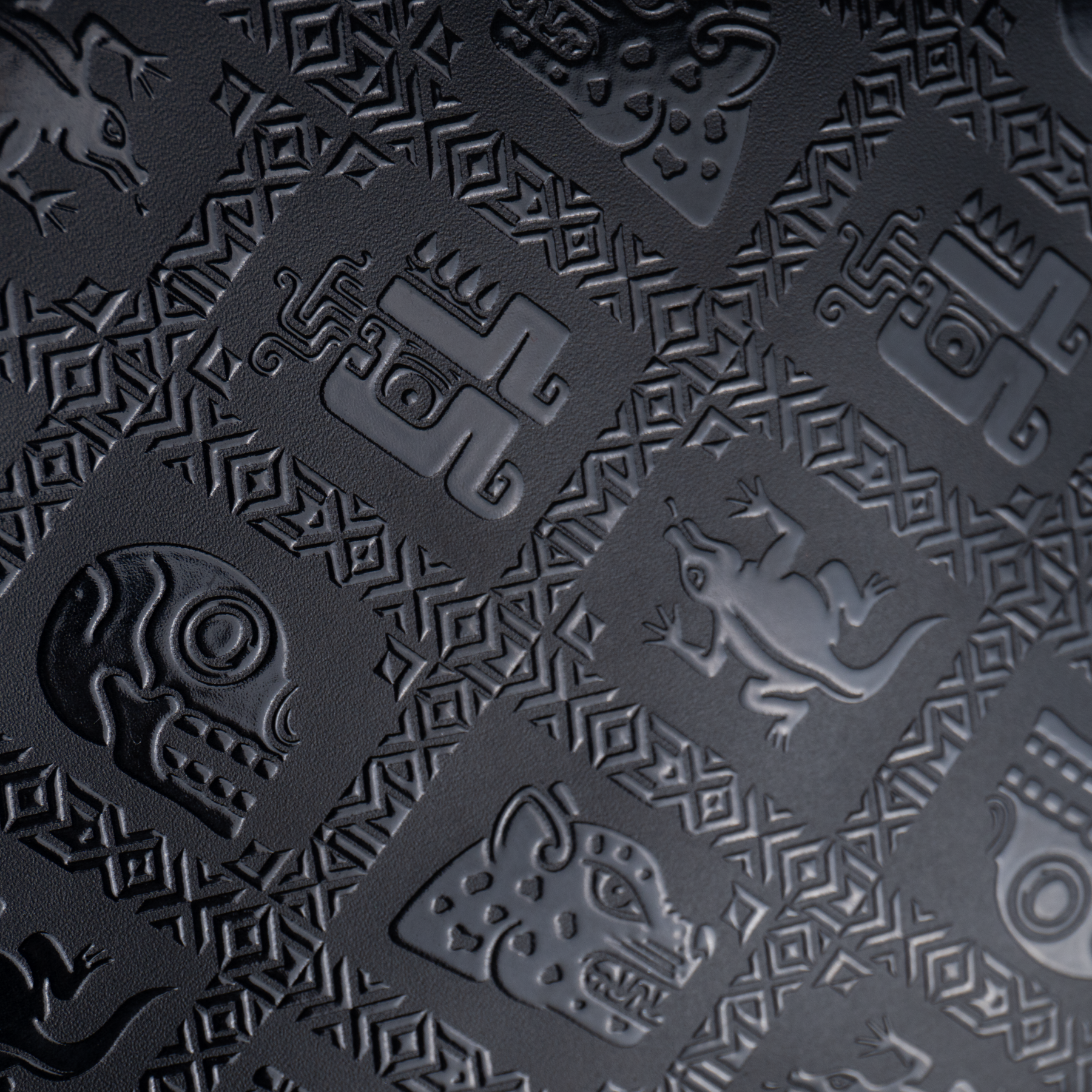 Bolsa mensajera de piel con aplicación de barniz a relieve, que destaca un patrón de figuras aztecas.