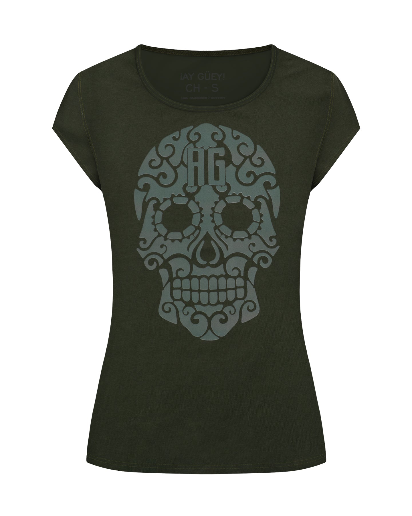 Esta playera de corte femenino combina la tendencia minimalista con un profundo guiño a la cultura mexicana. El diseño de calavera en relieve tono sobre tono (mismo color) es un detalle sofisticado para quienes prefieren llevar sus símbolos con sutileza.