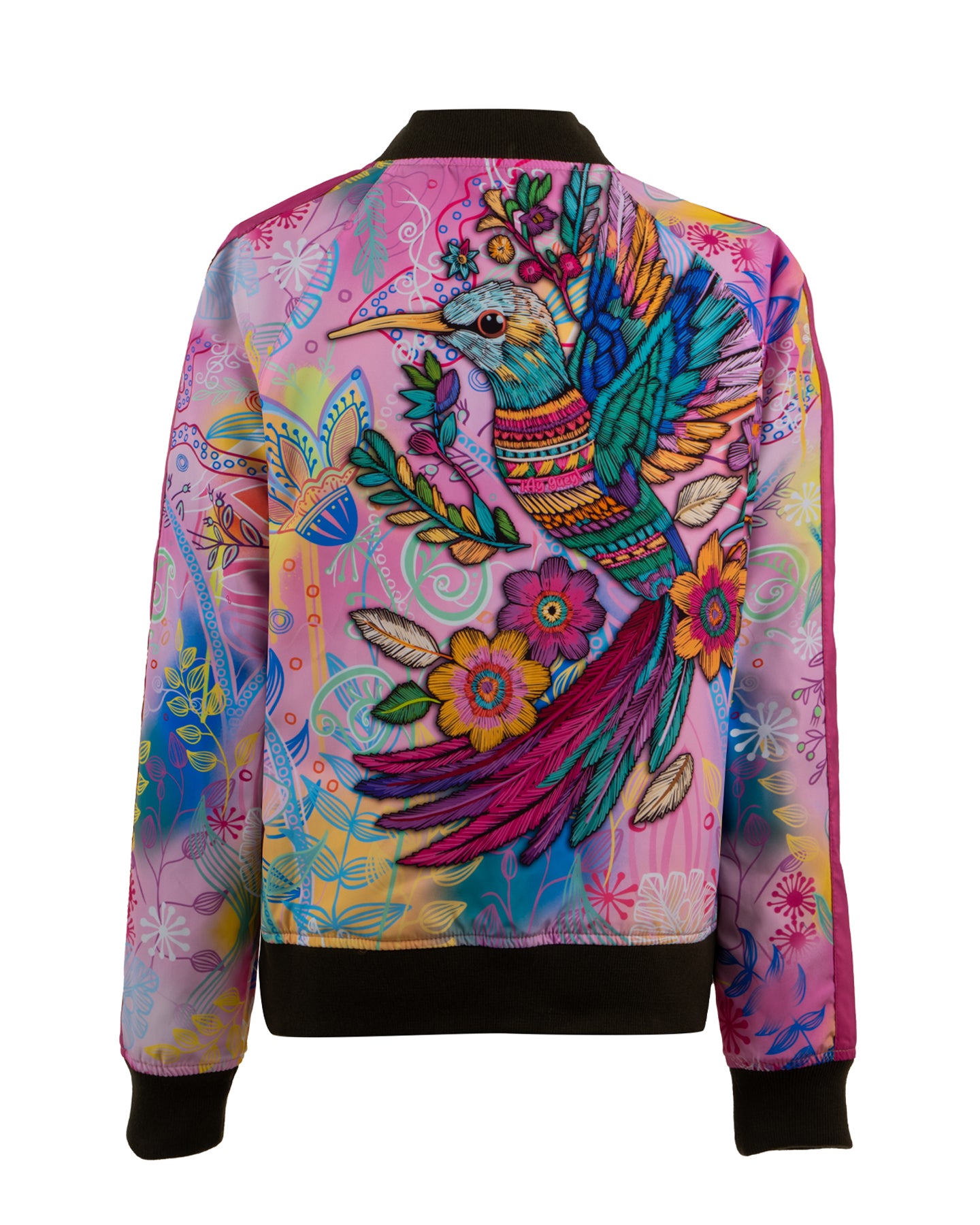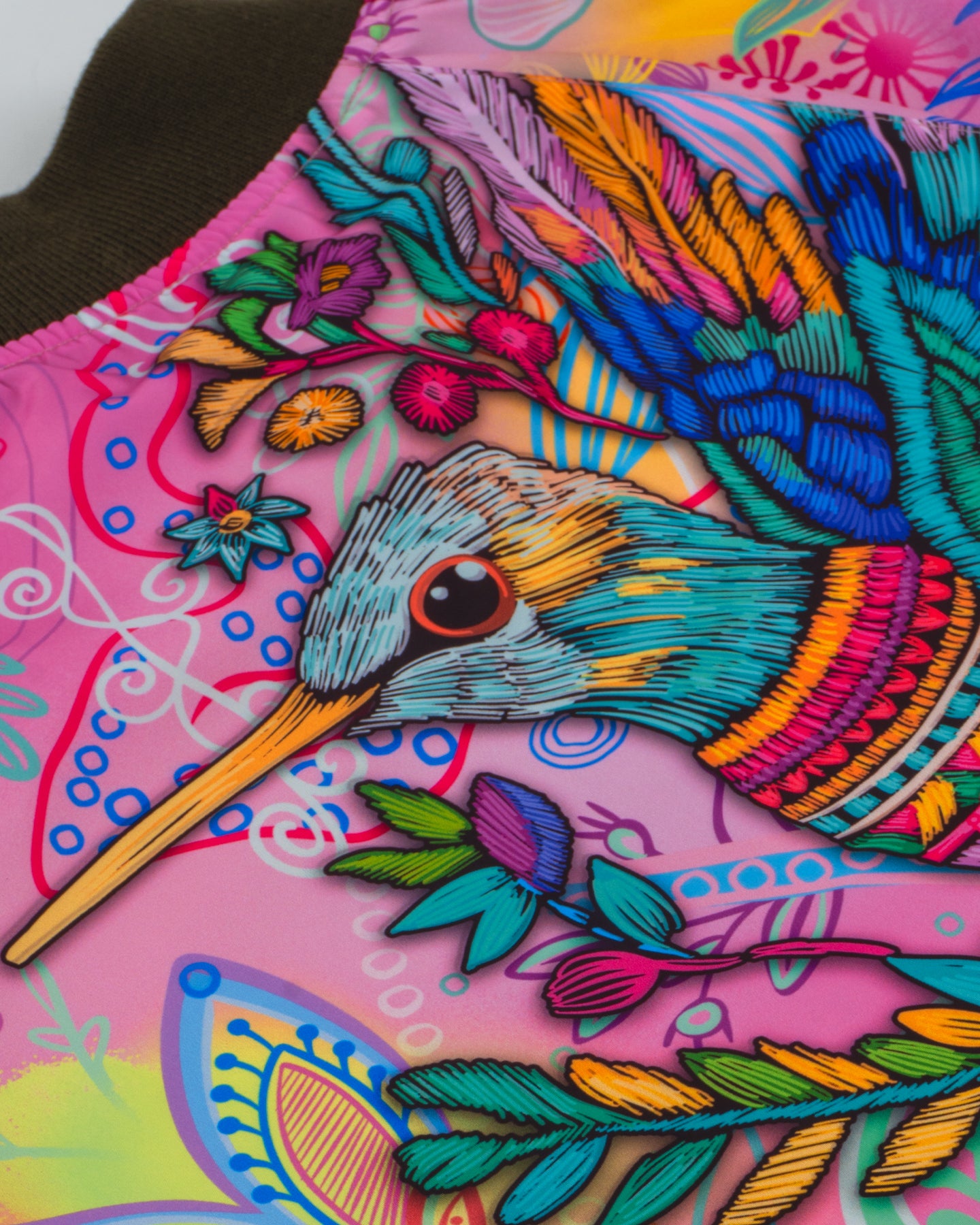 Vista 1: Estampado vibrante de motivos florales y botánicos en tonos shocking. El reverso destaca con un impresionante bordado de colibrí de cola larga, ricamente detallado.