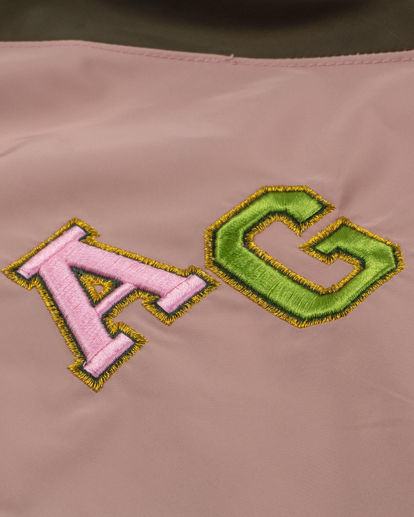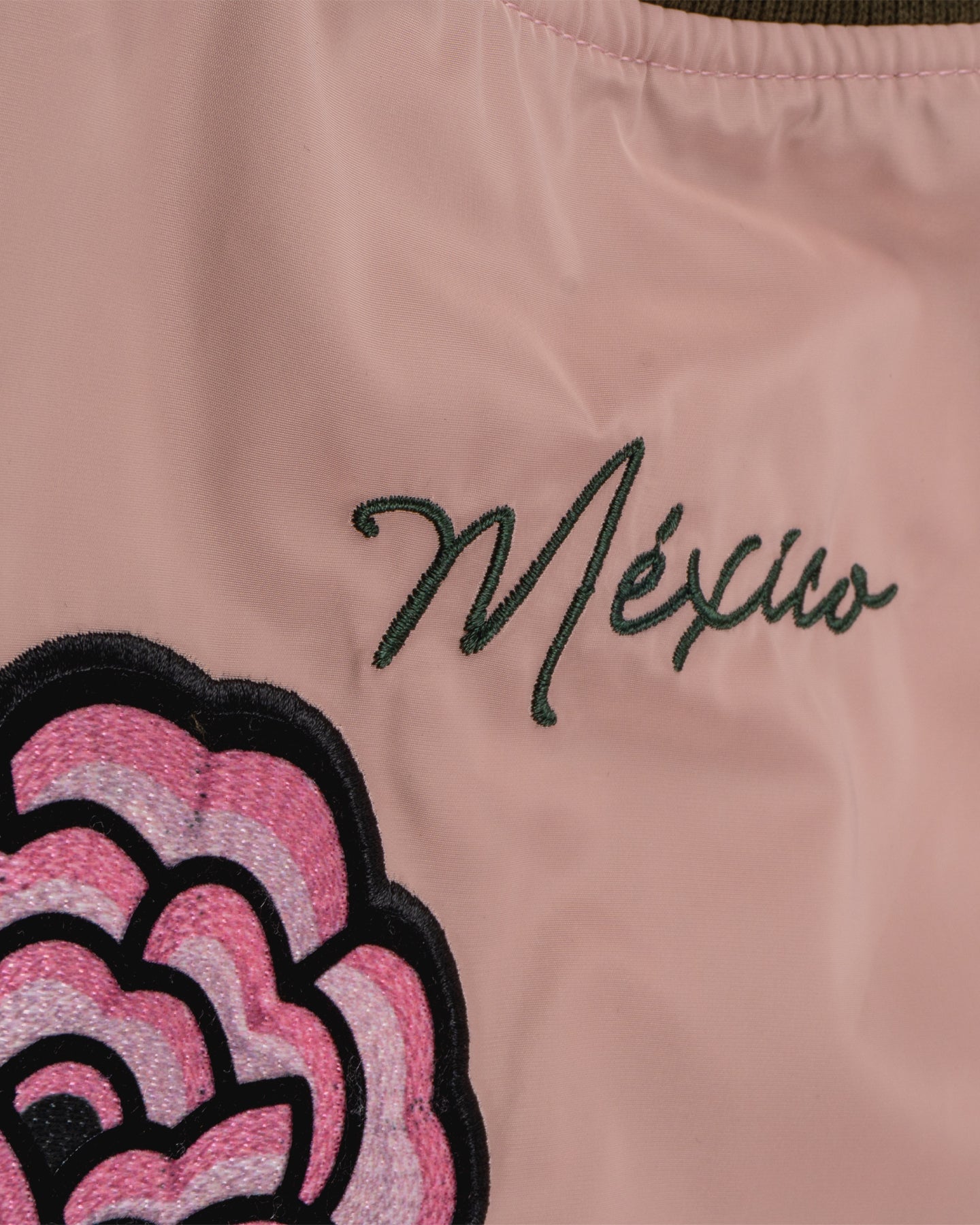 Vista 2: Estilo varsity en rosa palo y mangas verde olivo. El reverso presenta delicados bordados de rosas y la palabra "México", ofreciendo un look más discreto pero igualmente chic.